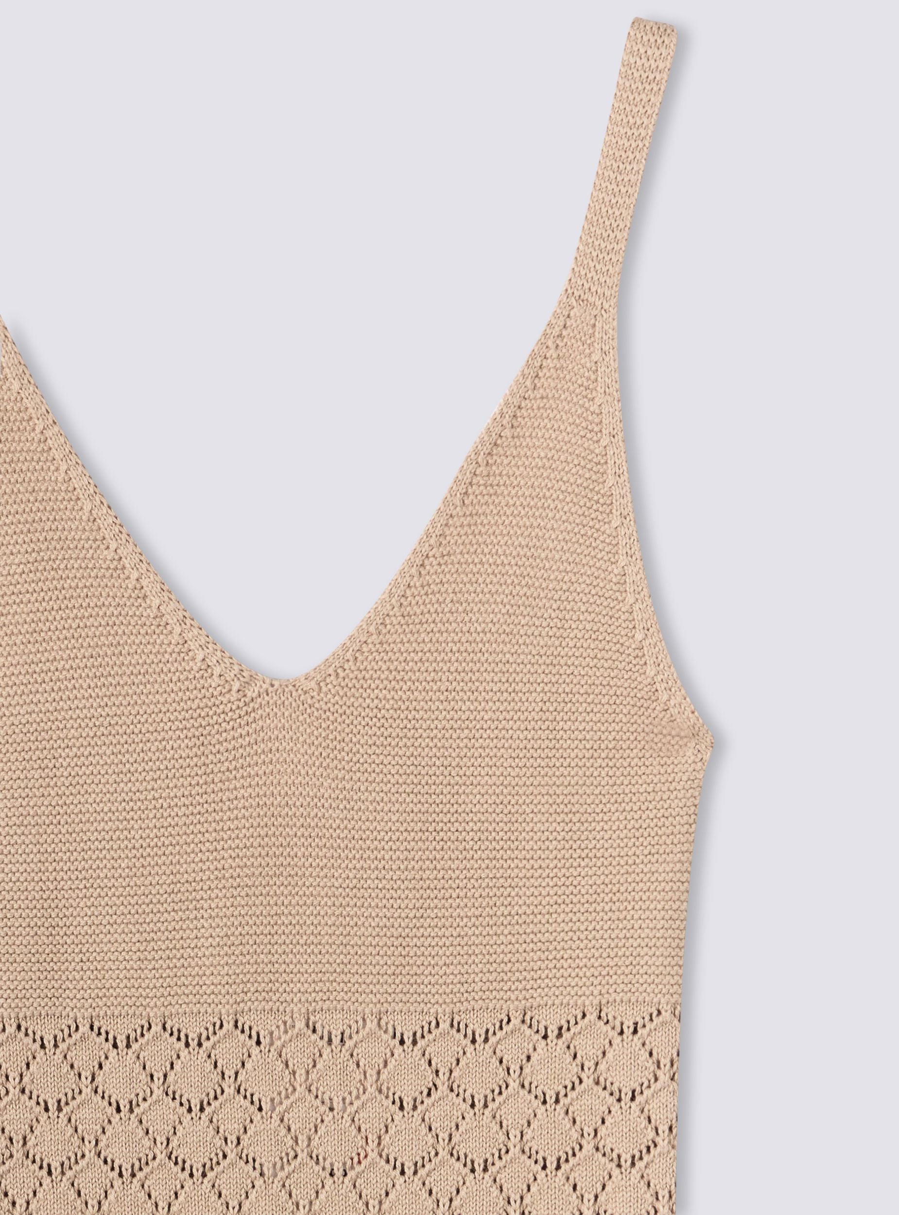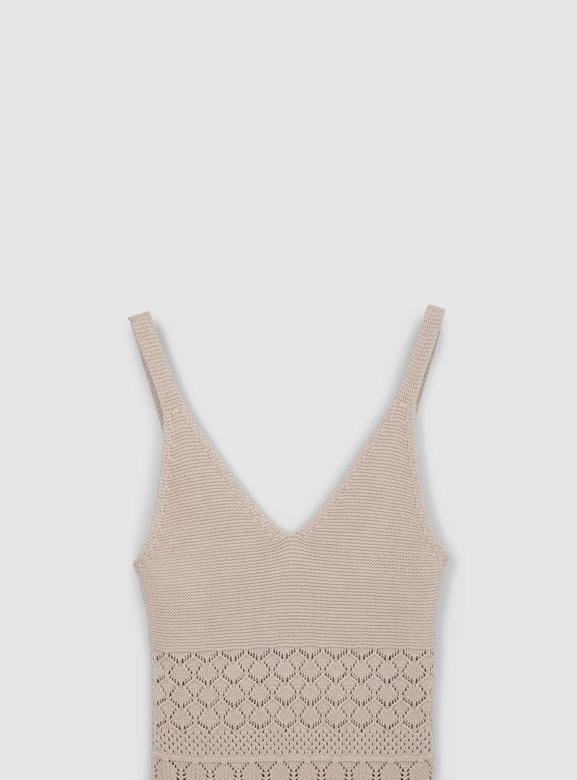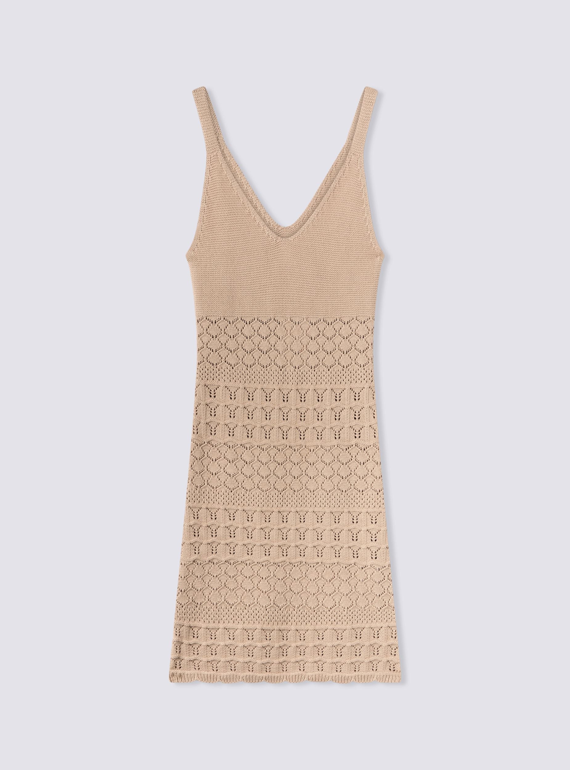 Abito da donna corto in maglia traforata, perfetto per un look estivo femminile e versatile. Il design a tinta unita con spalline sottili valorizza la silhouette, mentre la lavorazione traforata aggiunge un tocco sofisticato. Ideale come copricostume in spiaggia o per un'uscita serale con sandali e accessori minimal. Perfetto anche con una giacca leggera per uno stile casual chic.