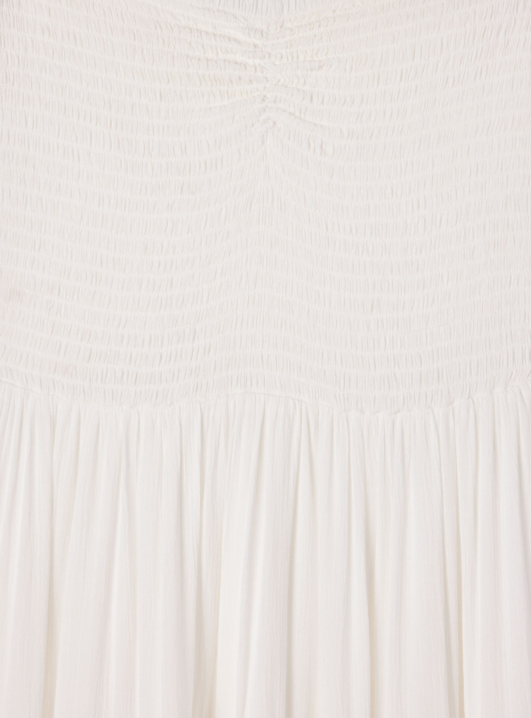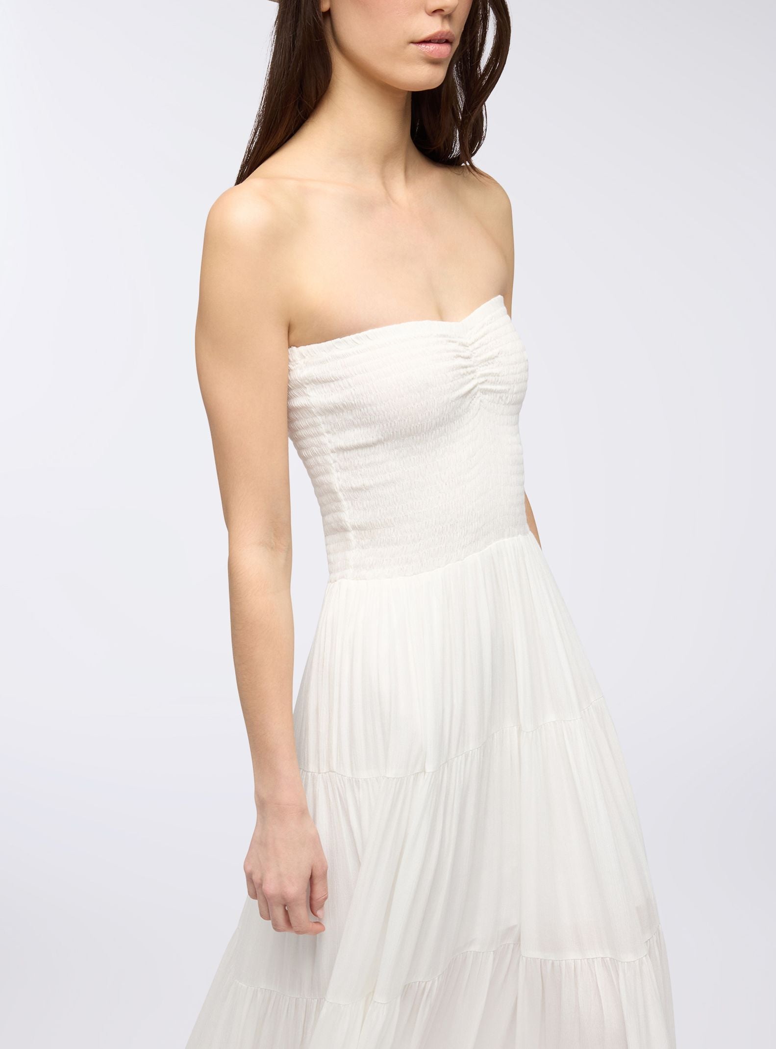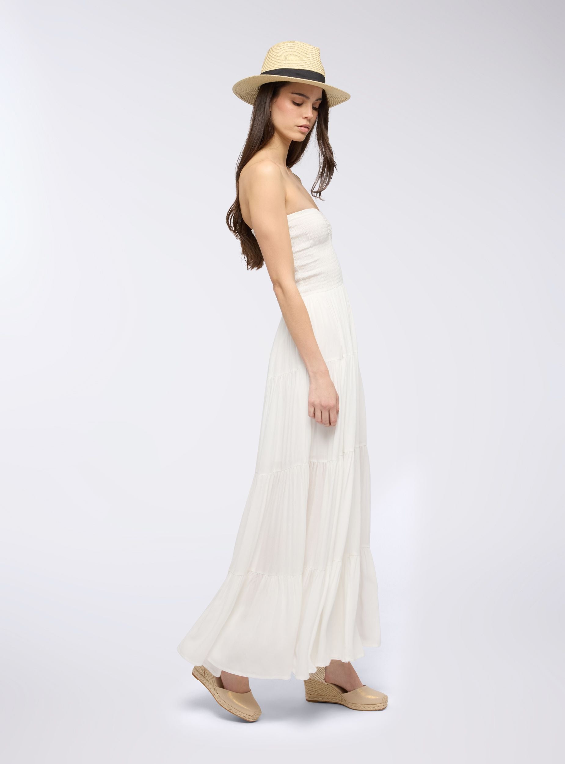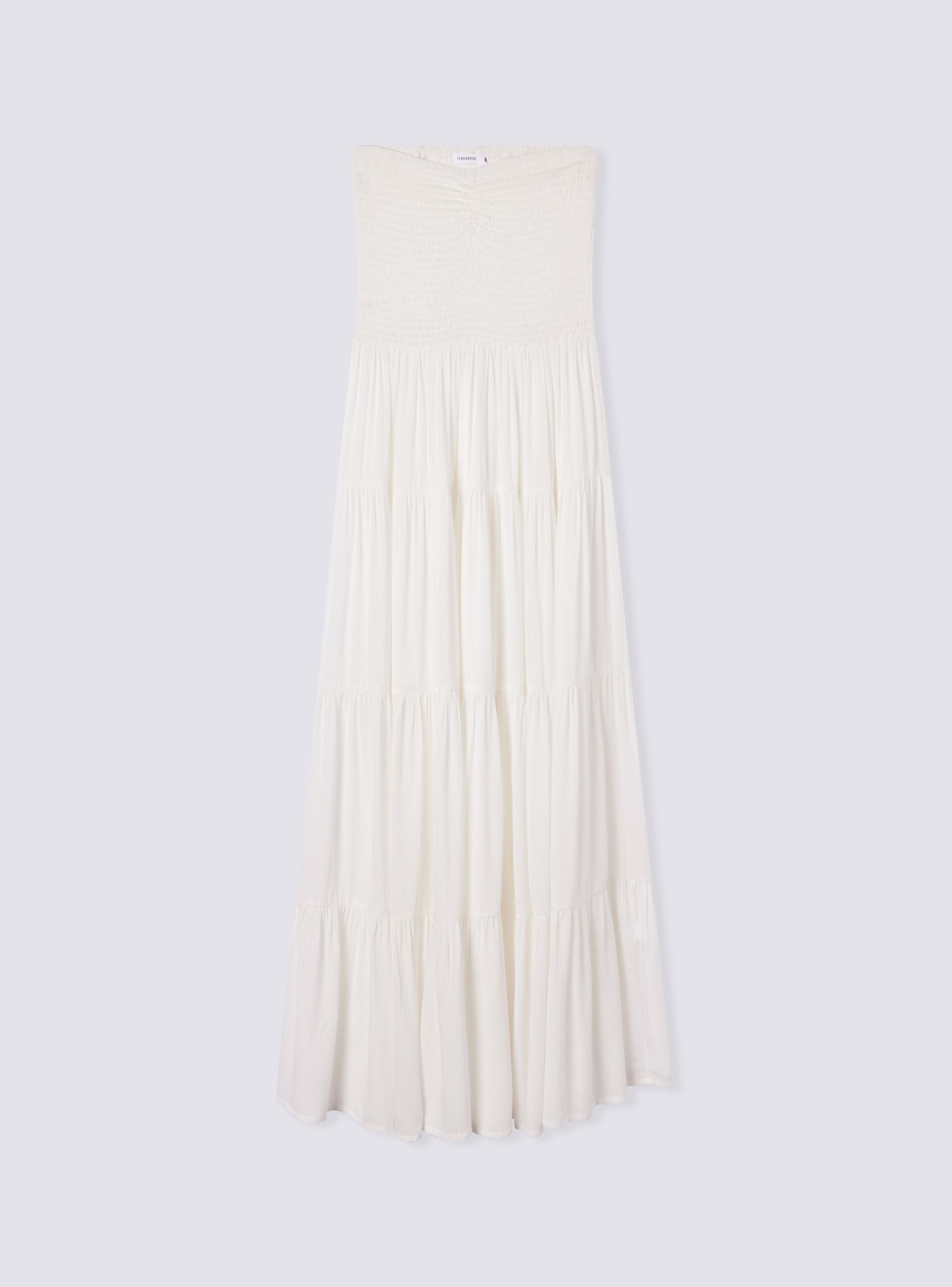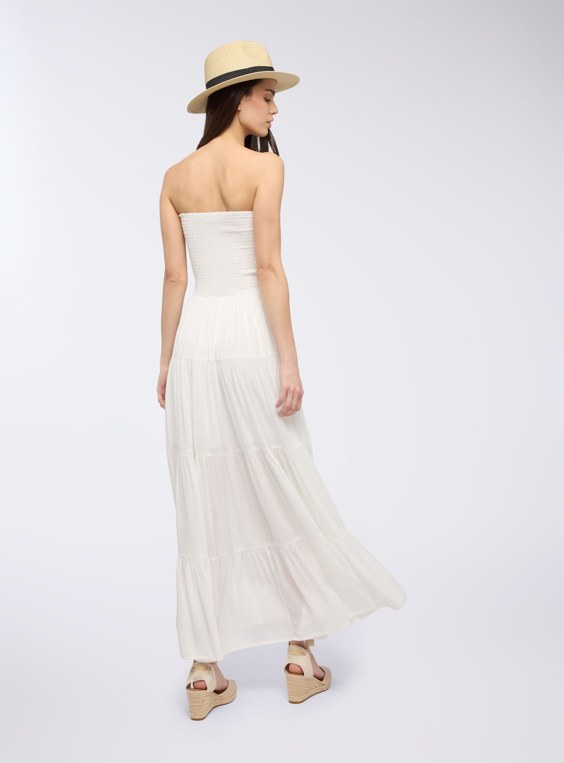 Abito da donna lungo e senza spalline, perfetto per un look femminile e raffinato. Il corpetto con lavorazione a punto smock garantisce una vestibilità aderente e confortevole, mentre la gonna a balze aggiunge movimento e un tocco boho-chic. Ideale per le giornate estive, si abbina facilmente a sandali bassi per un look da giorno o a zeppe e accessori dorati per un'uscita serale.Dettagli