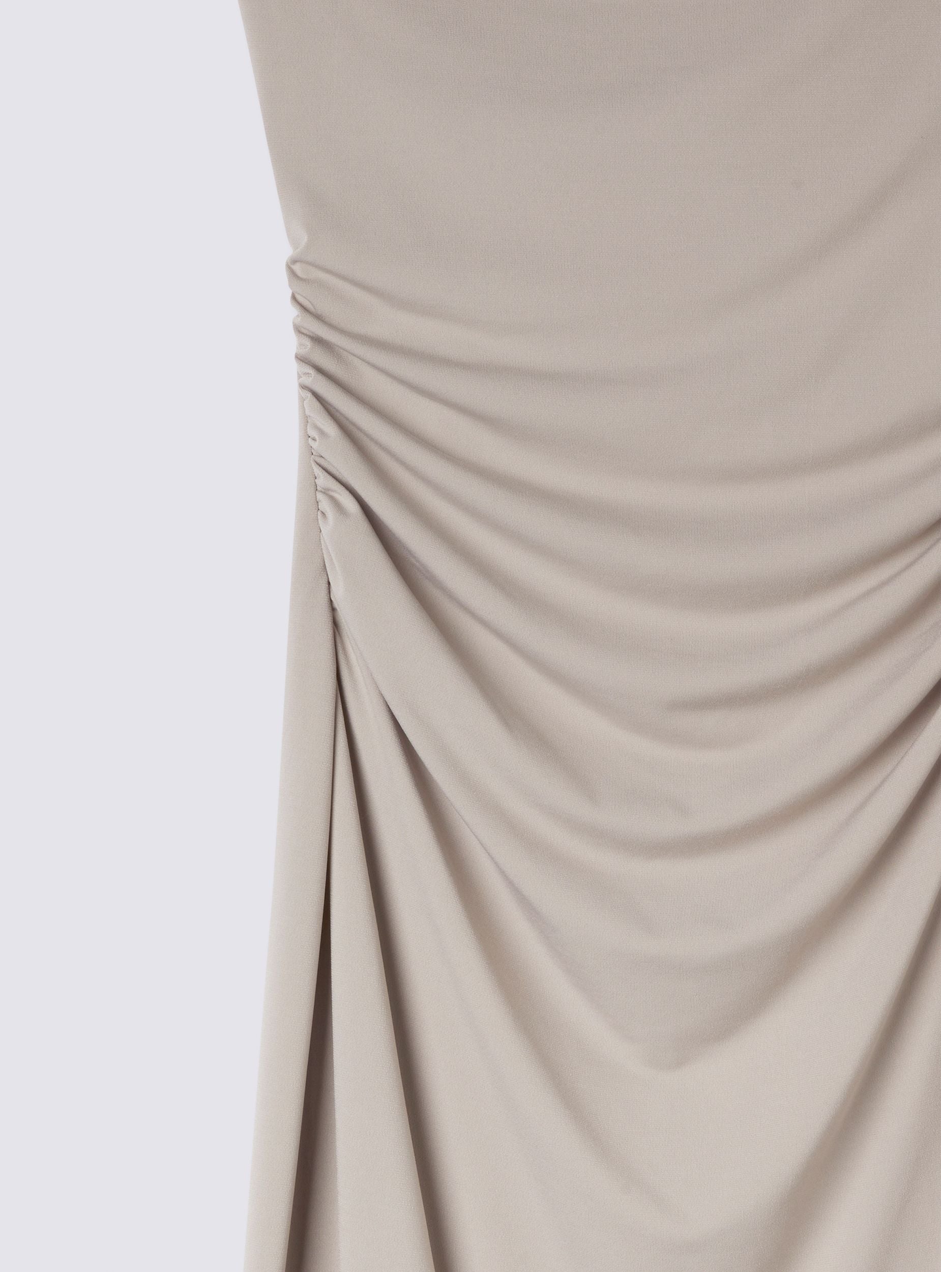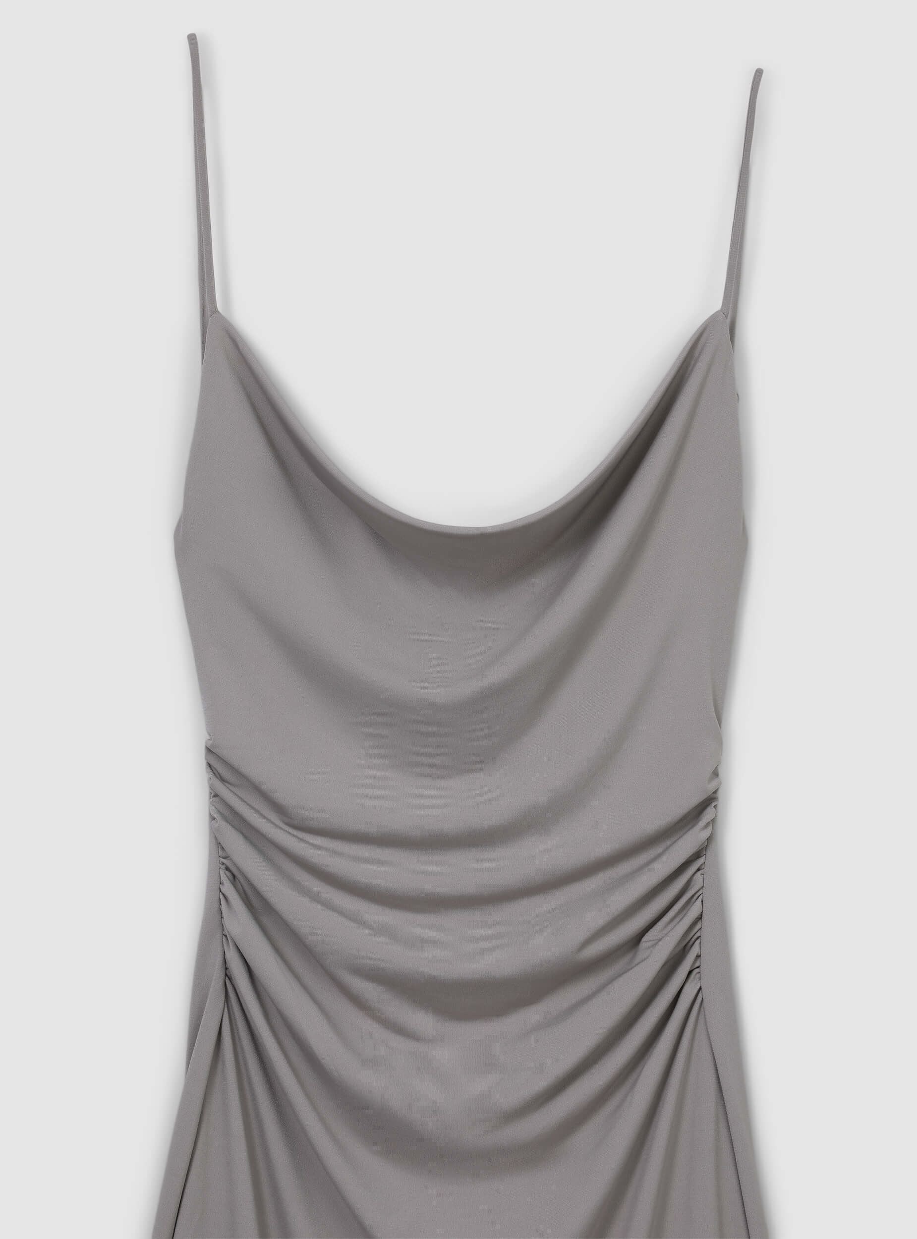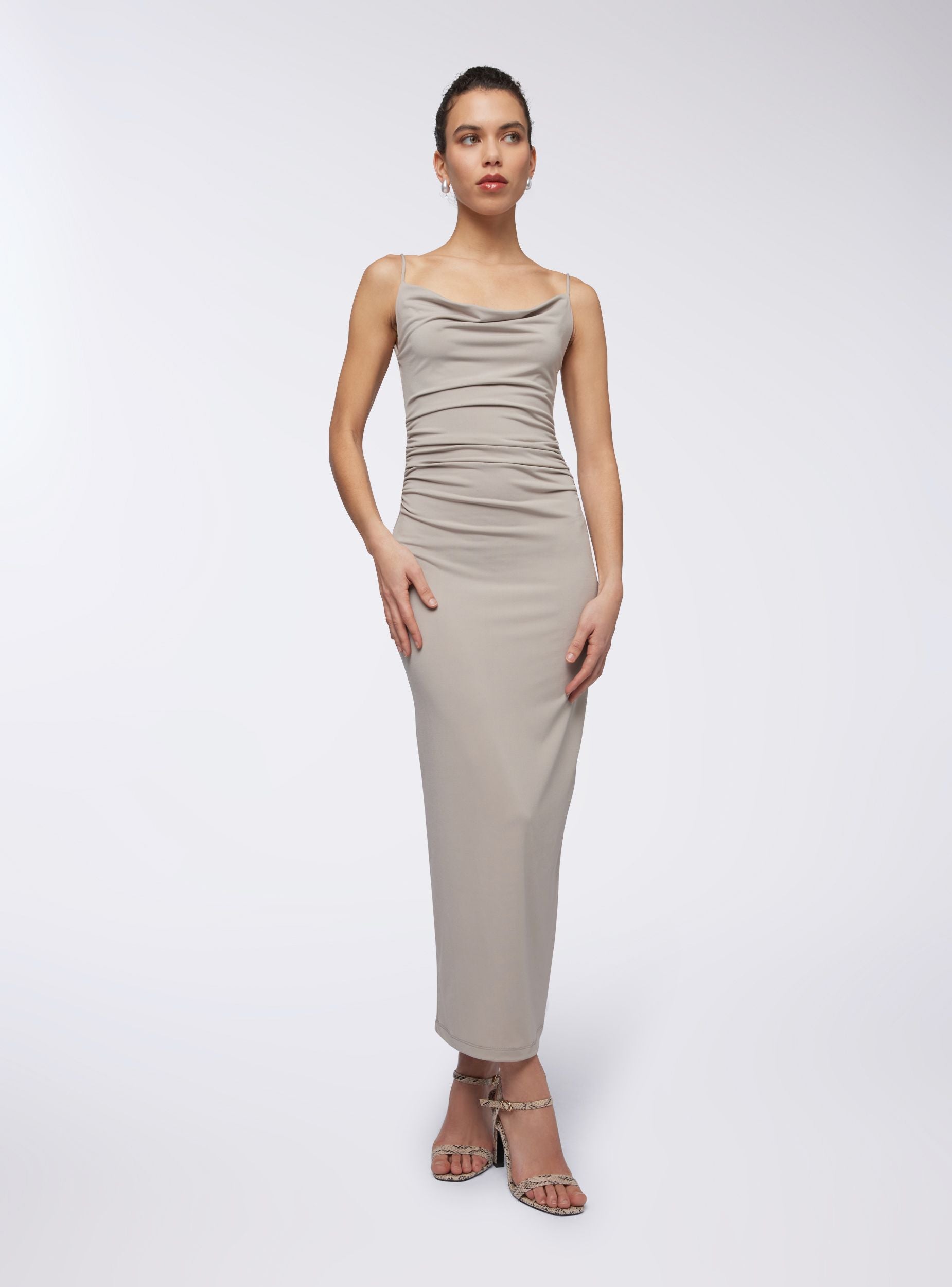 Abito da donna elegante e raffinato, perfetto per le serate estive. Realizzato in tinta unita, presenta una silhouette lunga e sinuosa che valorizza la figura. Il dettaglio a gronda sullo scollo aggiunge un tocco di sofisticatezza, mentre le spalline regolabili assicurano una vestibilità comoda e personalizzata. Lo spacco discreto sul retro dona movimento e femminilità al capo, rendendolo ideale per un look sensuale e glamour.