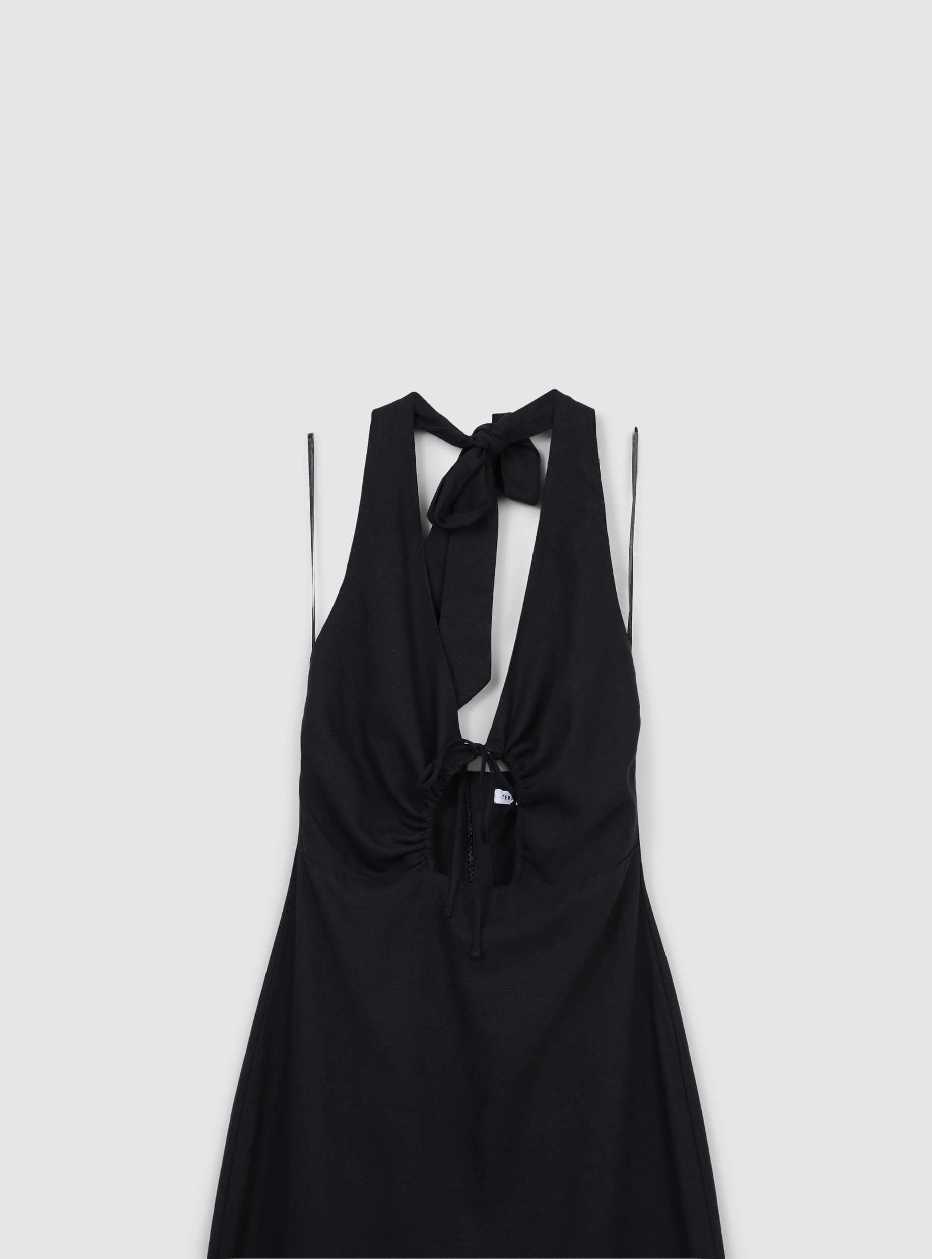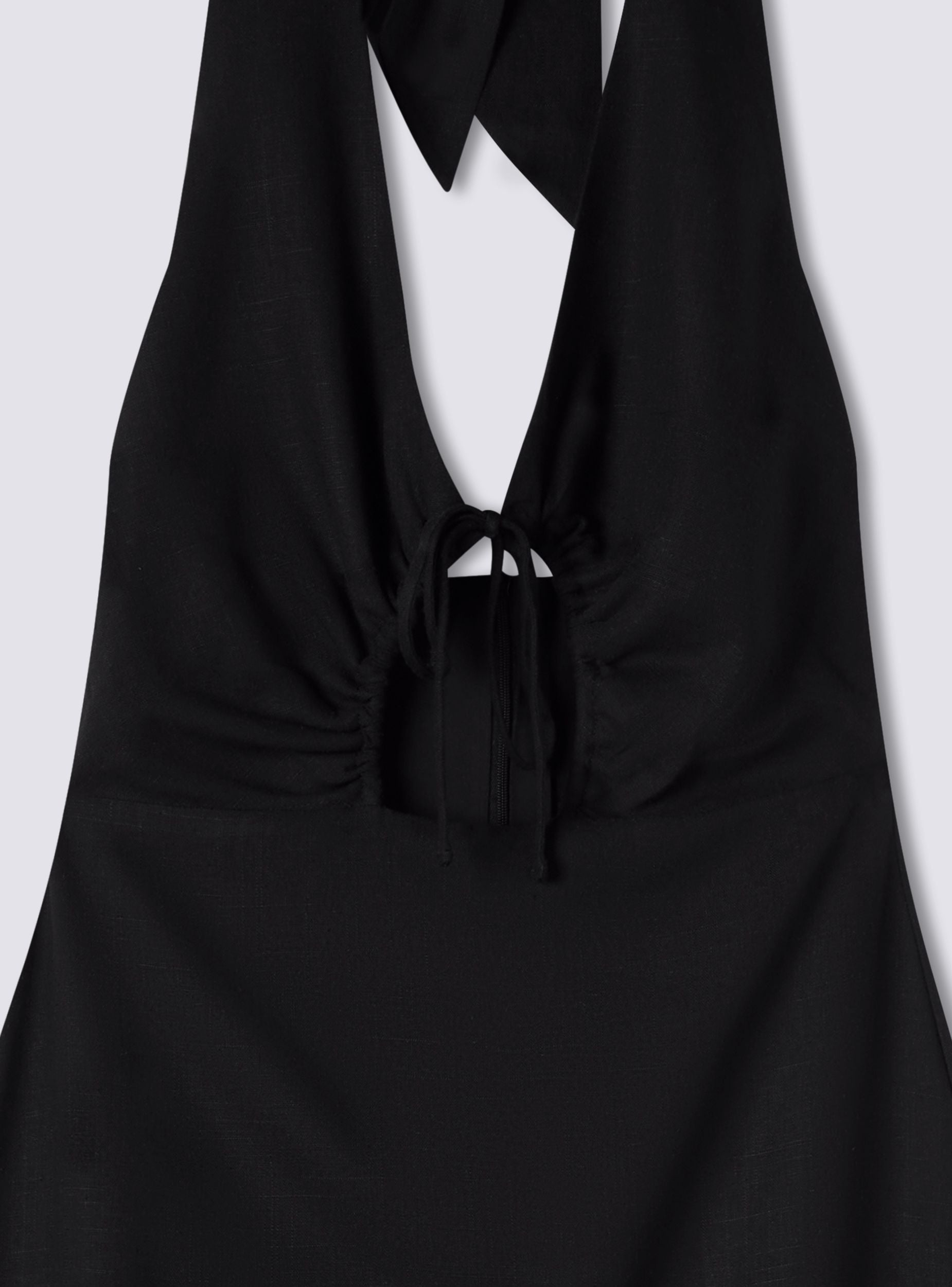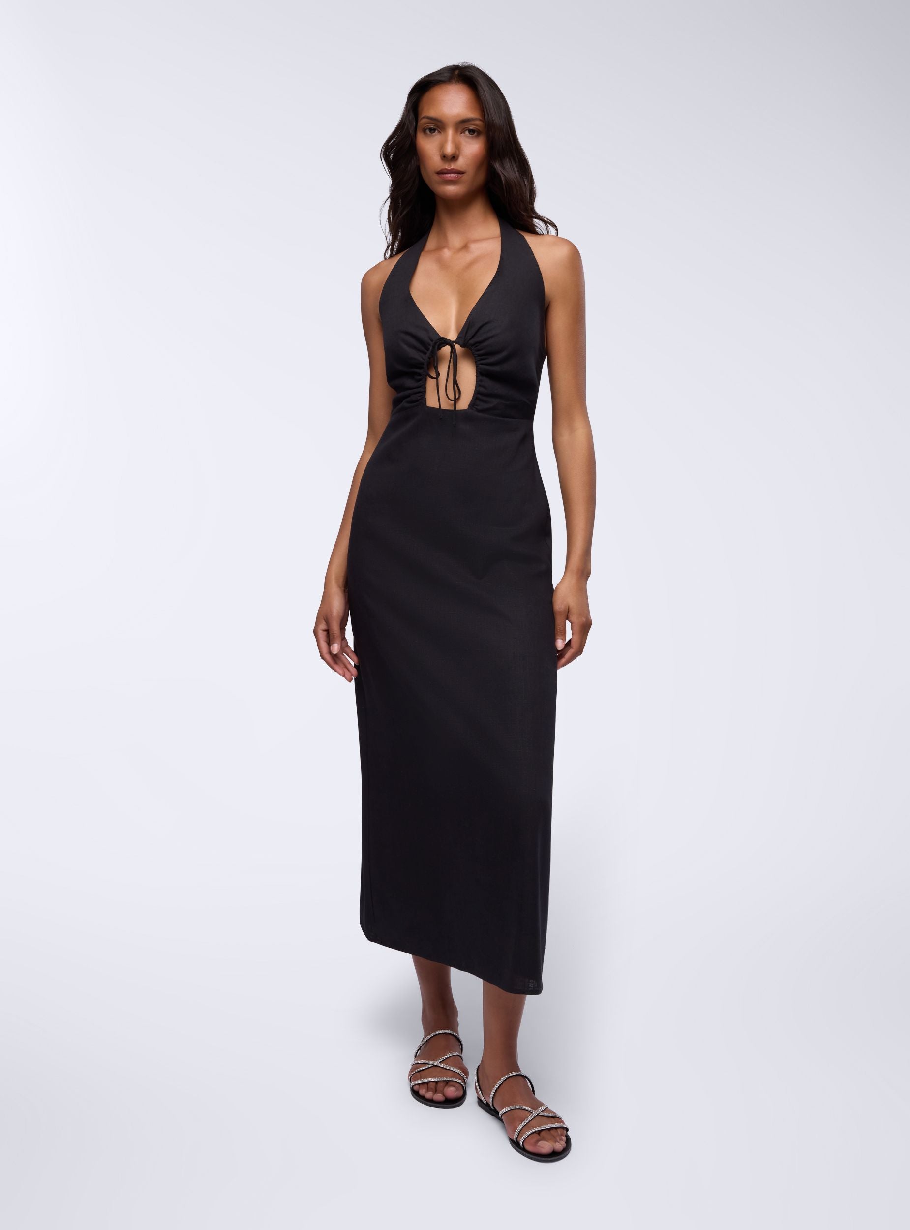 Abito da donna lungo e sofisticato, realizzato in tessuto effetto lino, perfetto per serate eleganti o eventi estivi. Il design halterneck con allacciatura dietro al collo mette in risalto le spalle, mentre lo scollo a V e l'oblò sul davanti aggiungono un tocco di sensualità. Il taglio svasato con spacco sul retro garantisce movimento e comfort. La zip laterale assicura una vestibilità impeccabile, ideale con sandali gioiello o tacchi alti.
