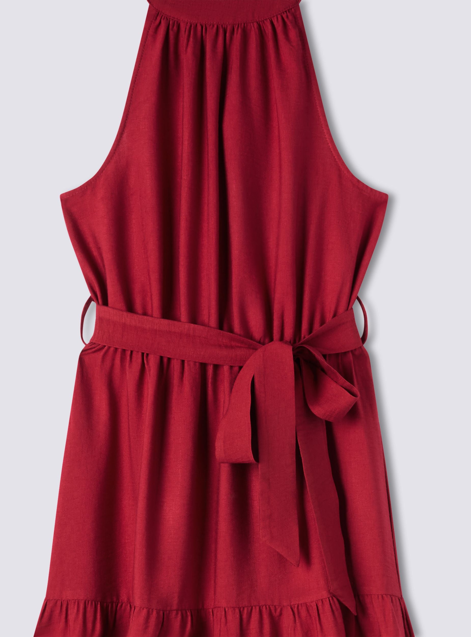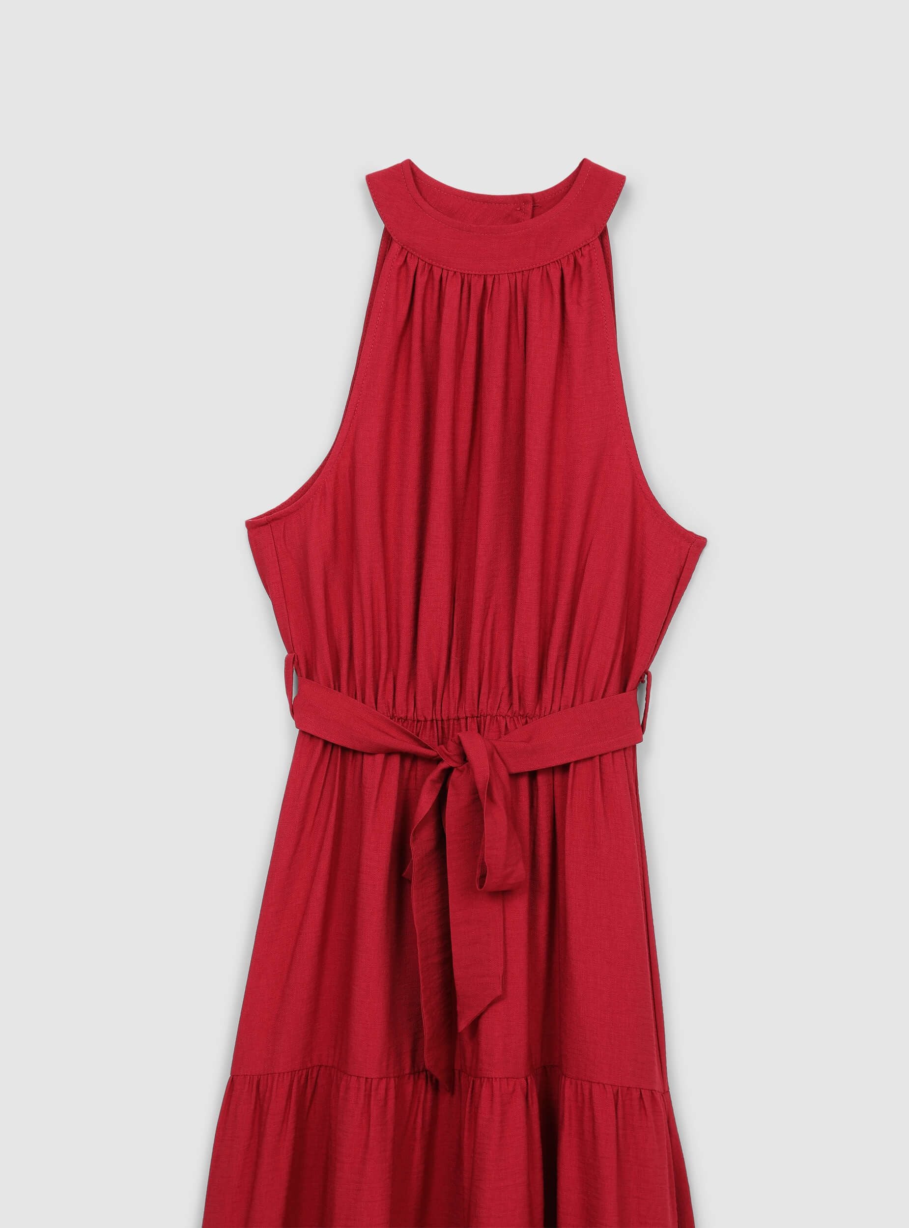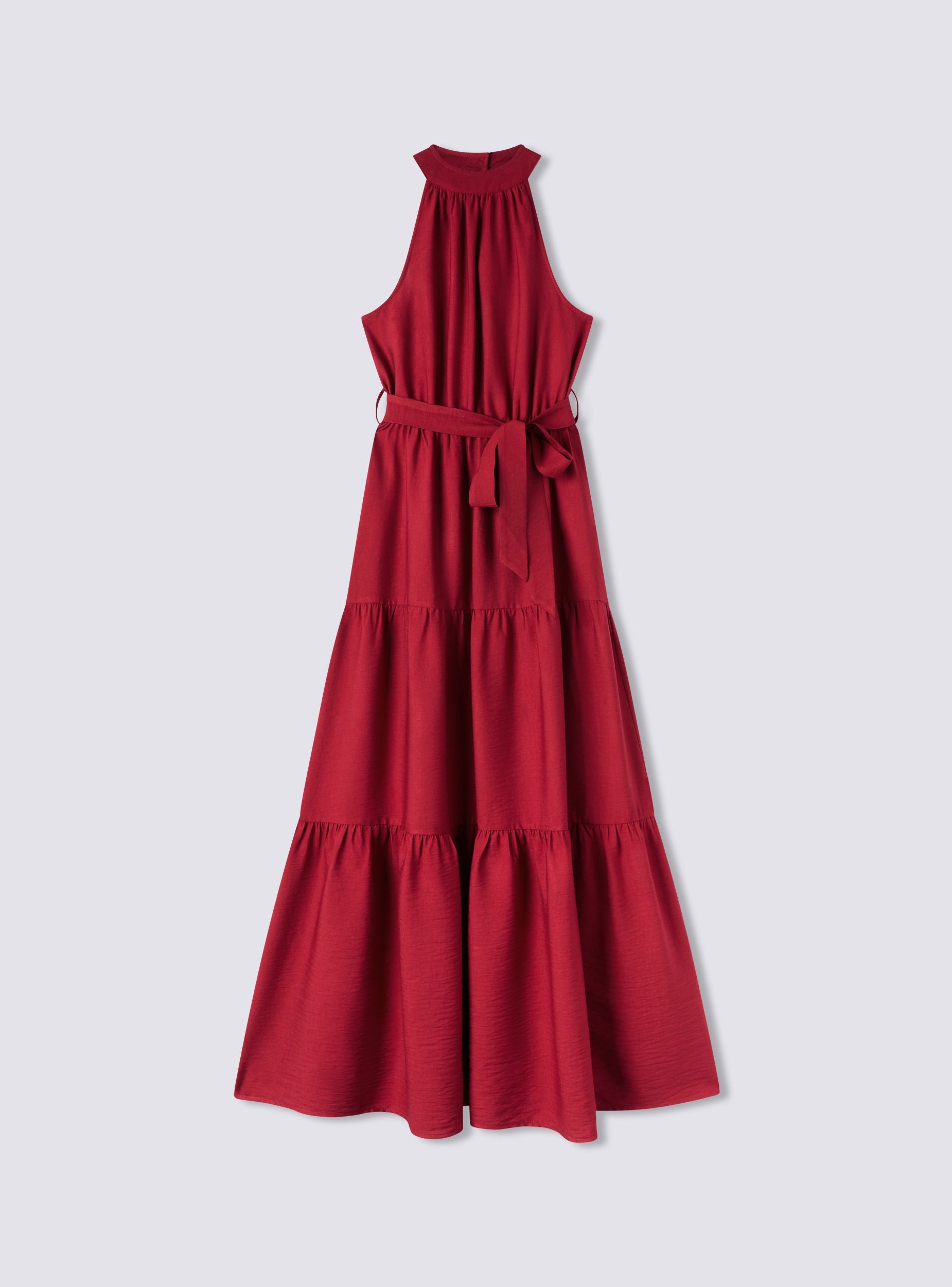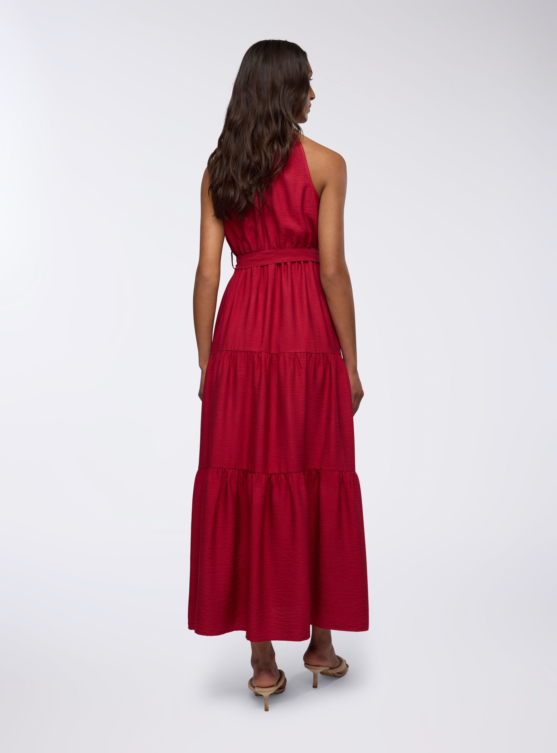 Abito da donna lungo con scollo americano che valorizza le spalle e chiusura con bottoncino dietro al collo. La fusciacca in vita esalta la silhouette, mentre la gonna a balze dona movimento e leggerezza. Perfetto per giornate estive e serate all’aperto, si abbina a sandali bassi per un look casual o a zeppe per un tocco più raffinato. Ideale per eventi informali e vacanze al mare.