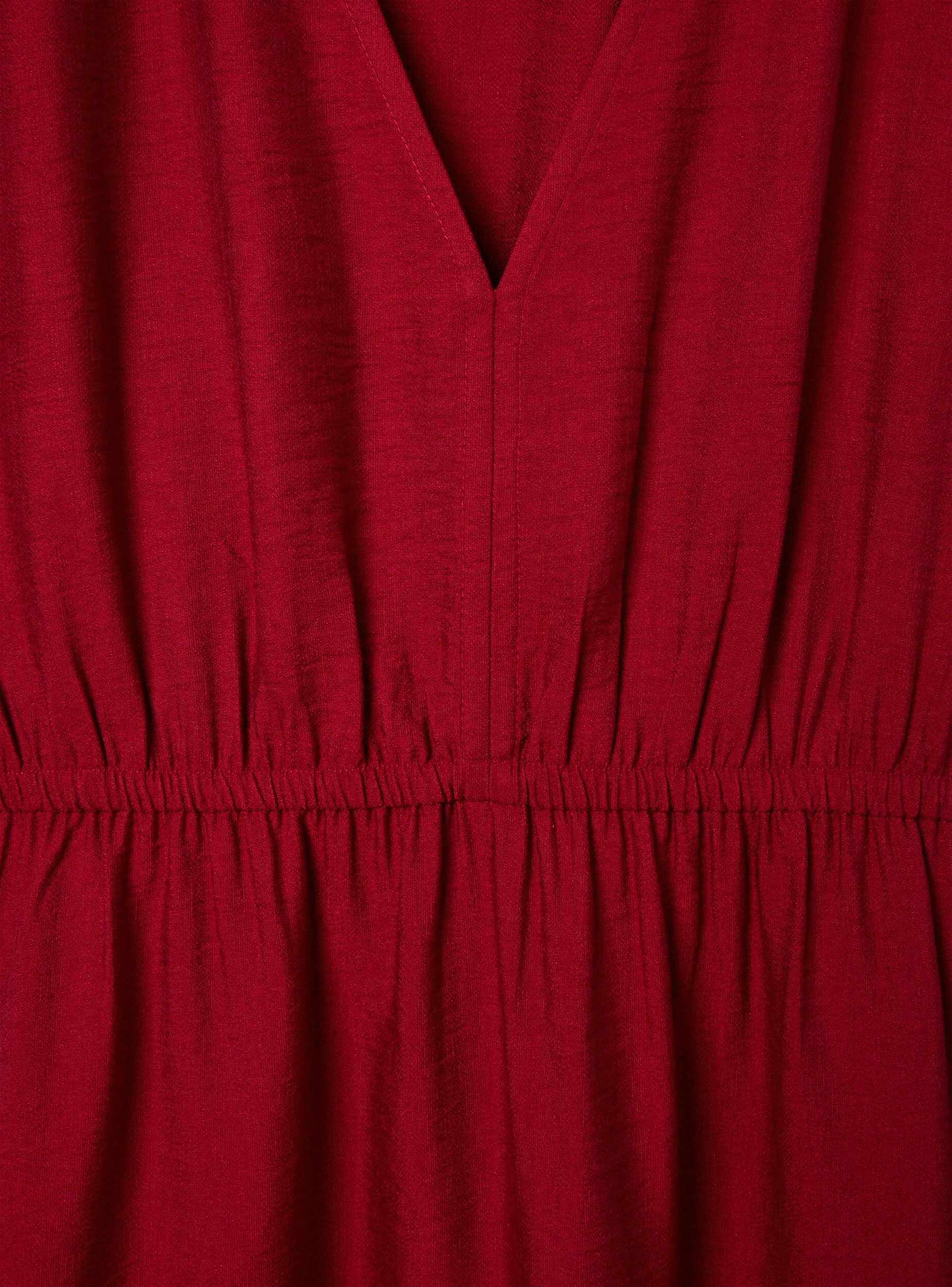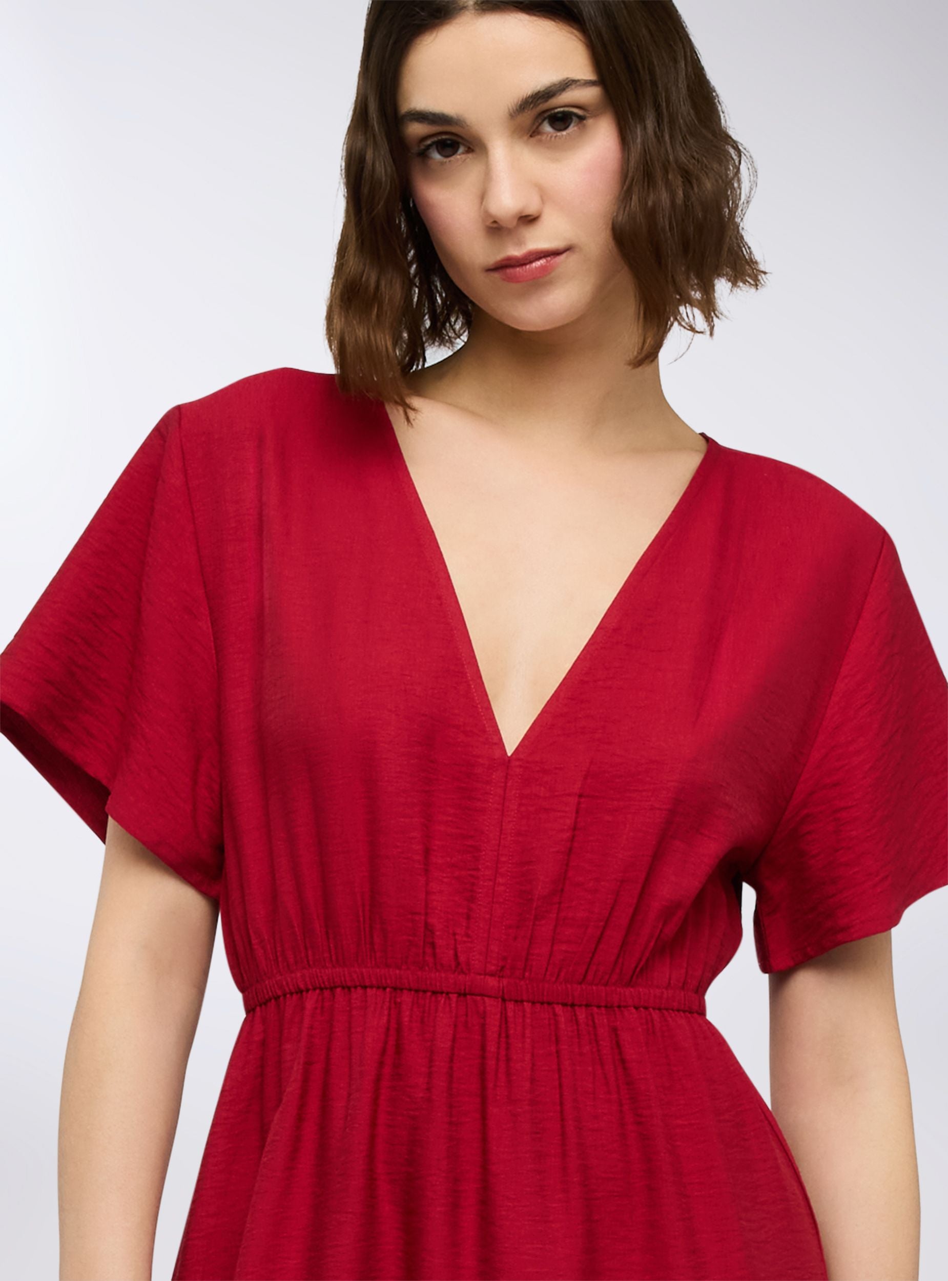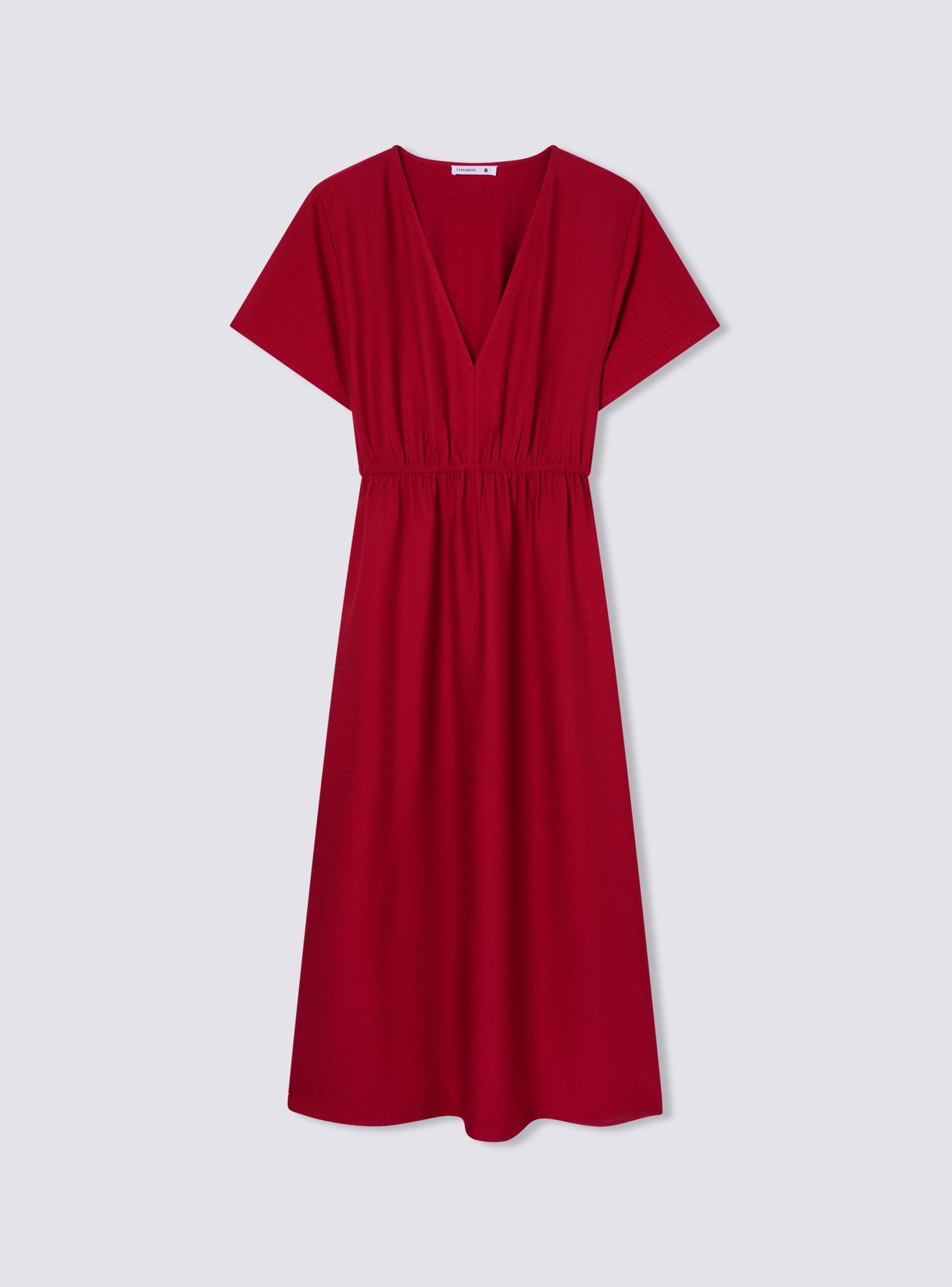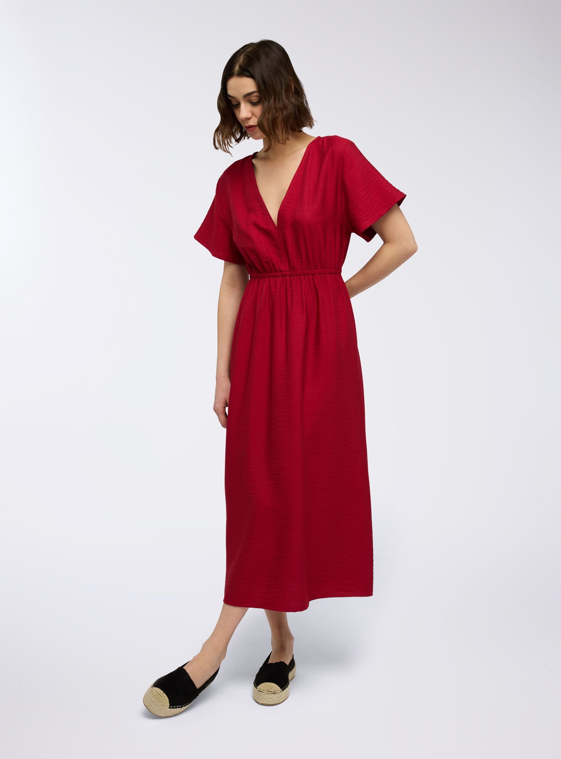 Abito da donna lungo a tinta unita con effetto lino, caratterizzato da una linea svasata che valorizza la figura con eleganza. Lo scollo a V e le maniche corte lo rendono ideale per le giornate estive, perfetto da indossare per una passeggiata in città o una cena all'aperto. Abbinabile a sandali e borsa in paglia per un look boho-chic o a sneakers per un tocco casual raffinato.
