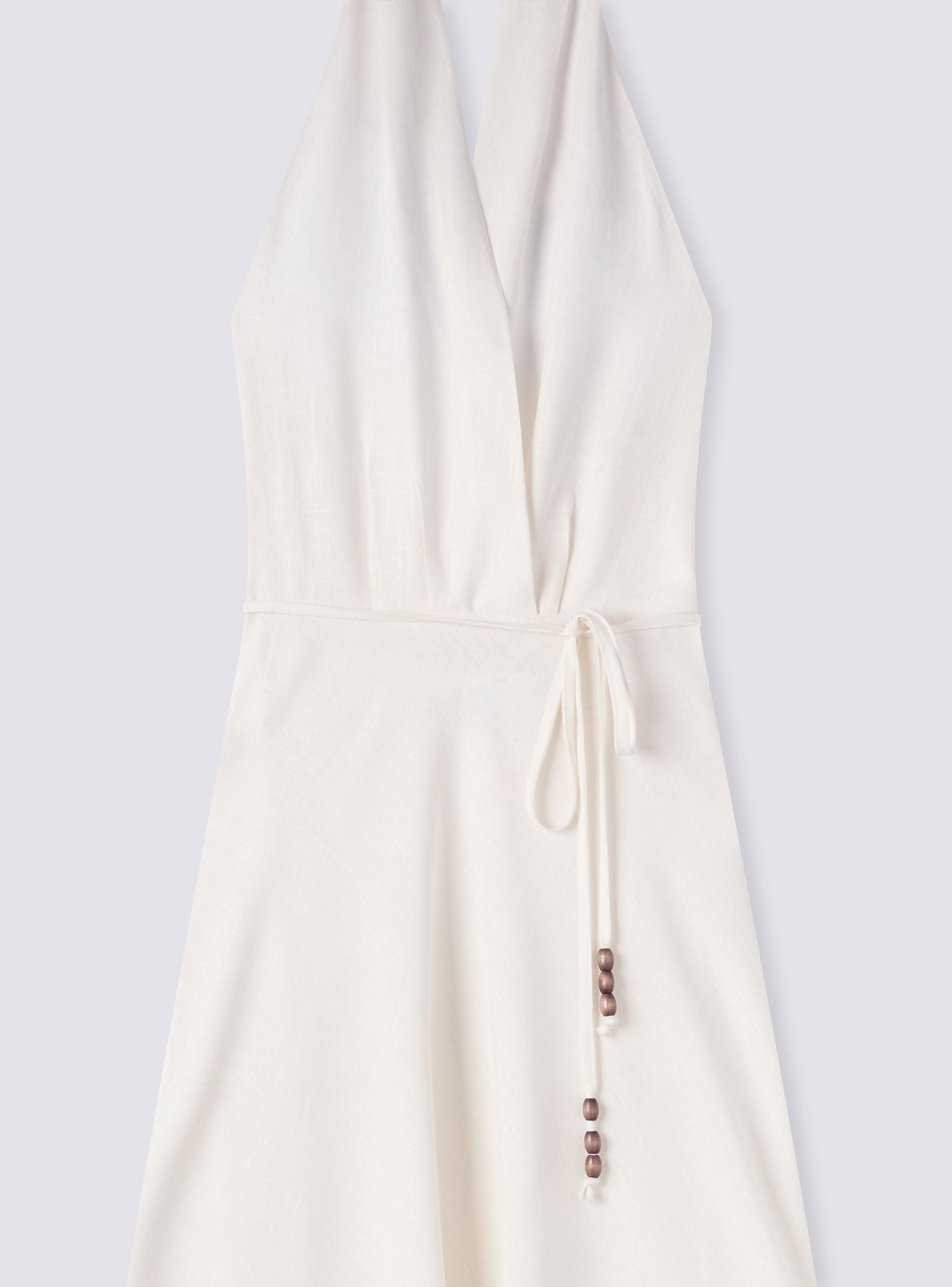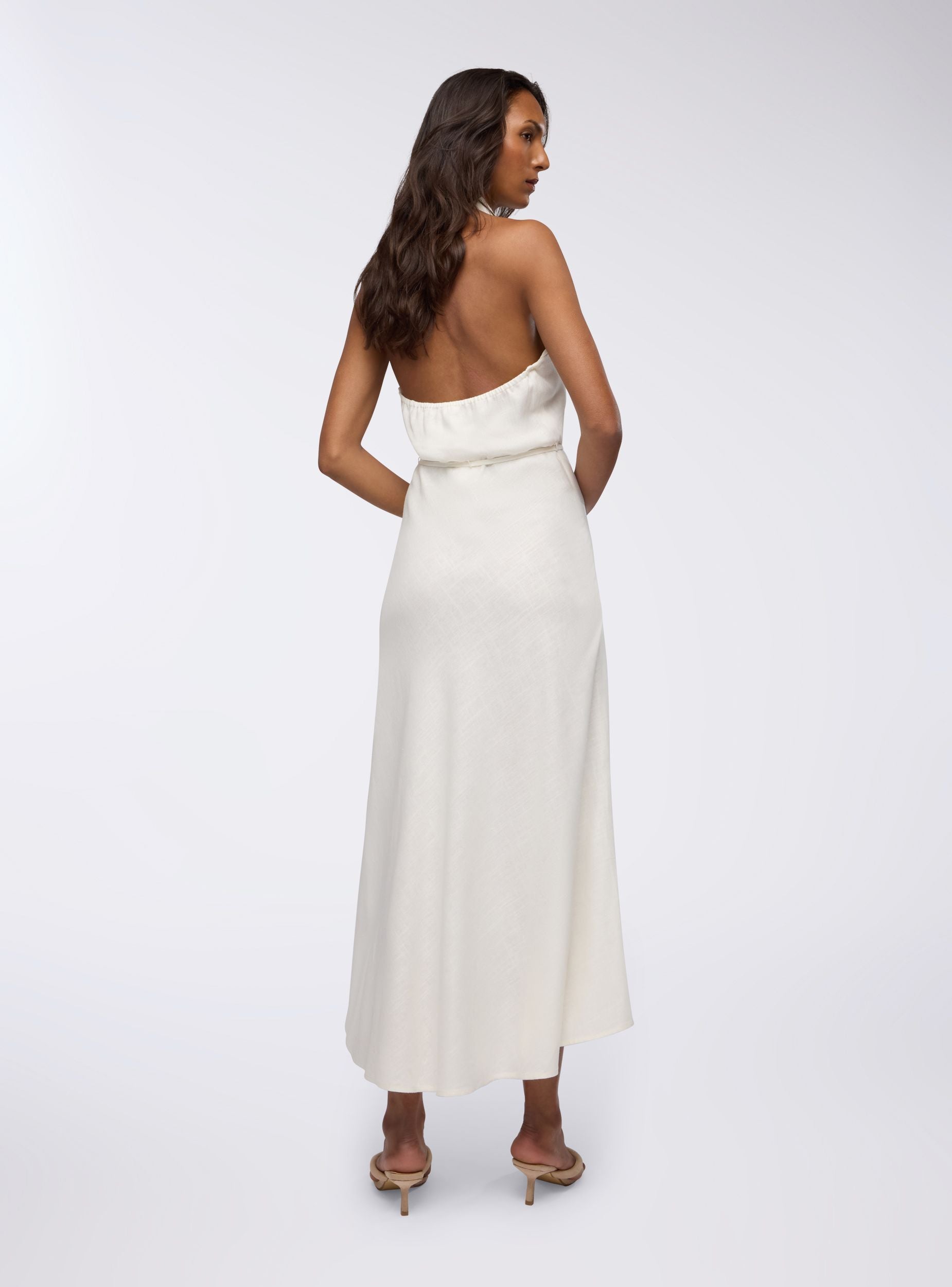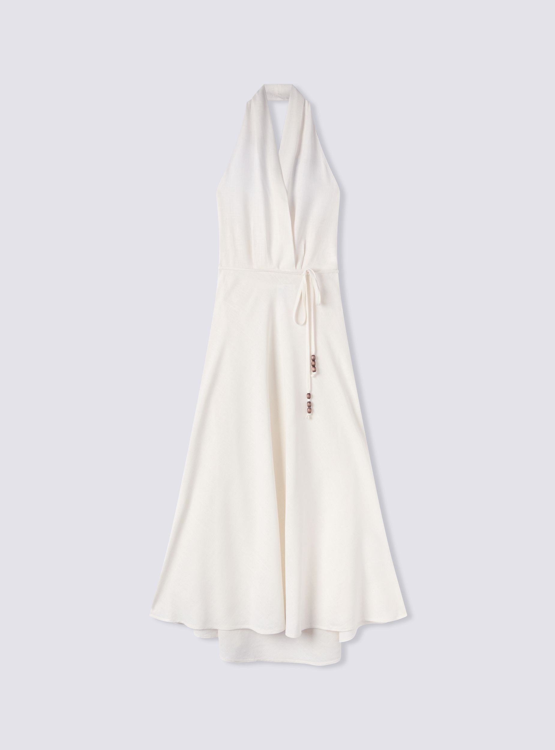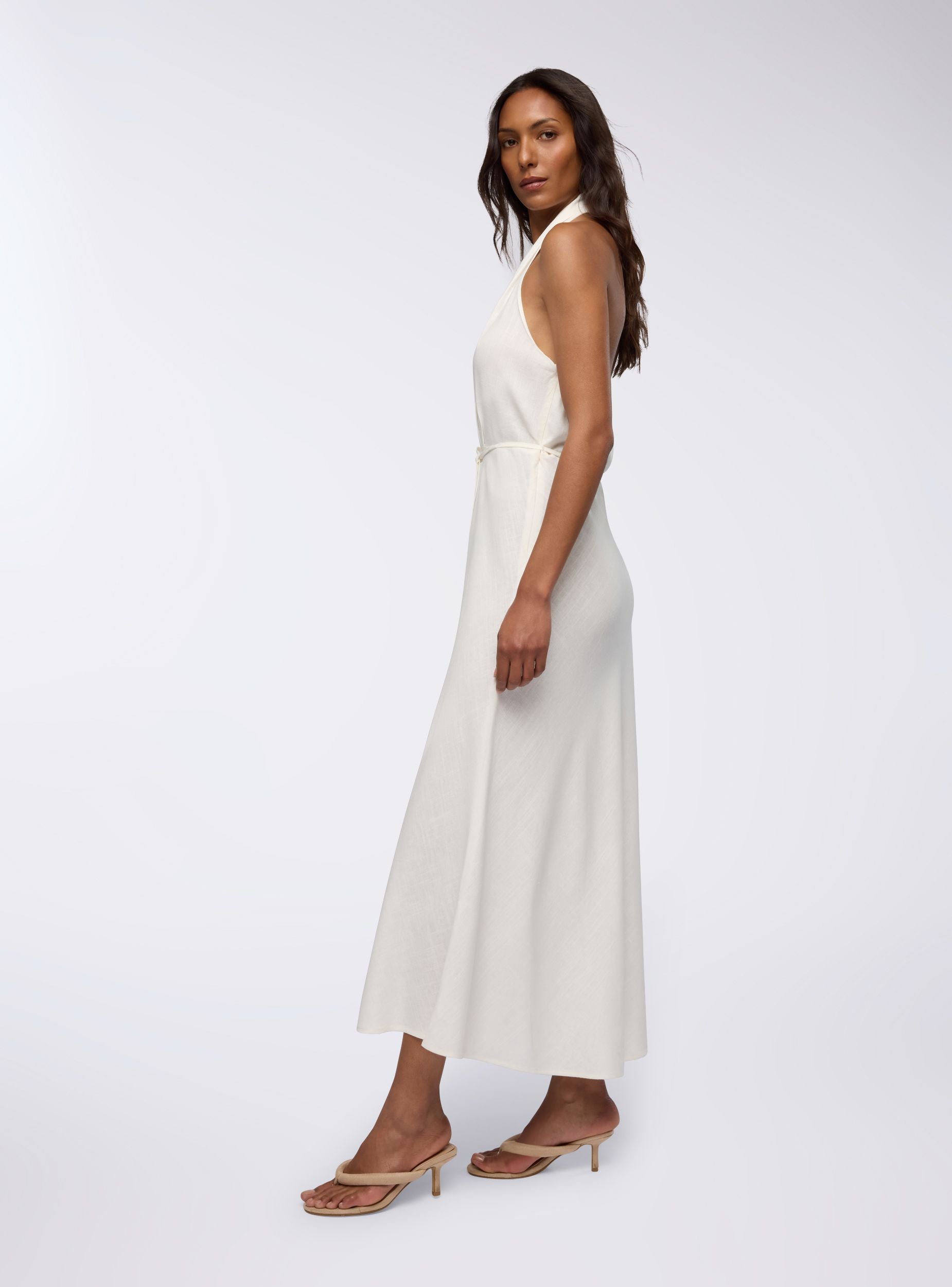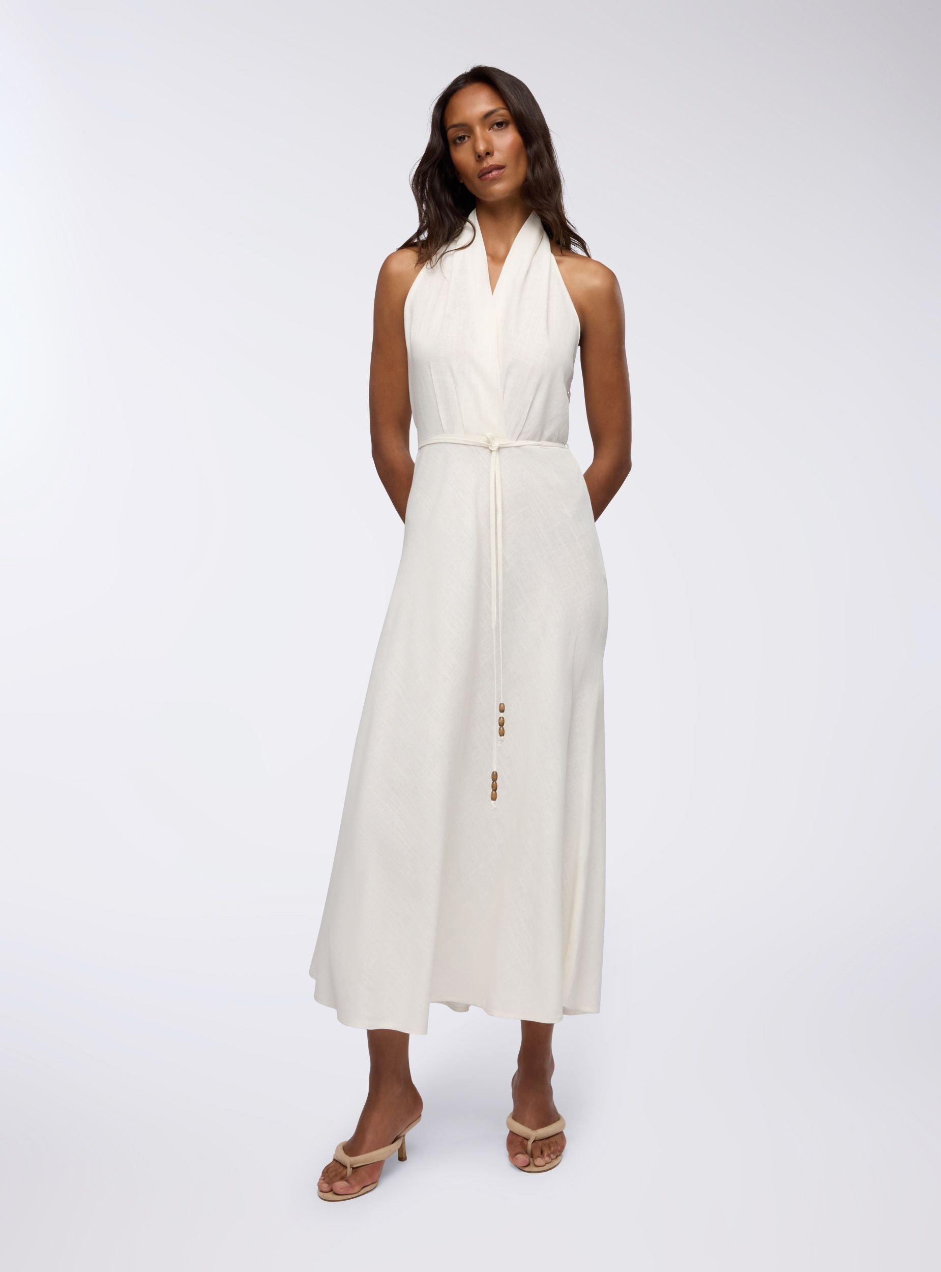 Abito da donna lungo e svasato, perfetto per un look fresco e raffinato. Il design halterneck valorizza le spalle, mentre la zip laterale assicura una vestibilità confortevole. Il tessuto in misto lino dona un effetto naturale ed elegante. Il cordoncino in vita permette di regolare la silhouette, rendendolo ideale per occasioni estive, da un aperitivo in riva al mare a una passeggiata in città.