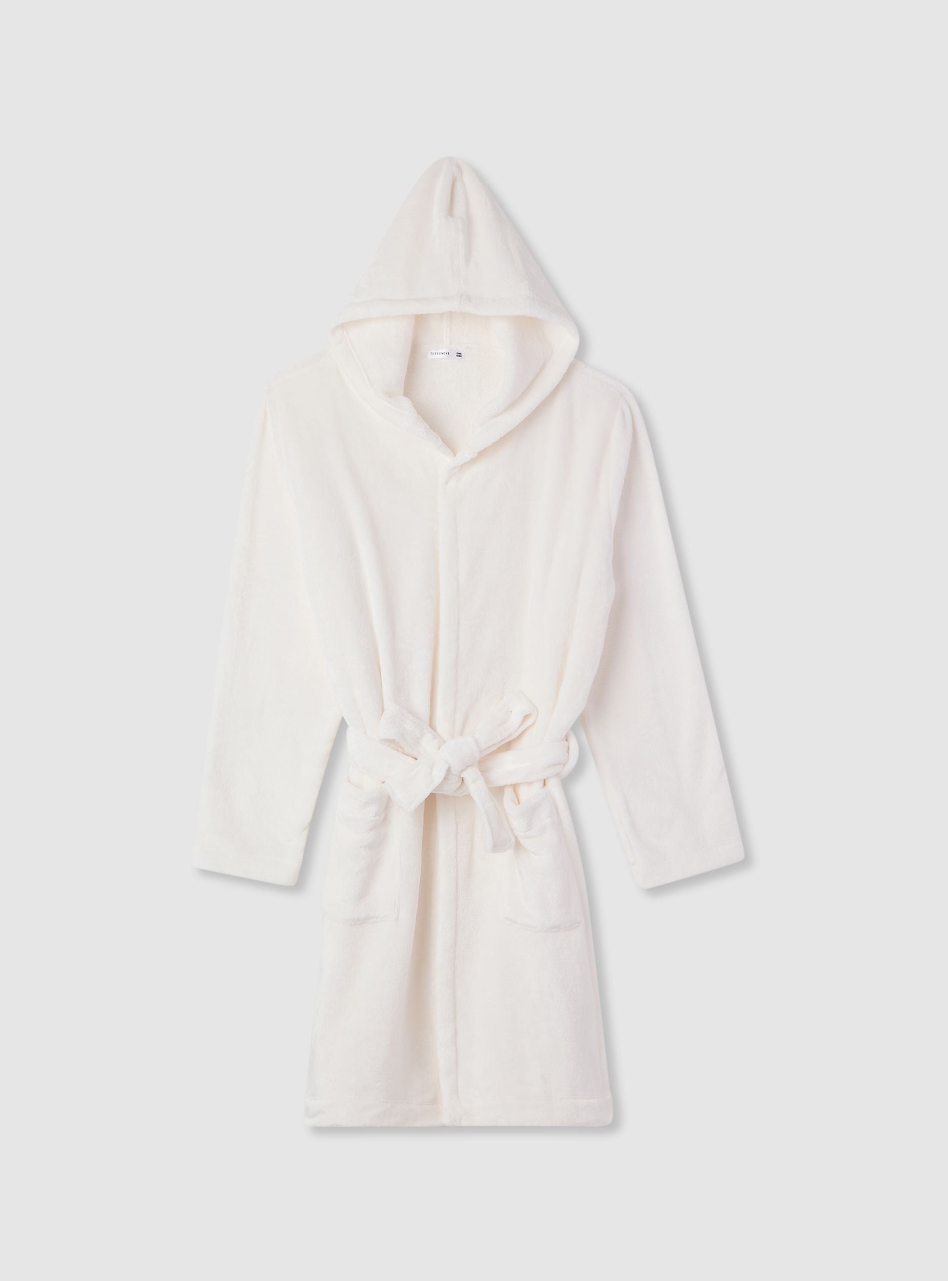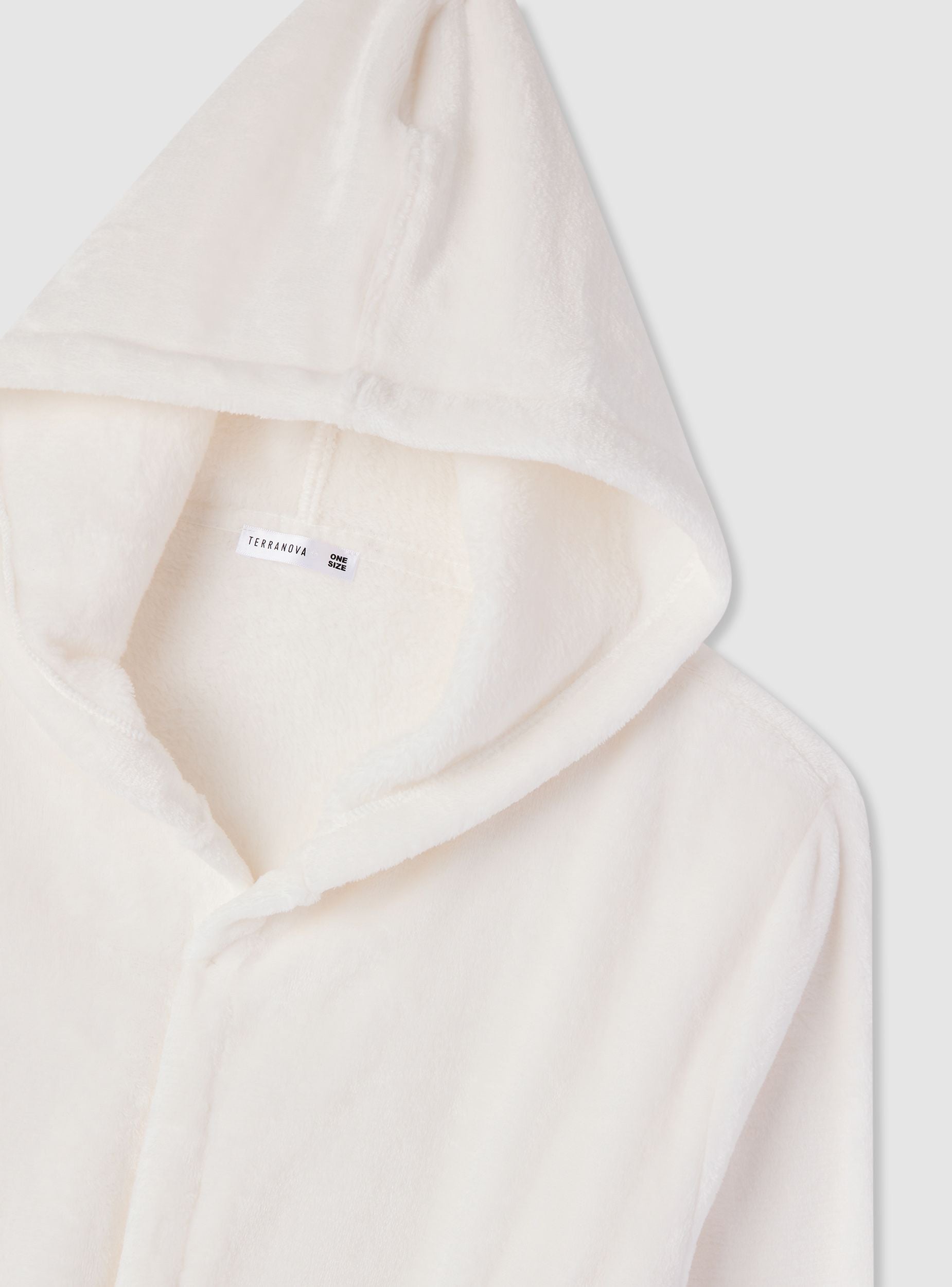 Vestaglia da donna con cappuccio, ideale per momenti di relax in casa. Modello con cintura coordinata e due tasche applicate. Linea morbida e confortevole, maniche lunghe e finiture pulite. Design a tinta unita facile da abbinare a pantofole, perfetto per serate cozy o mattine lente.