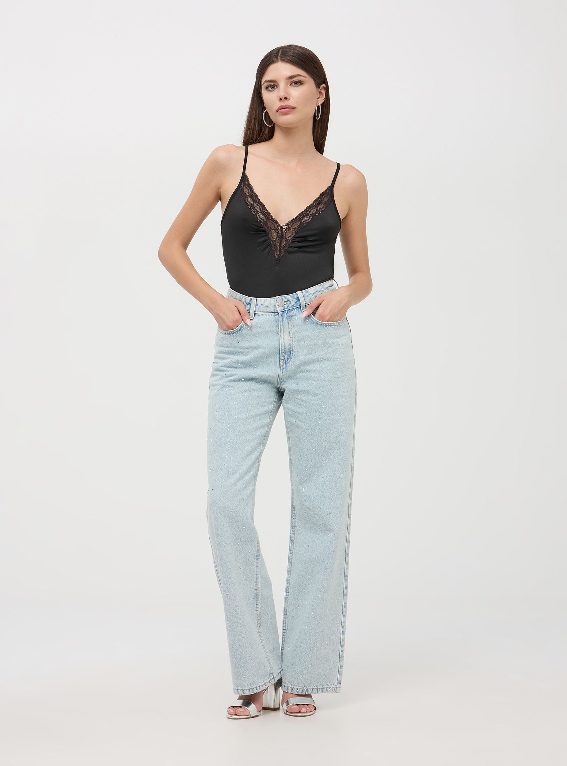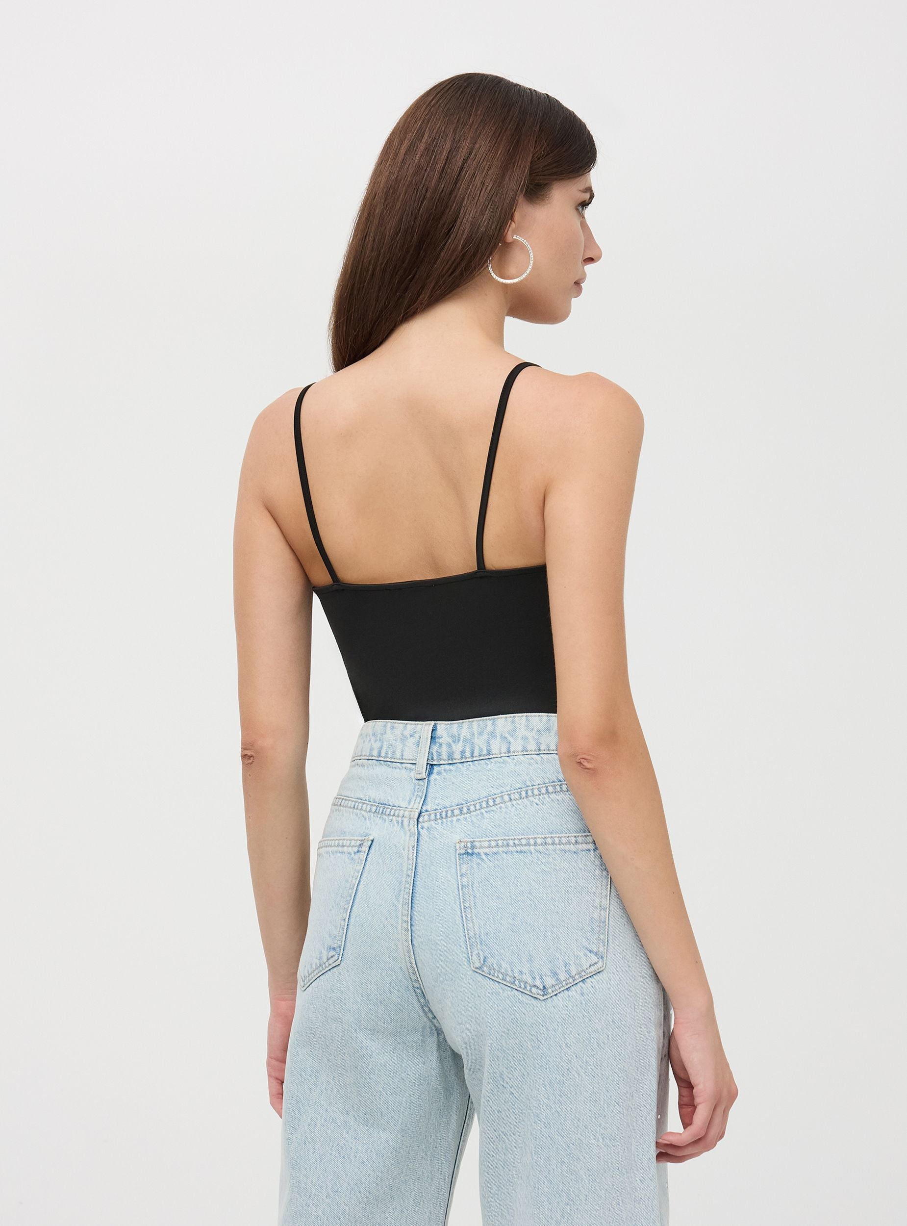 Body da donna con scollo a V con inserti in pizzo. Chiusura sul fondo con bottoncini a pressione. Vestibilità aderente.