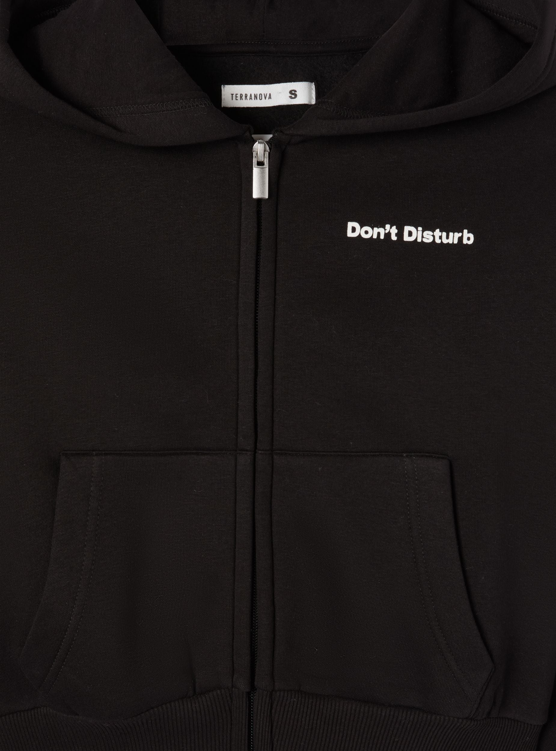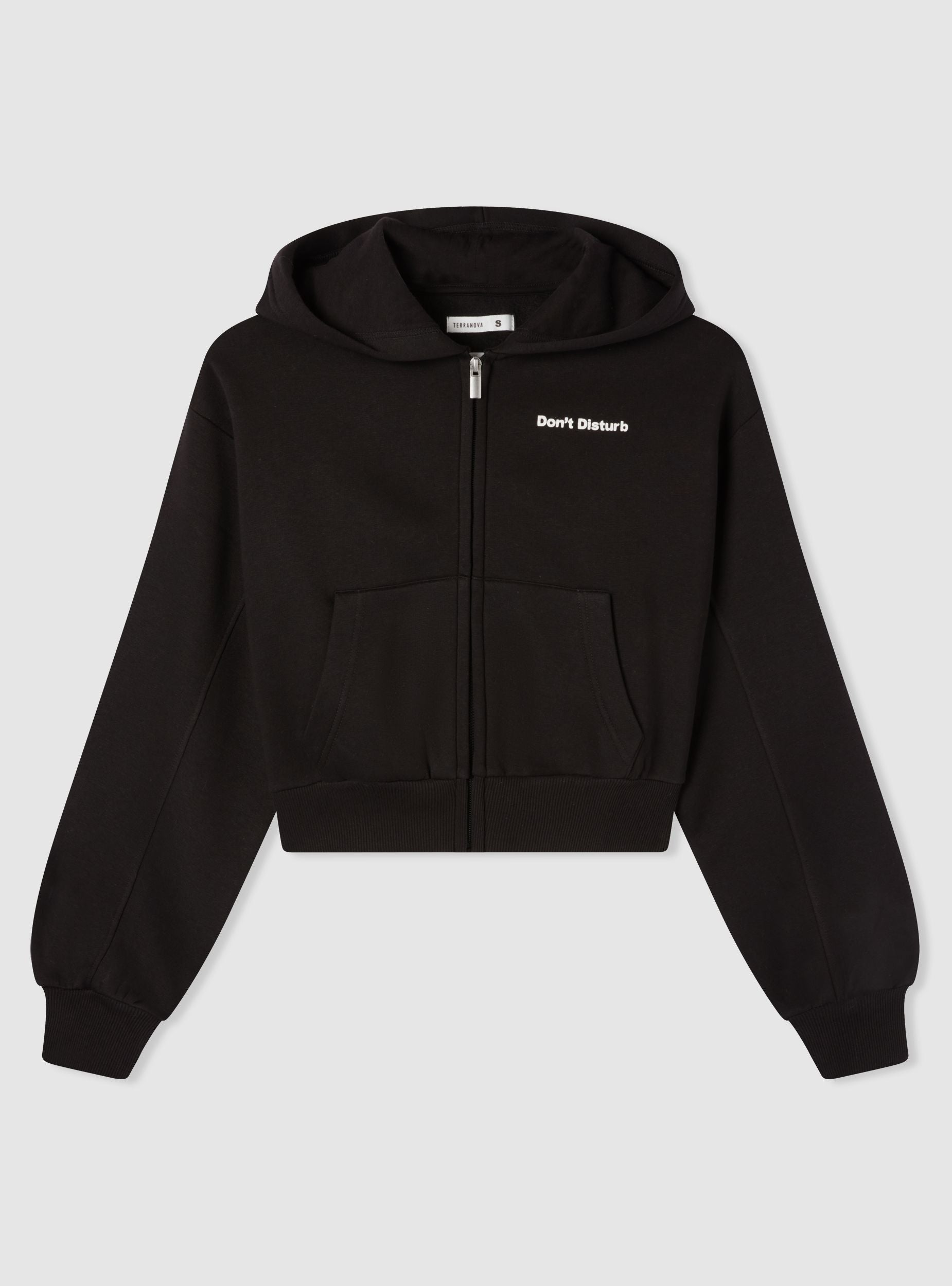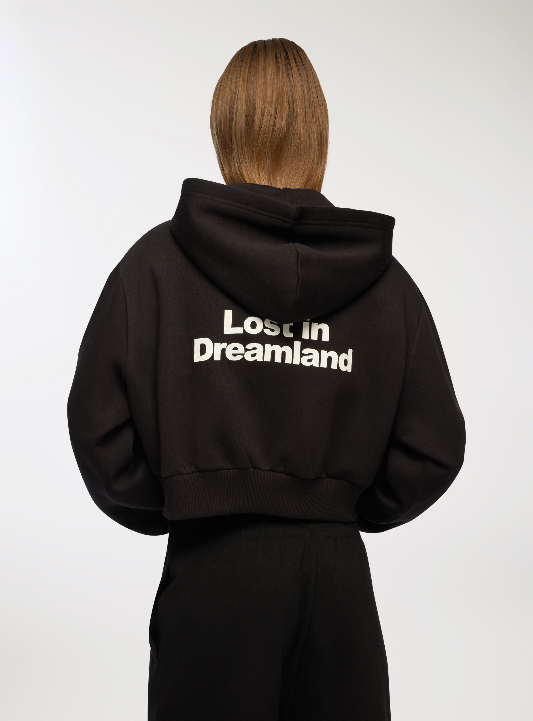 Felpa pesante da donna con zip frontale, cappuccio e scritta divertente sul davanti e sul retro. Il design crop esalta la figura e dona uno stile giovane e rilassato. Realizzata in tessuto felpato è perfetta per i mesi freddi. Ideale da abbinare a joggers, leggings o jeans per outfit comfy dallo spirito urban e sognante.