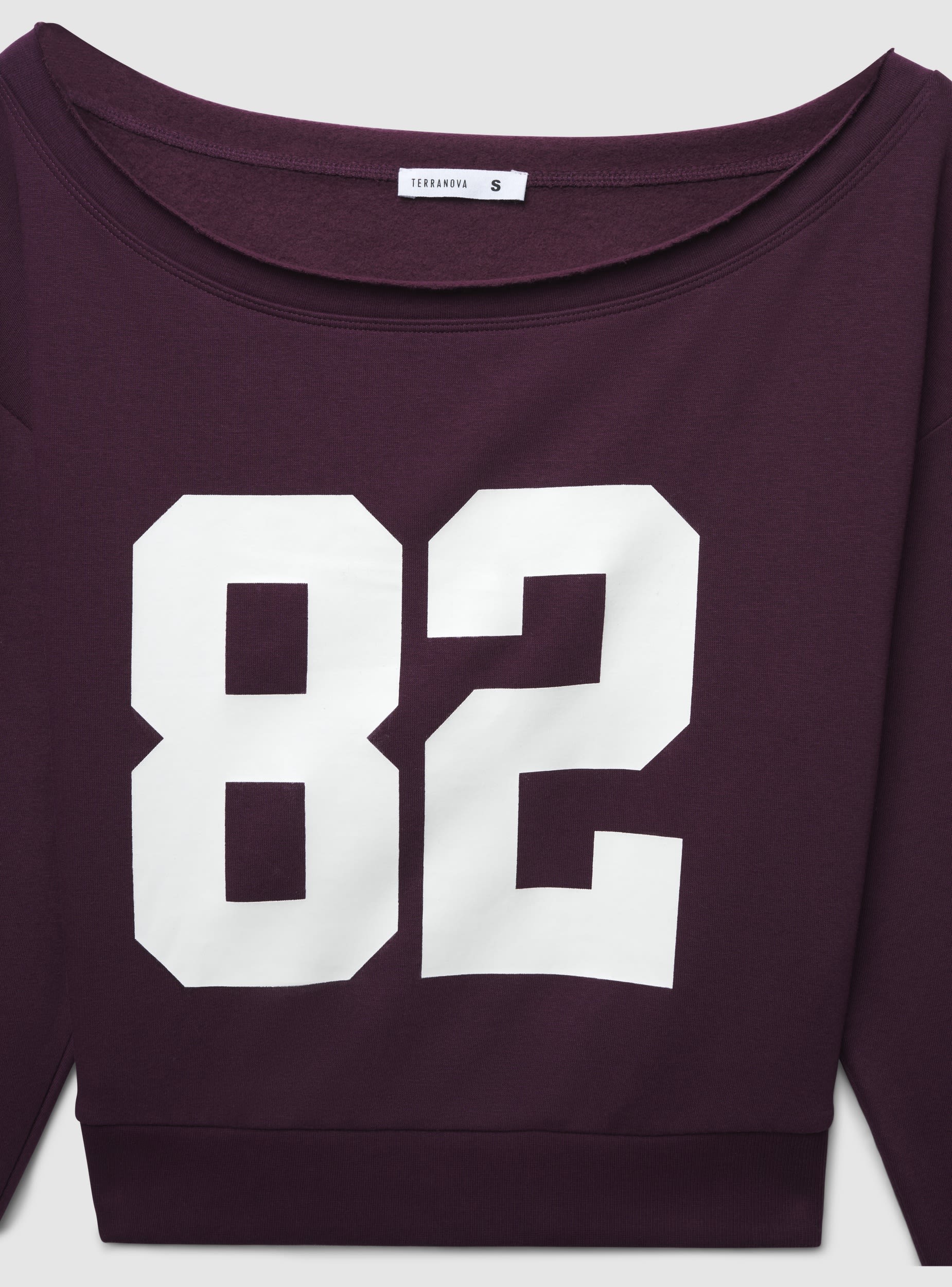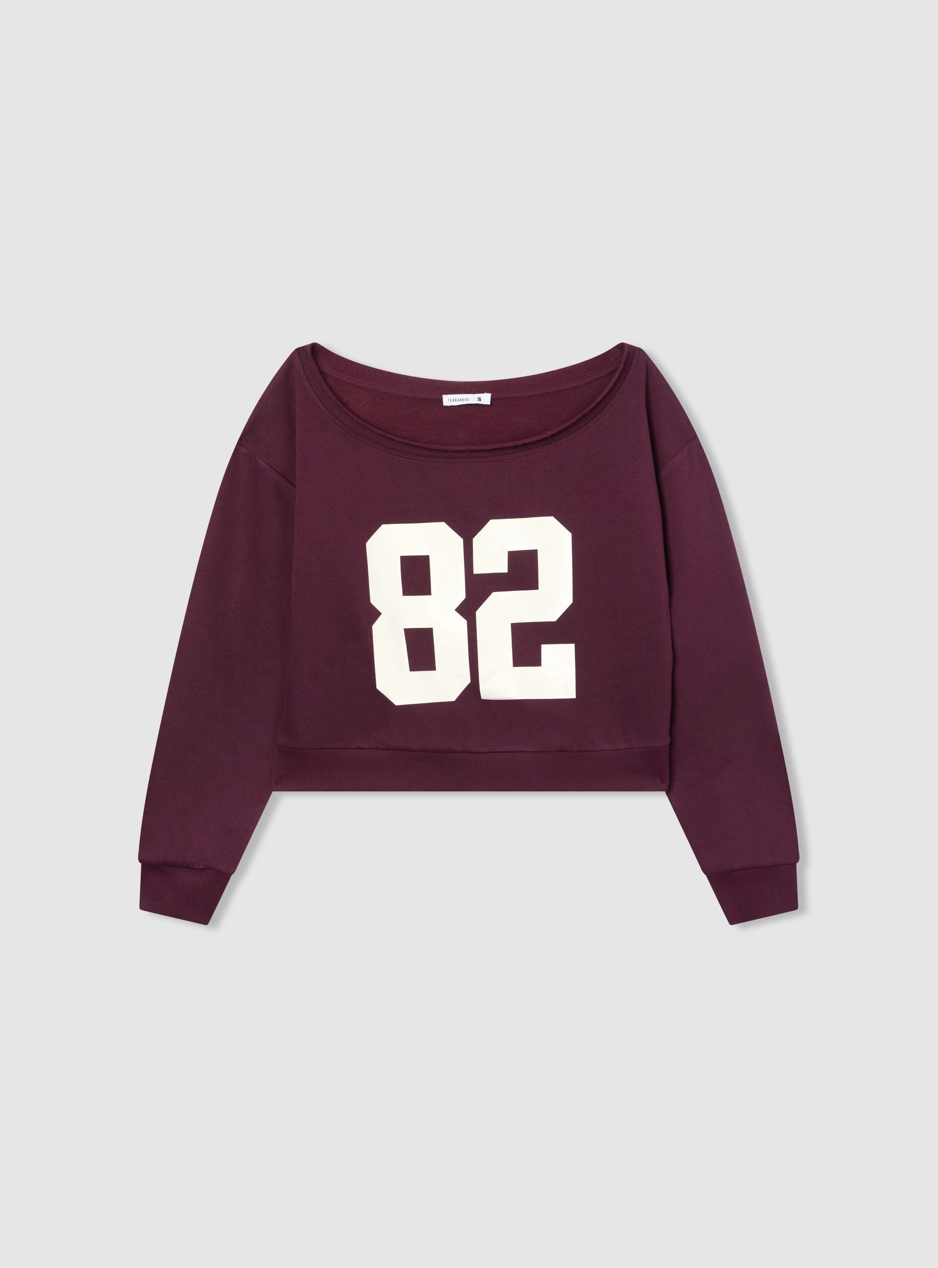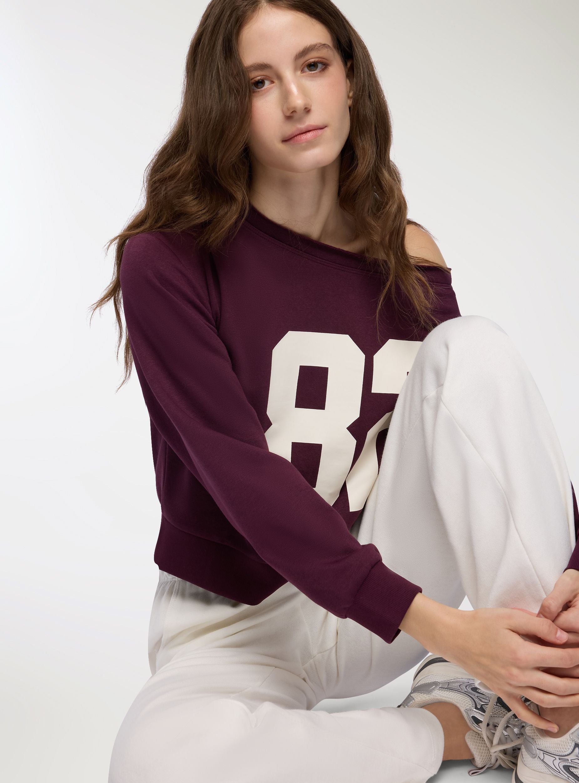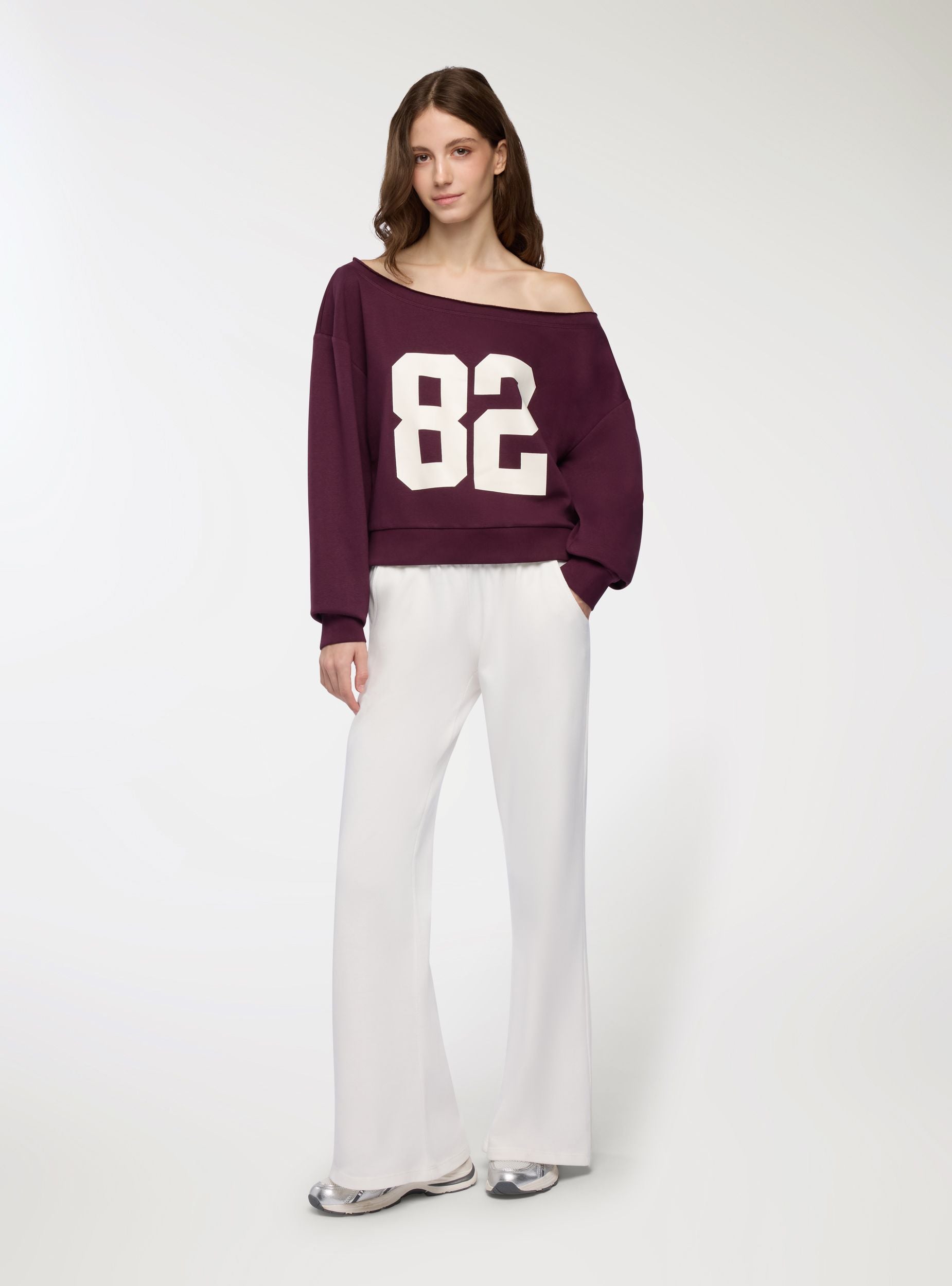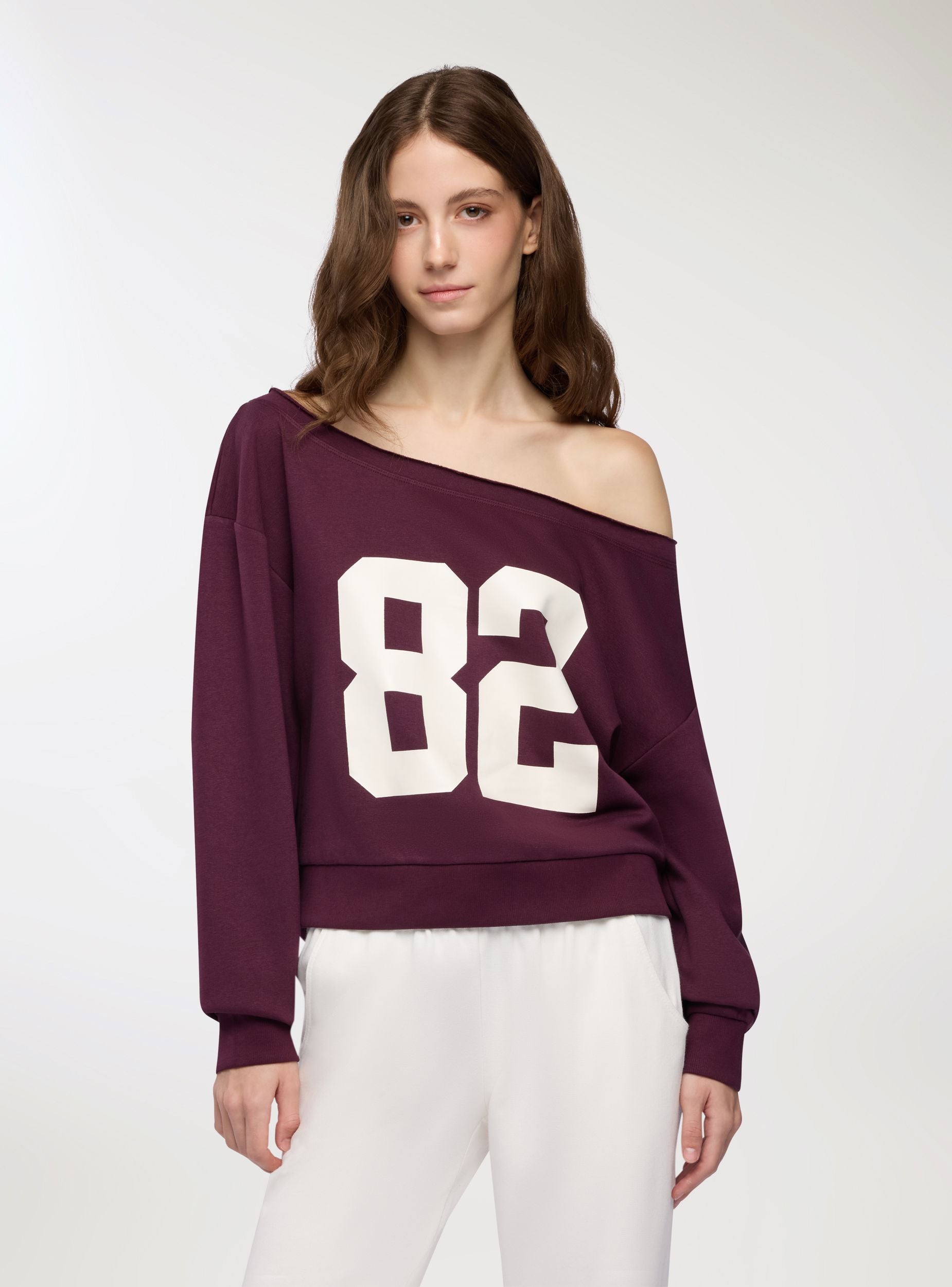 Felpa da donna con scollo ampio a spalle scoperte e maniche lunghe. Modello crop con fondo e polsini in maglia a coste, grafica con numero frontale che richiama l’estetica college. Ideale per look casual o trendy nel tempo libero, si abbina a jeans a vita alta o pantaloncini sportivi. Vestibilità regolare che valorizza la silhouette senza rinunciare al comfort. Fantasia con scritta numerica.Dettagli