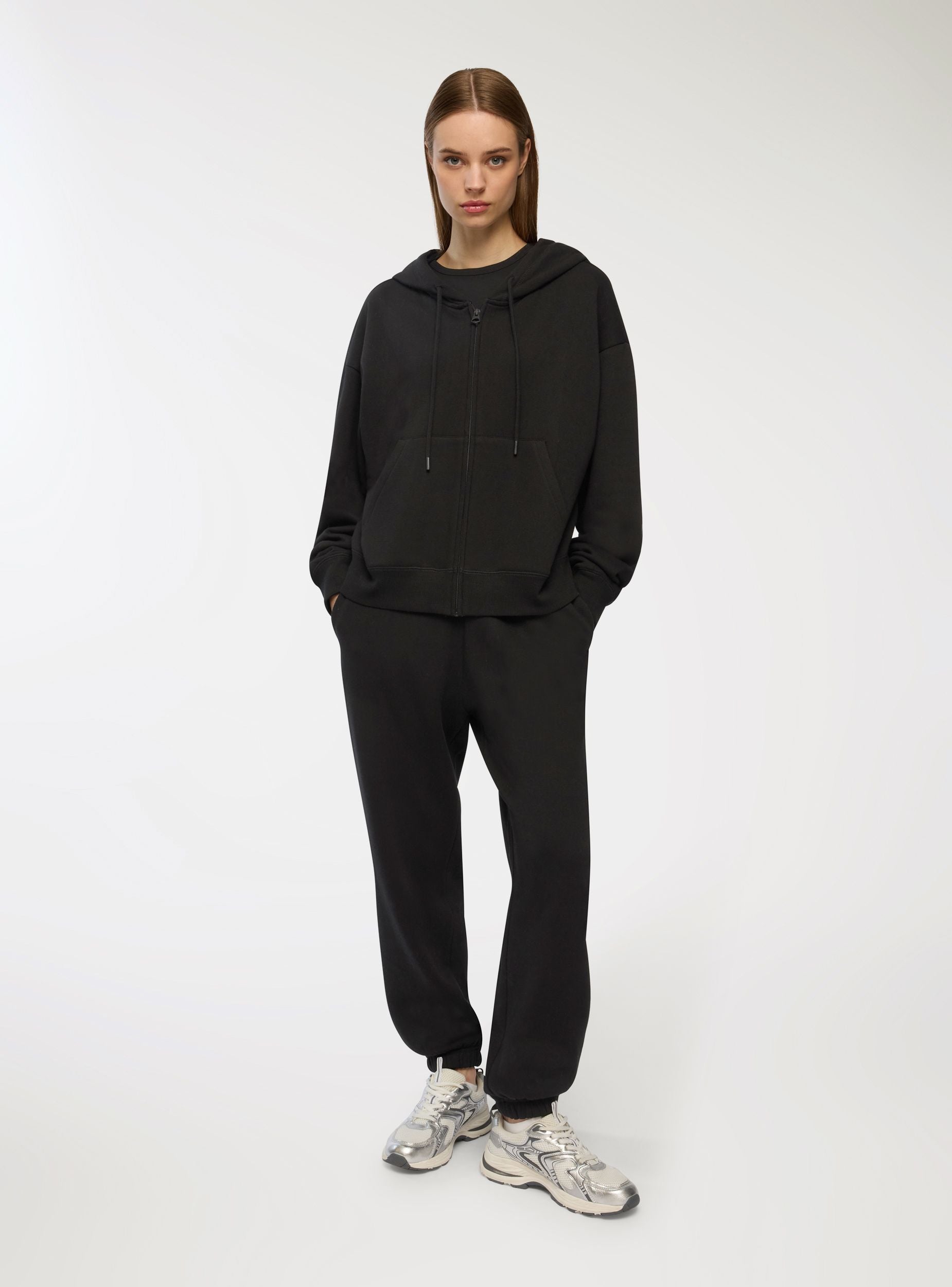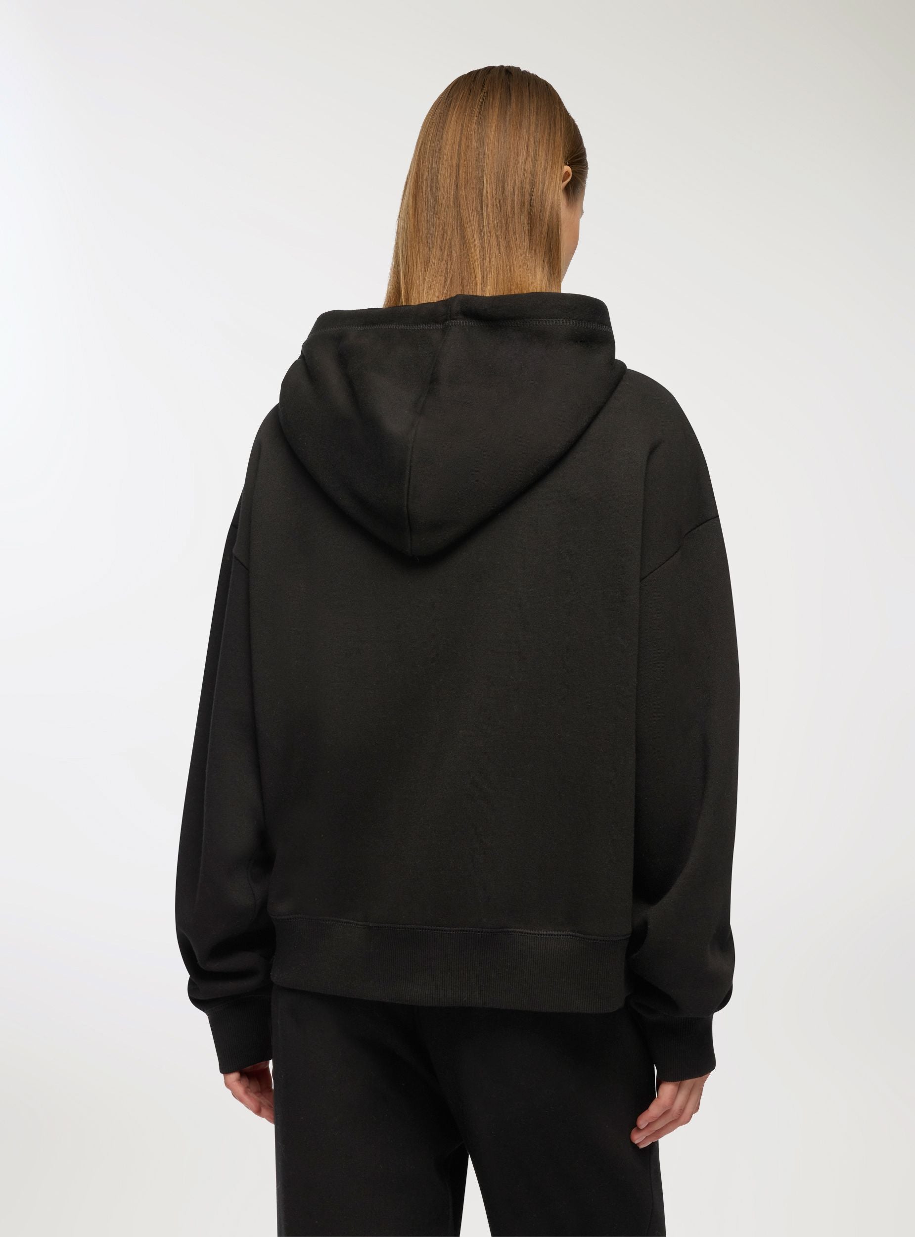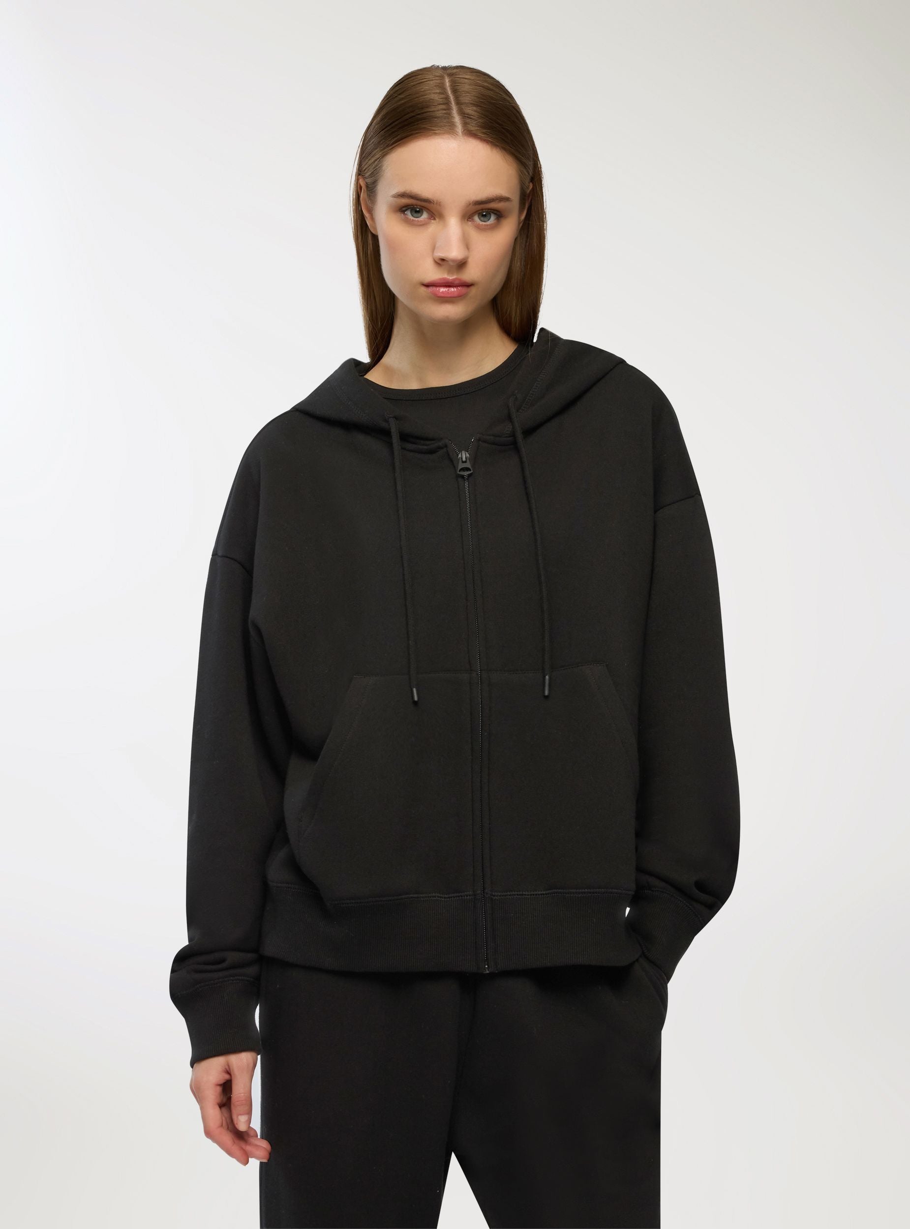 Felpa da donna con vestibilità over, cappuccio regolabile con coulisse e zip frontale. Realizzata in tessuto pesante che offre calore e morbidezza ideale per l’inverno. Dotata di tasche a marsupio e finiture in costina su fondo e polsi, unisce comfort e stile urbano. Perfetta per un look casual e rilassato.