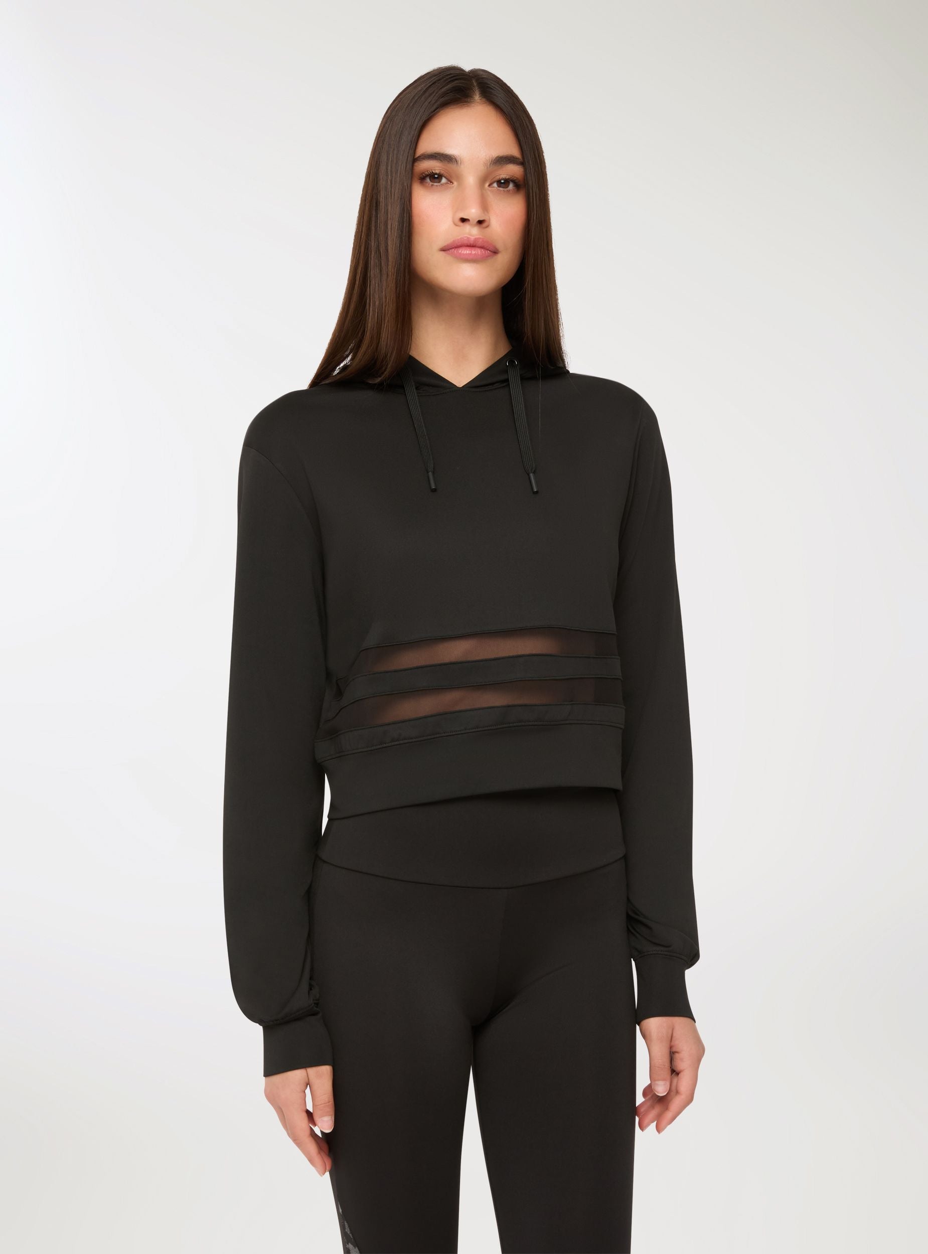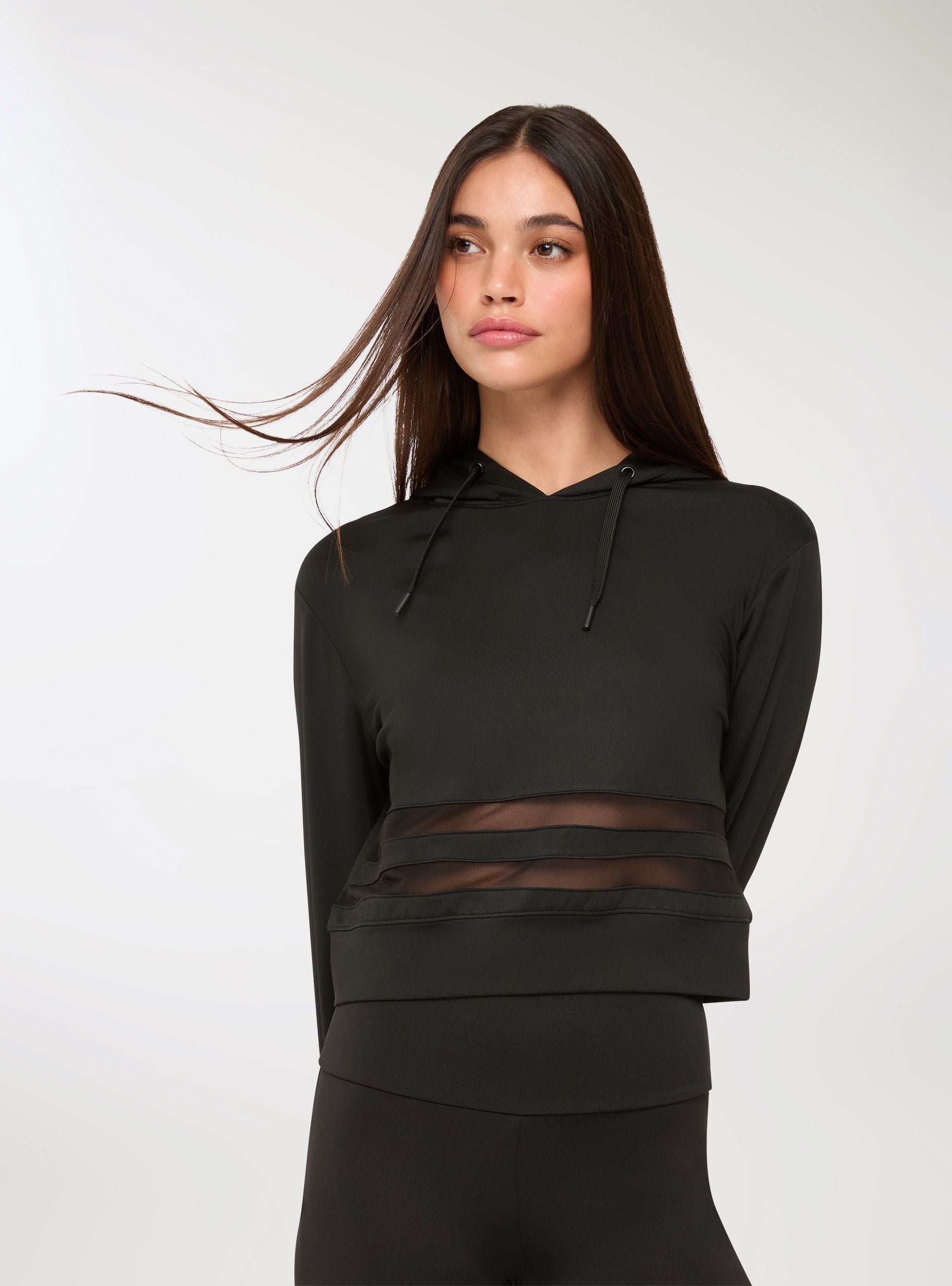 Felpa sportiva da donna con un look deciso e contemporaneo, perfetta per il tempo libero o un outfit athleisure. Il design con cappuccio e coulisse si combina a bande trasparenti sul fondo, aggiungendo un tocco audace e dinamico. Le maniche lunghe e la tinta unita la rendono facile da abbinare. Ideale per chi cerca uno stile urbano che unisca comfort e personalità. Linea Active.