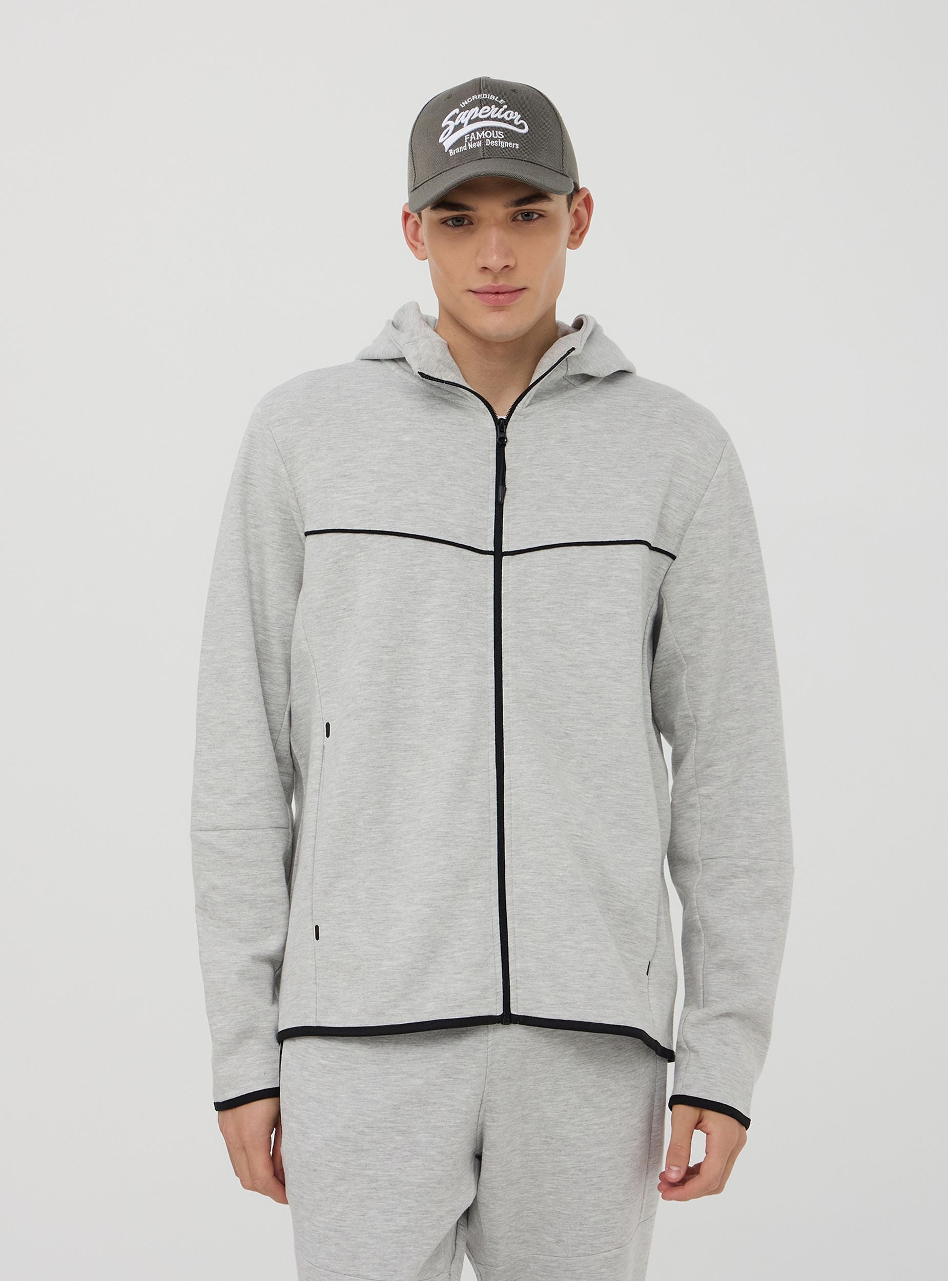 Felpa tecnica da uomo in misto cotone pesante, a maniche lunghe con cappuccio, dal design tinta unita con pratica chiusura a zip frontale. Dettagli piping e tasche laterali aggiungono un tocco moderno e funzionale, ideale per uno stile casual e dinamico. Perfetta per outfit sportivi o abbinata a joggers e sneakers per il tempo libero, garantisce comfort e versatilità in ogni occasione.