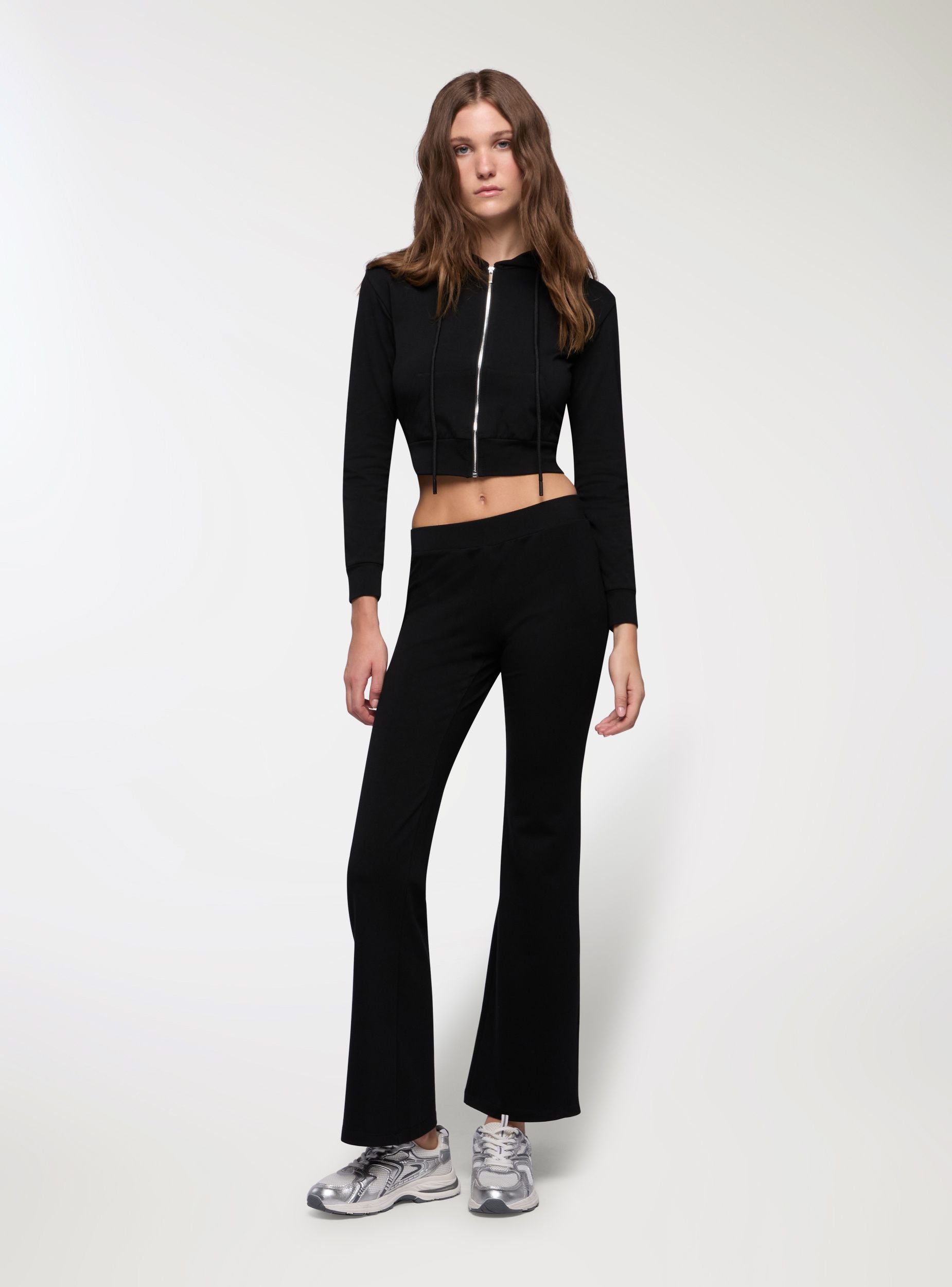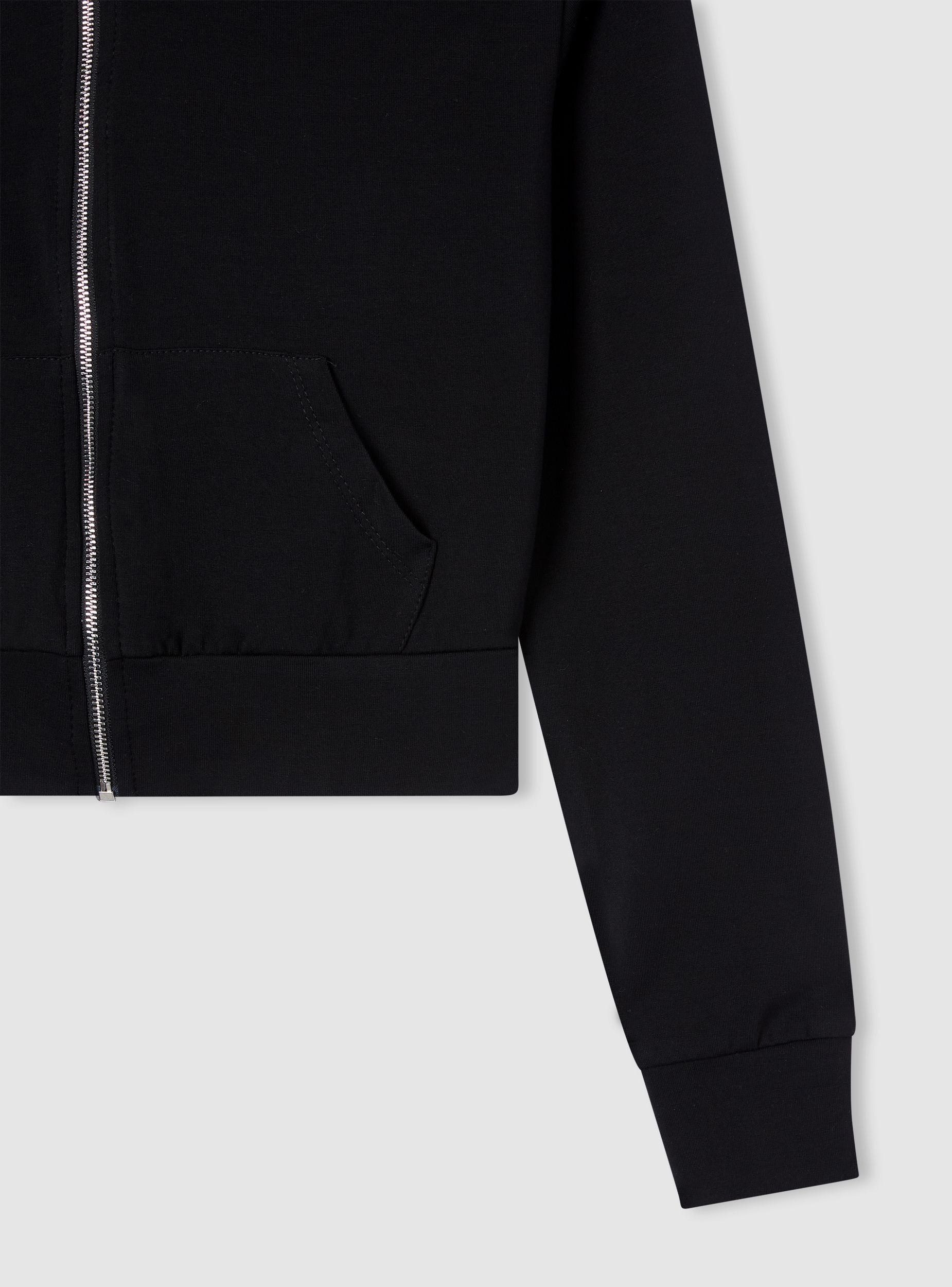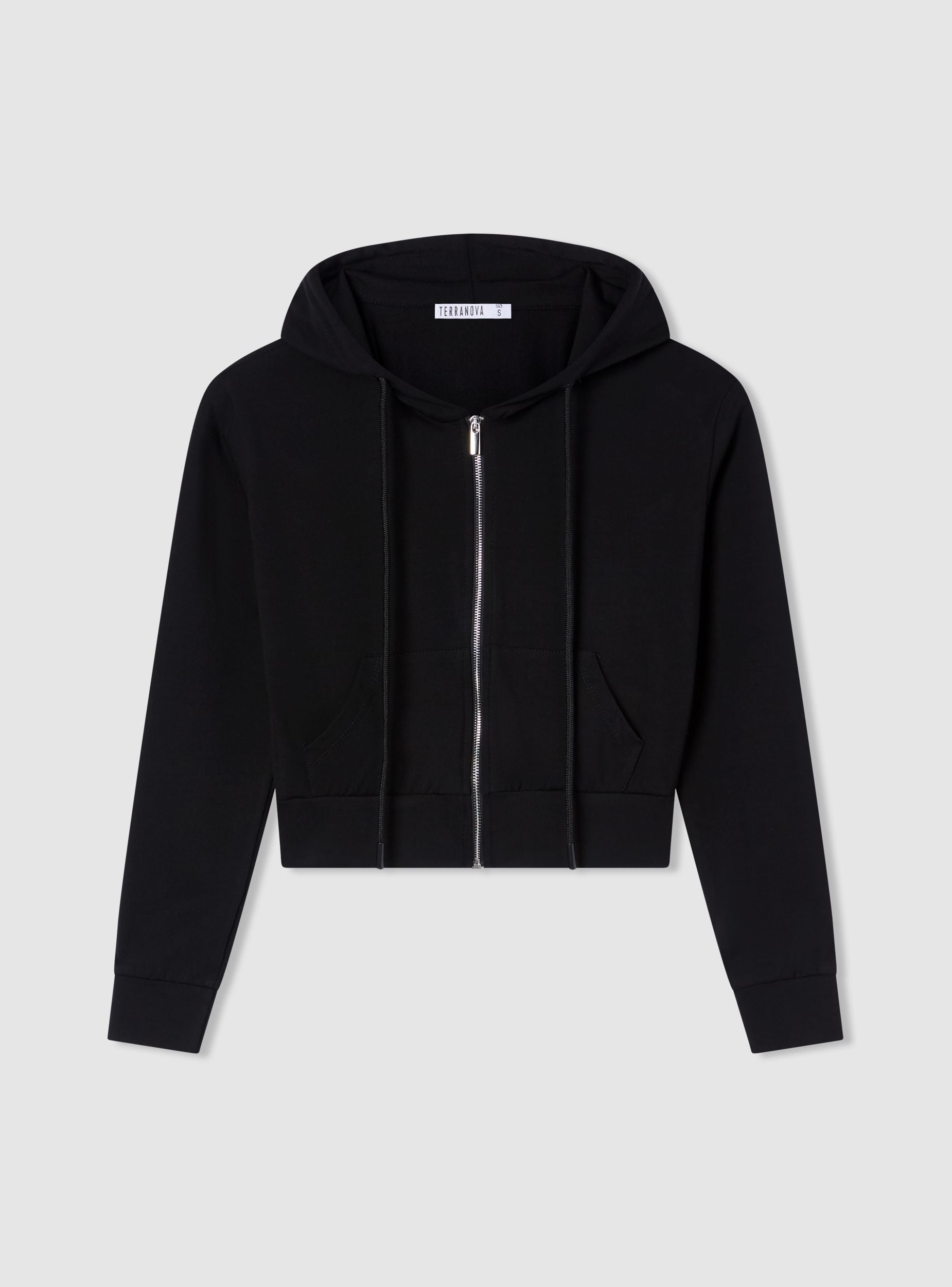 Felpa da donna con cappuccio e con zip frontale. Modello corto con vestibilità crop, maniche lunghe e polsini a coste. Presenta tasche a marsupio e cordini regolabili sul cappuccio. Perfetta per il tempo libero e per look urban con jeans o leggings. Ideale anche sopra top e canotte per un effetto a strati. Design a tinta unita, pratica da indossare ogni giorno.