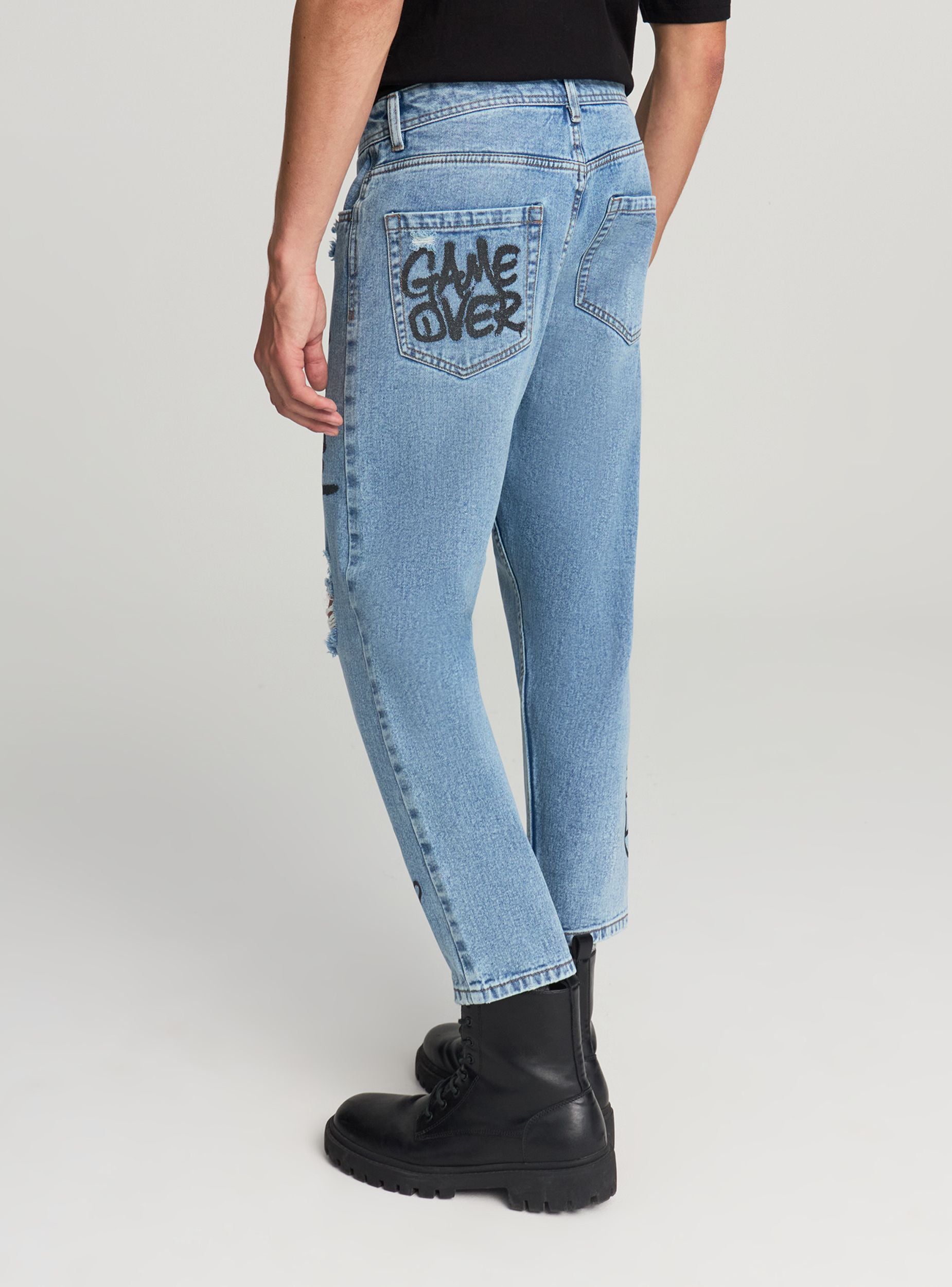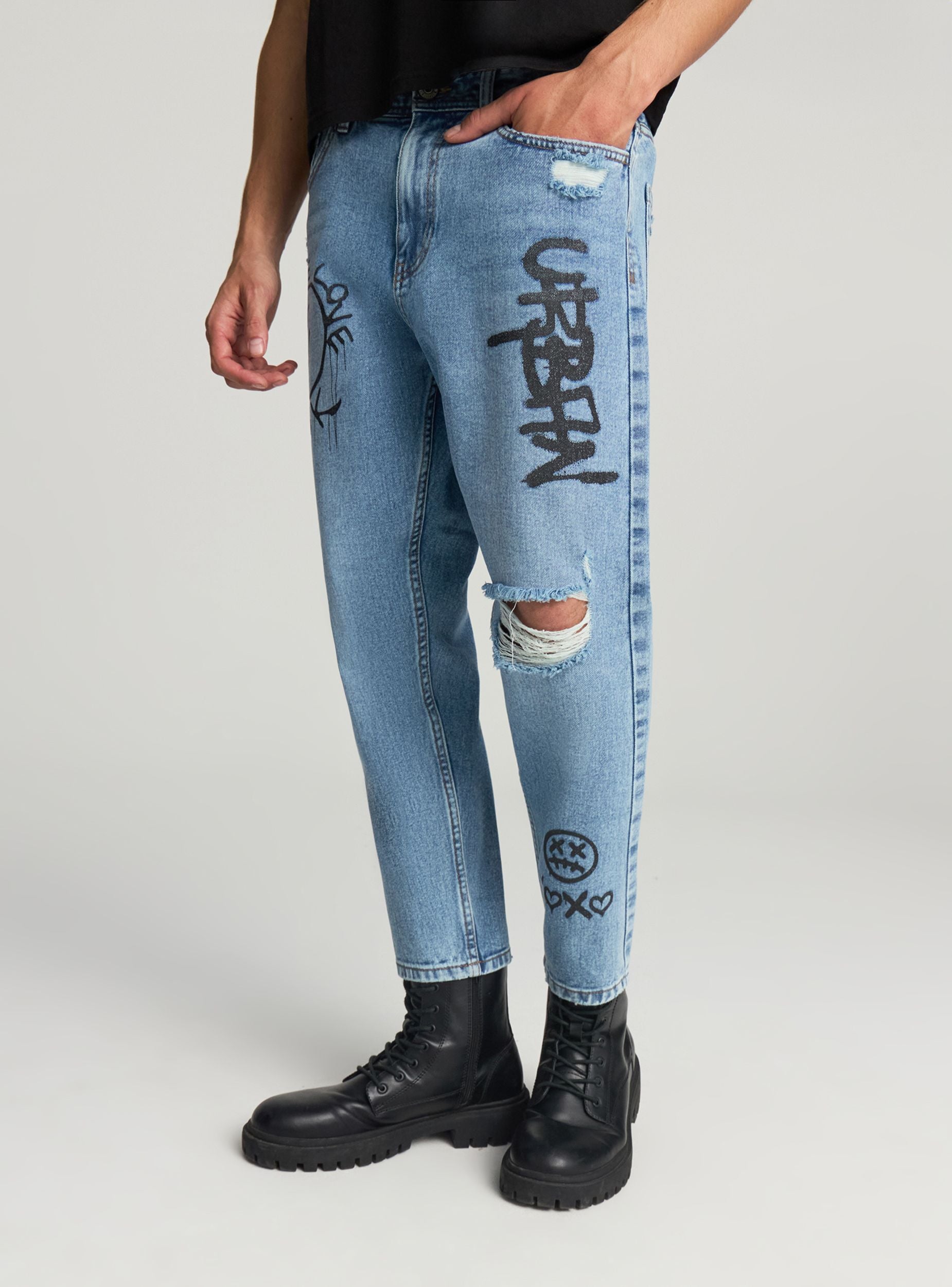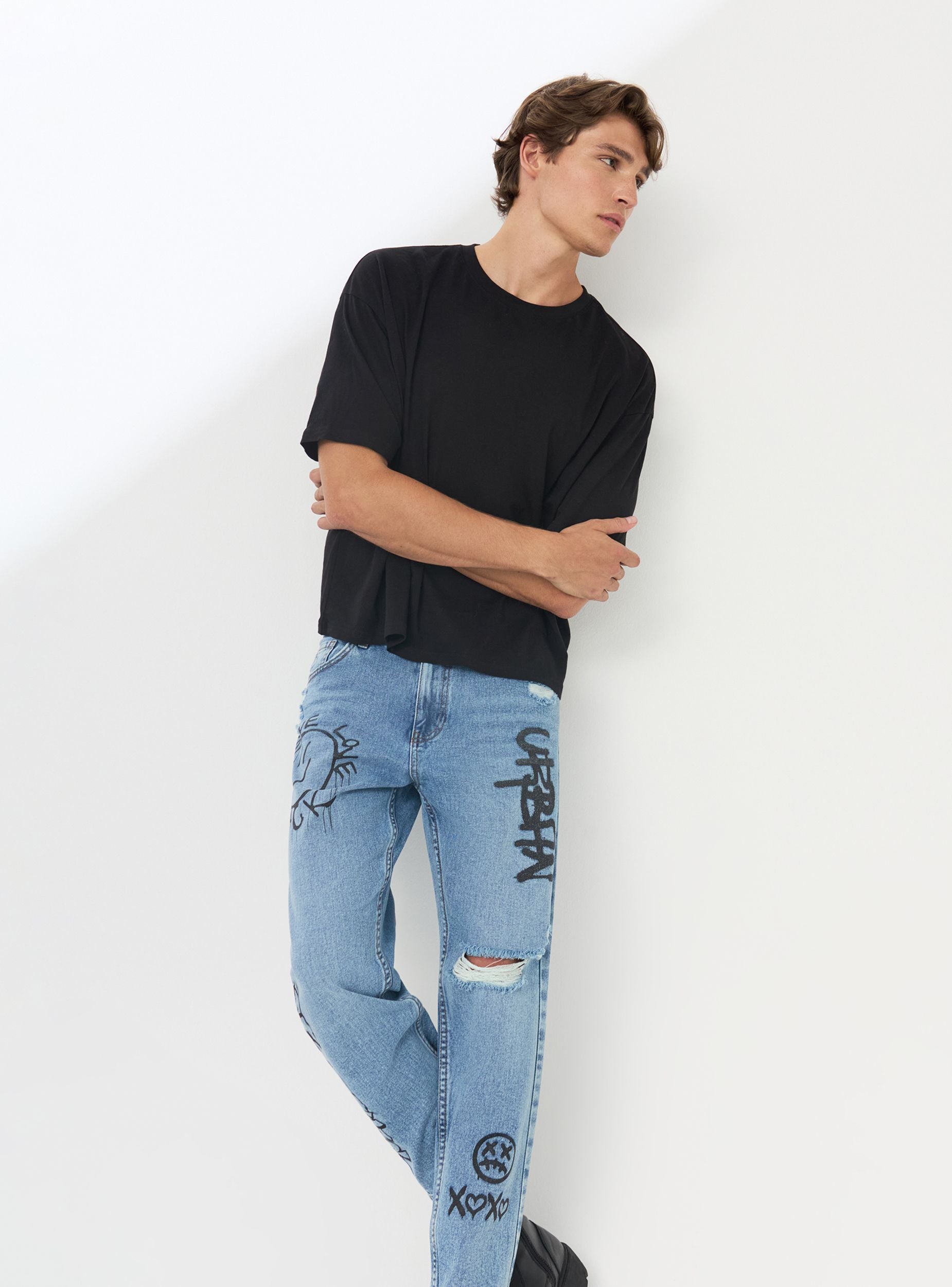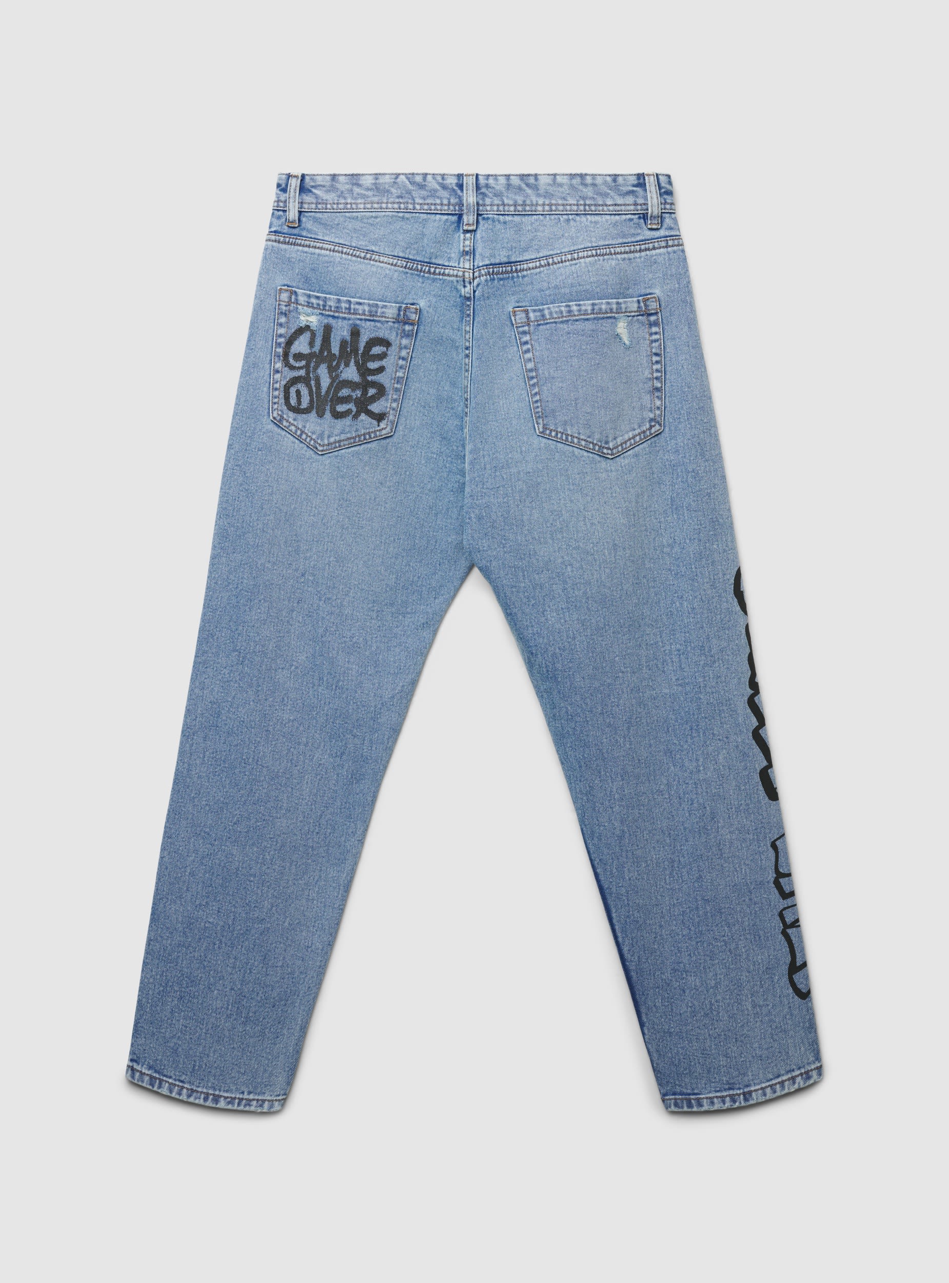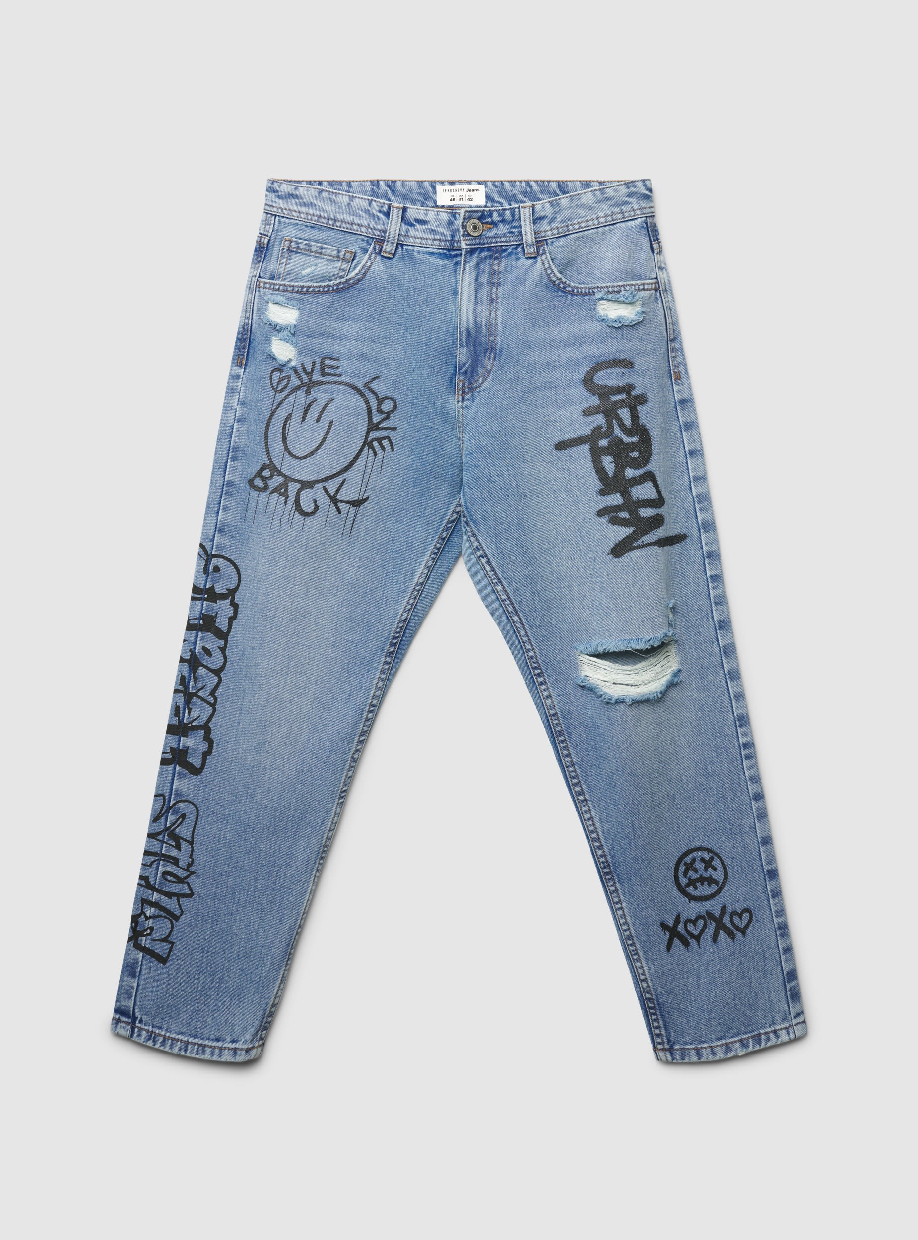 Jeans da uomo loose fit e fantasia a stampa con scritte e graffiti, perfetti per look urban e casual. Modello cinque tasche con chiusura a bottone e zip, passanti in vita e lavaggio denim di media intensità. Ideali con felpa con cappuccio o maglietta e sneakers, aggiungono carattere grazie agli strappi frontali e ai dettagli grafici anche sul retro.