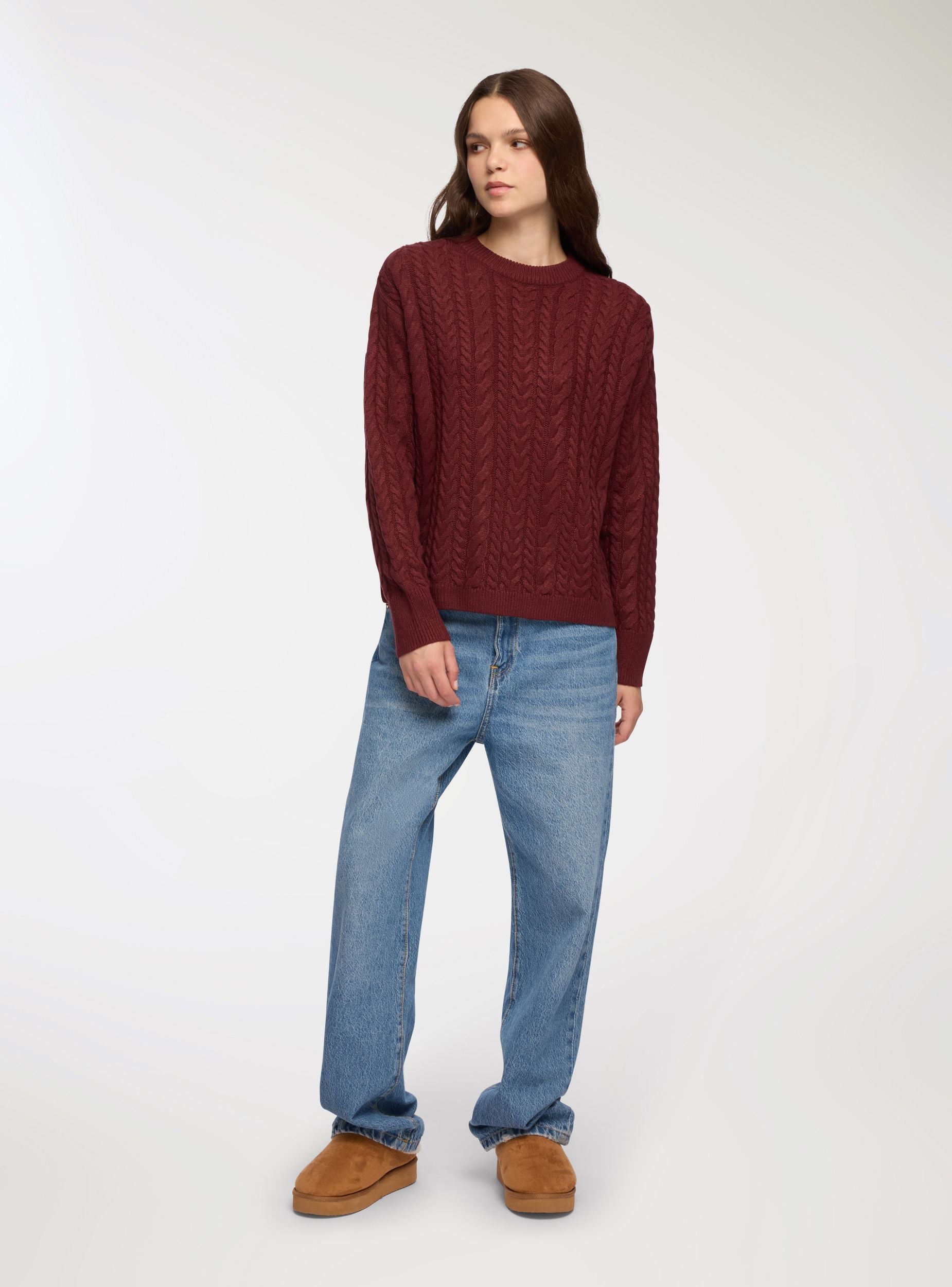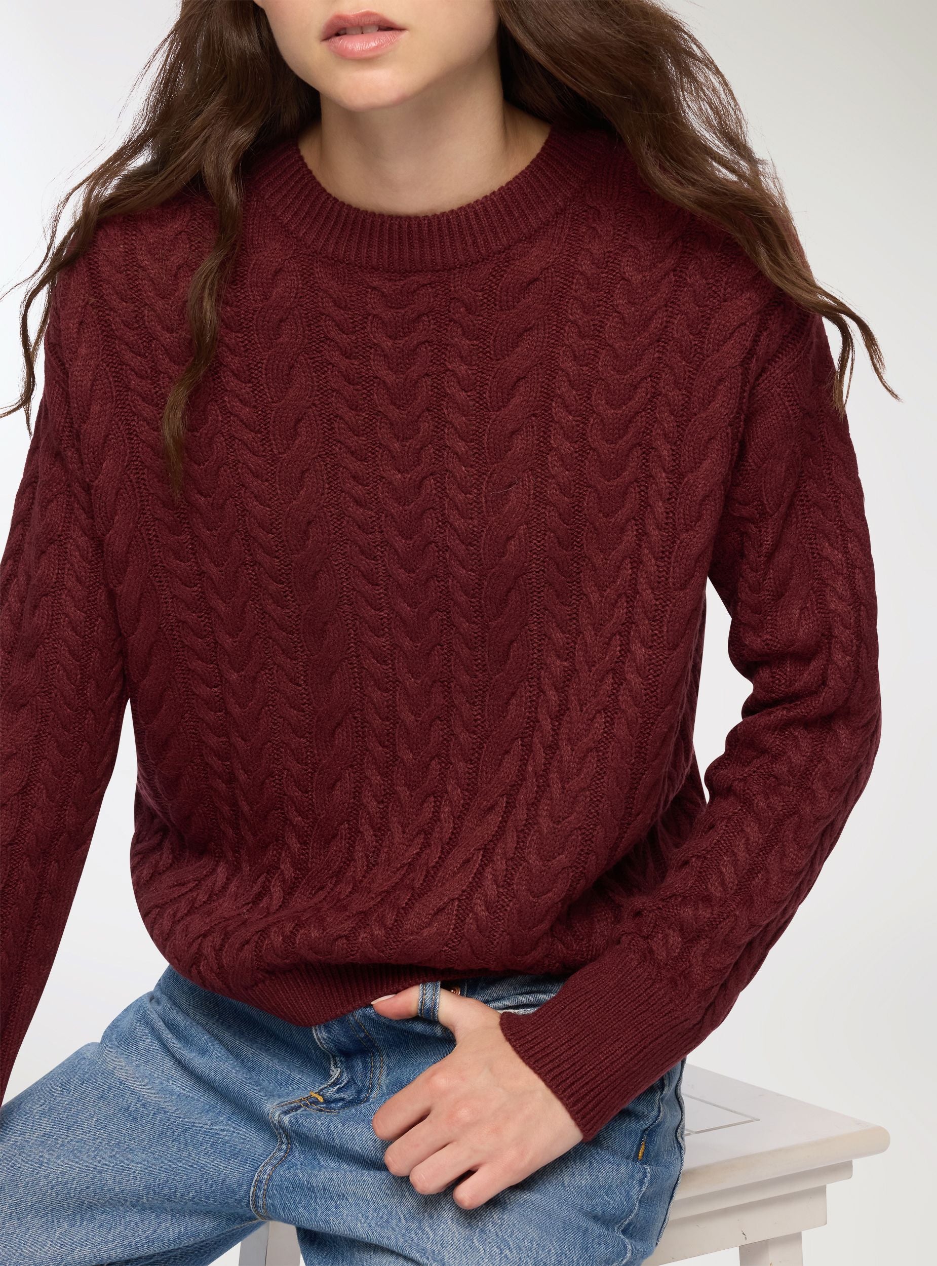 Maglia da donna con lavorazione a trecce, ideale per un look casual e confortevole. Presenta un design a girocollo e maniche lunghe, perfetta per essere abbinata a jeans o pantaloni per un outfit quotidiano. La vestibilità regolare garantisce comodità e stile, rendendola adatta a diverse occasioni.