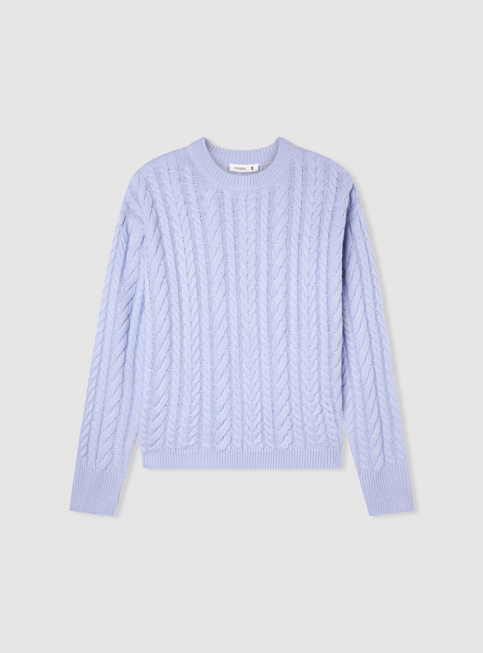 Maglia da donna con lavorazione a trecce, ideale per un look casual e confortevole. Presenta un design a girocollo e maniche lunghe, perfetta per essere abbinata a jeans o pantaloni per un outfit quotidiano. La vestibilità regolare garantisce comodità e stile, rendendola adatta a diverse occasioni.