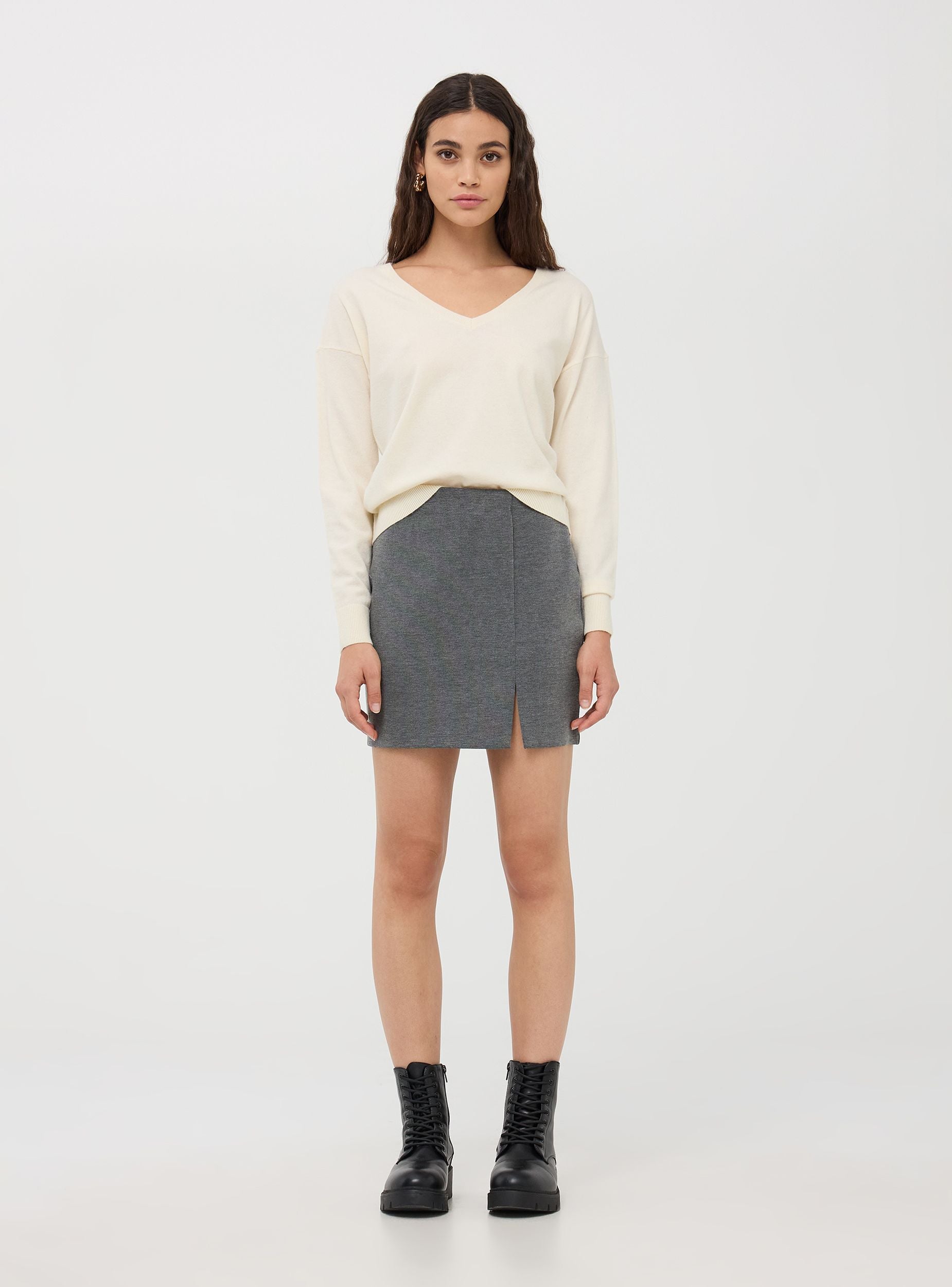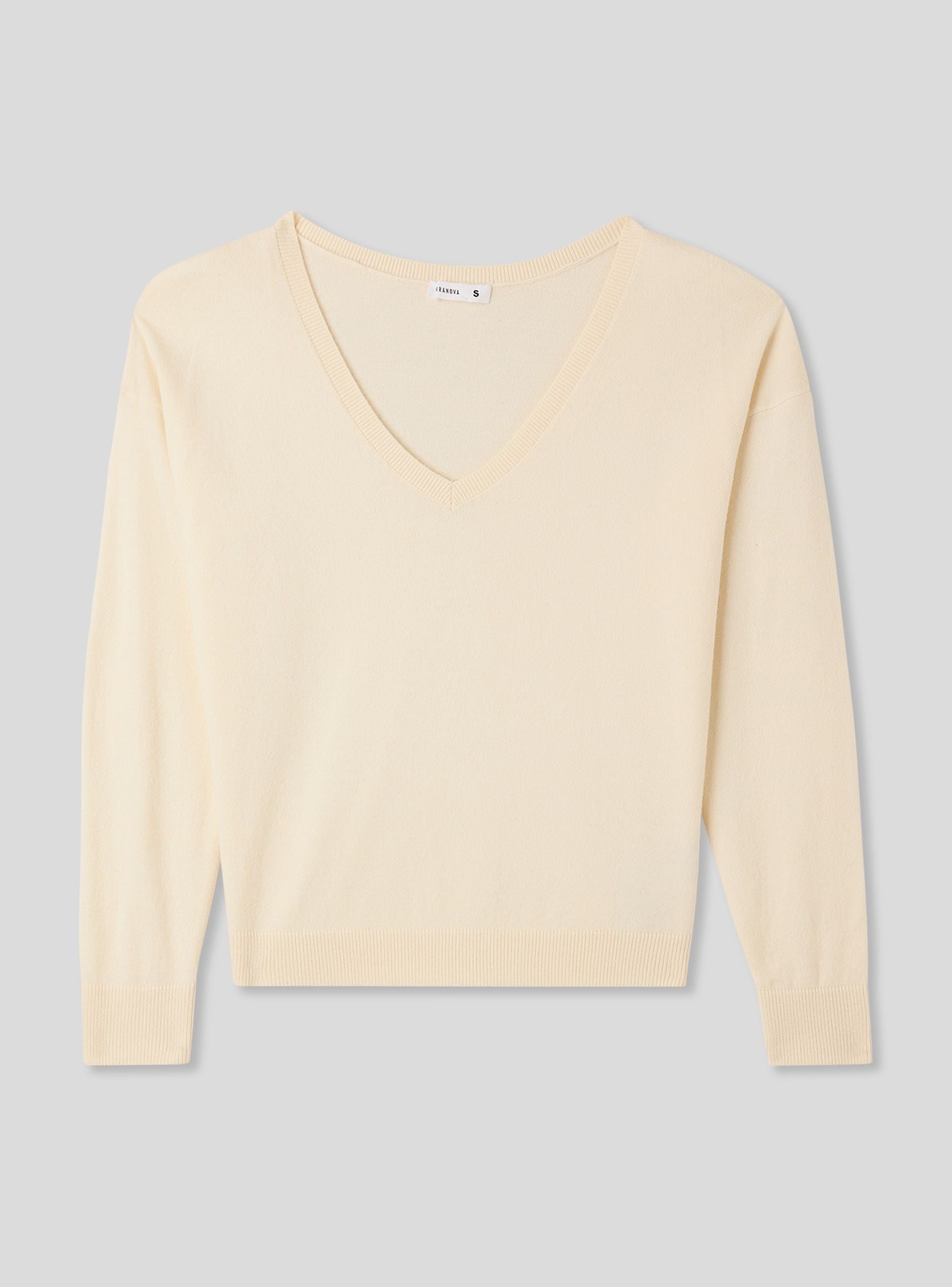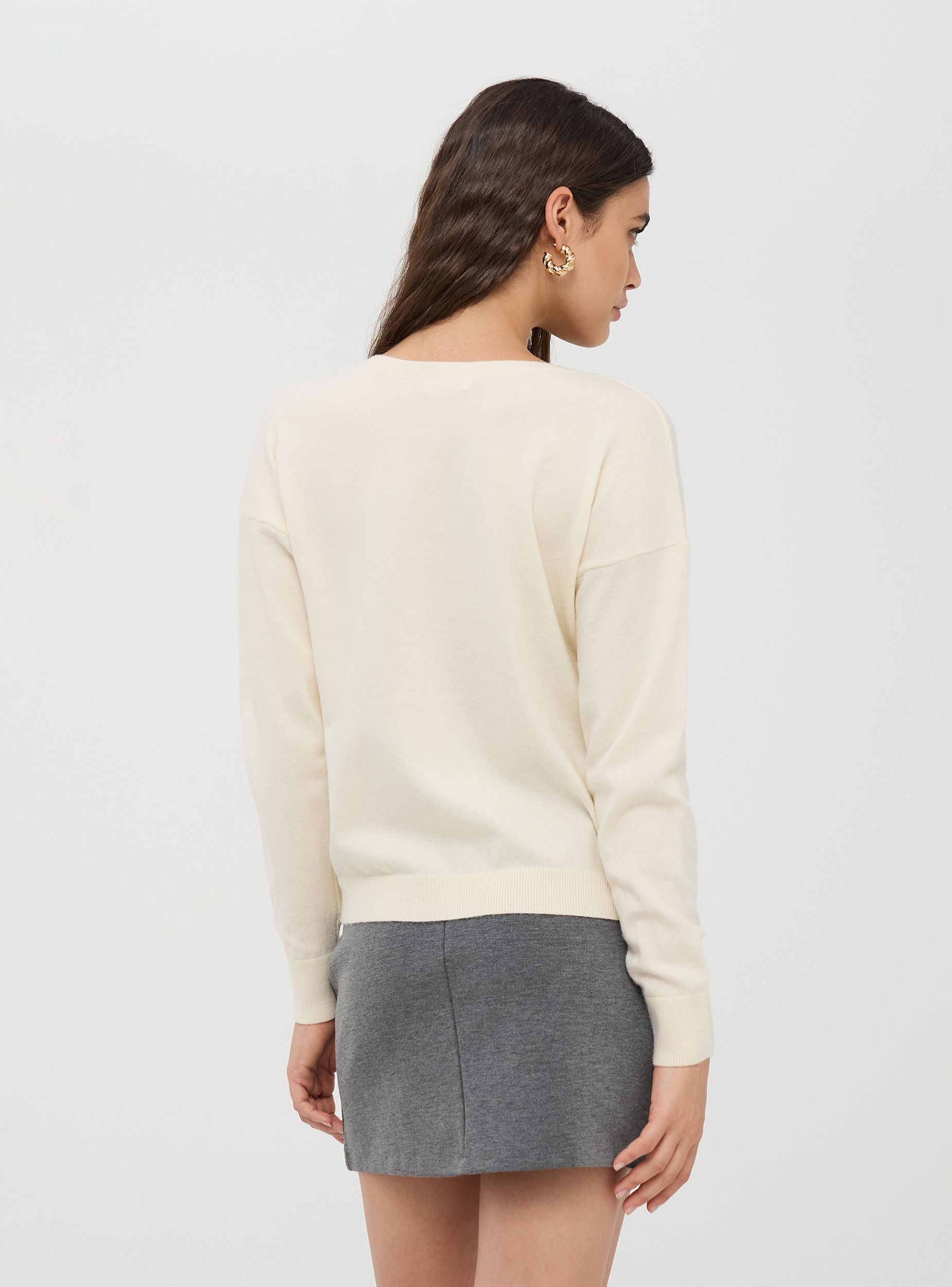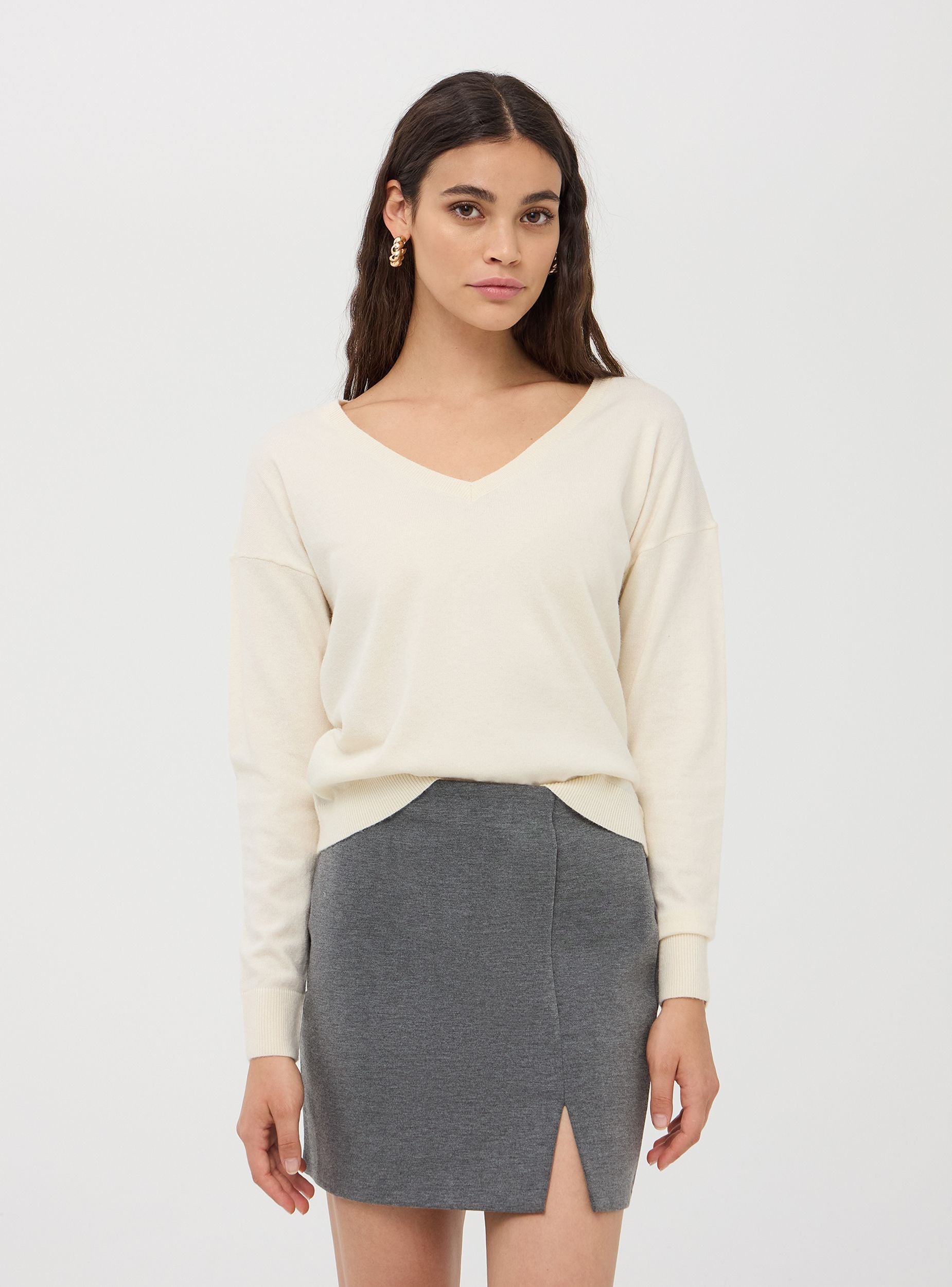 Maglia da donna con scollo a V e dettagli a coste su polsini e orlo. Garantisce morbidezza e comfort, perfetto per abbinamenti versatili. La vestibilità comoda e lo stile minimal lo rendono ideale sia per occasioni casual che per un look da ufficio elegante. Un capo must-have per ogni guardaroba.