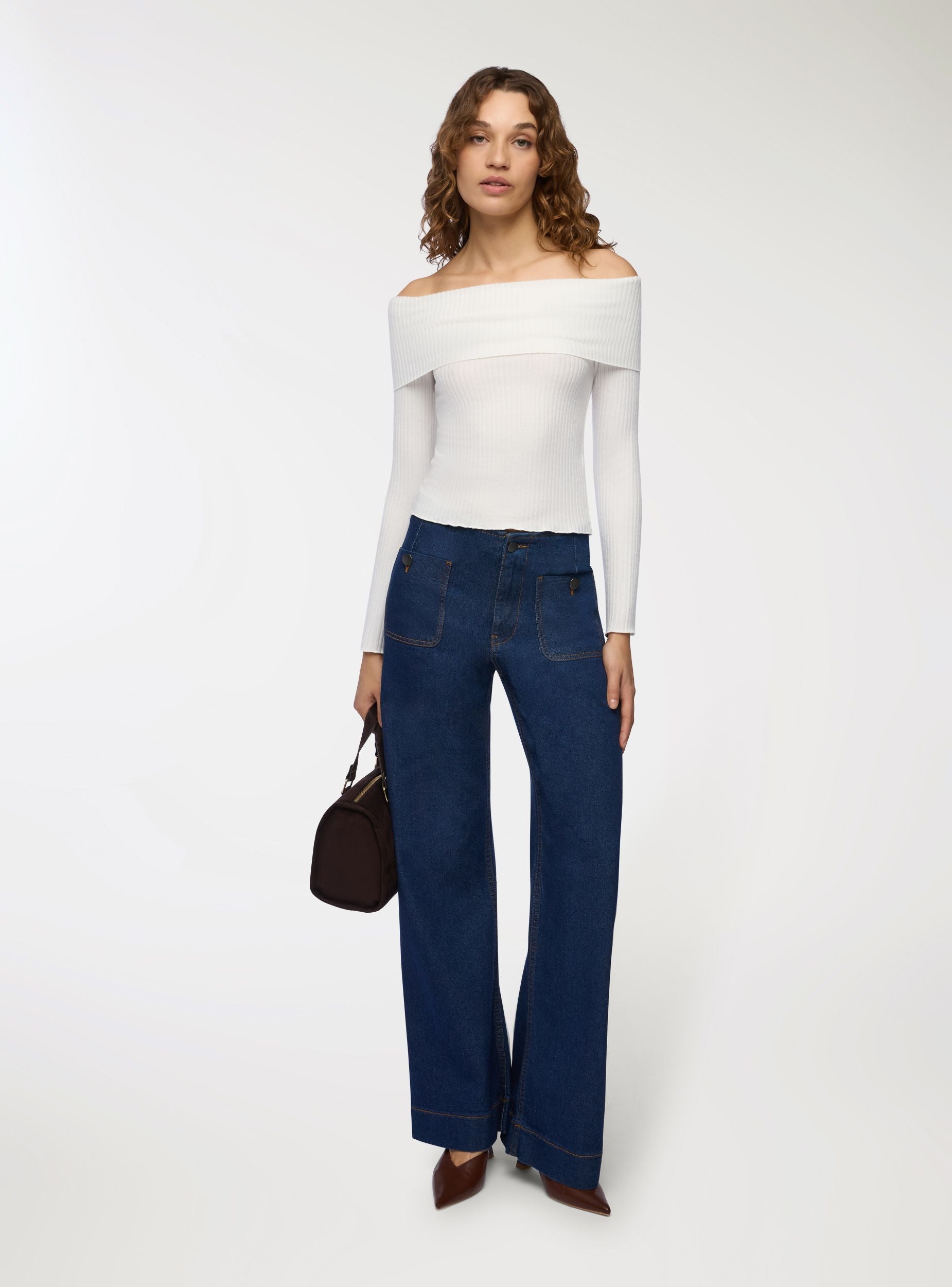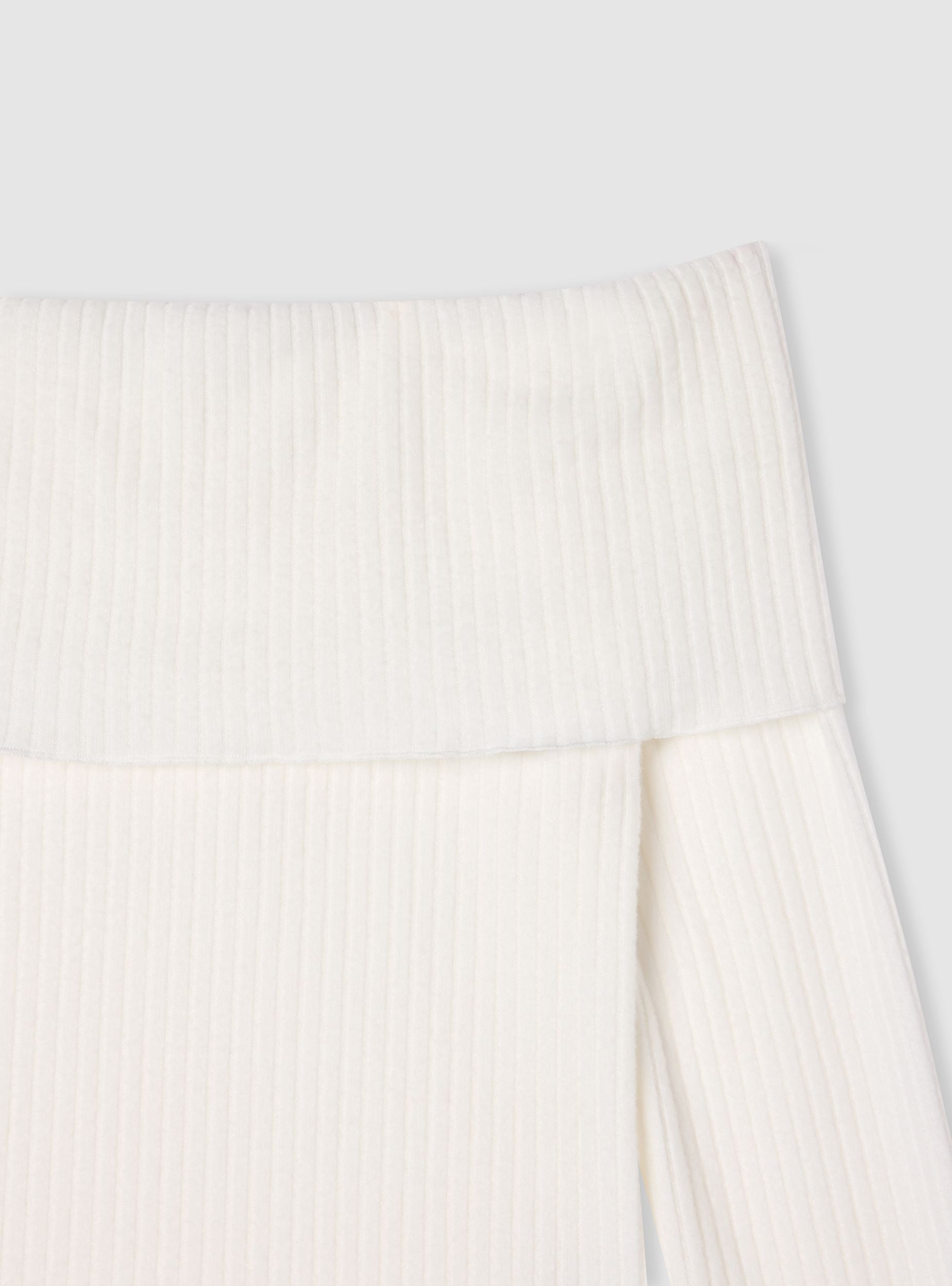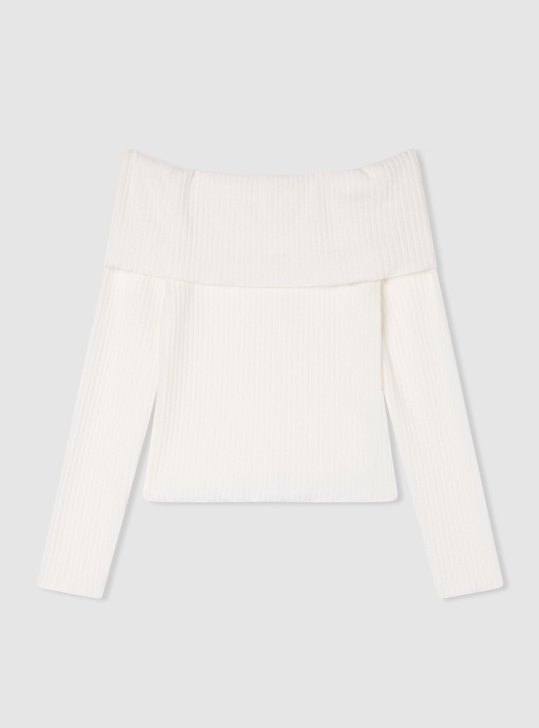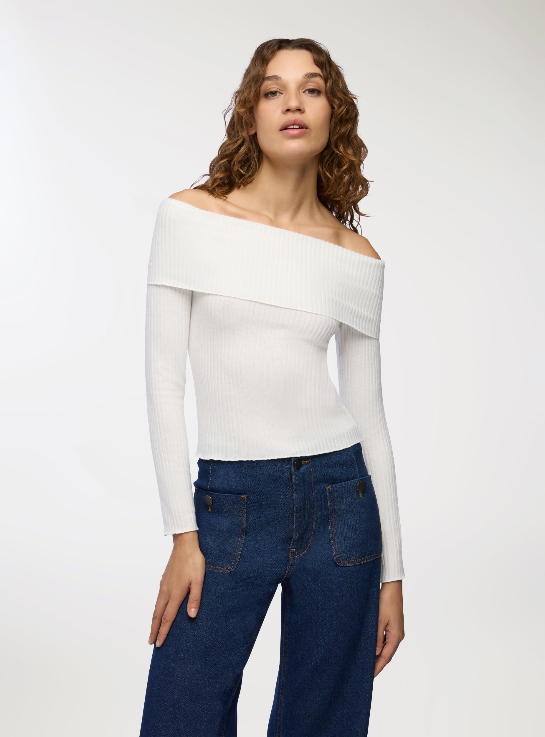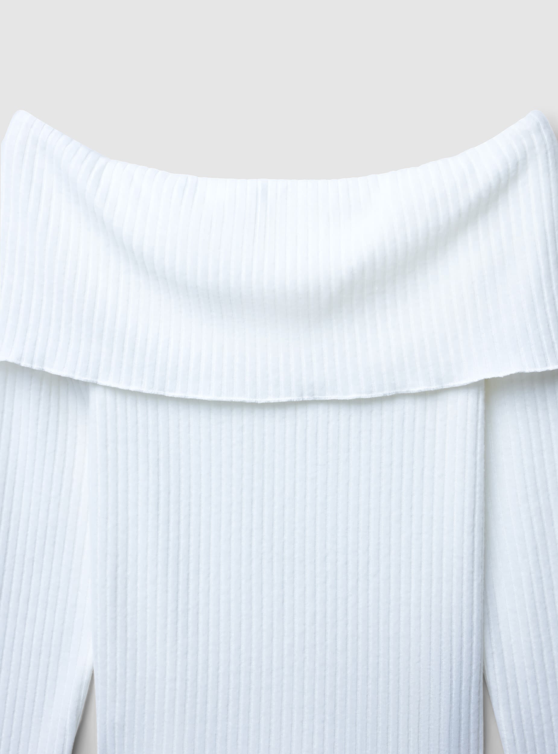 Tessuto caldo. Maglietta da donna con maniche lunghe e design a spalle scoperte. Perfetta per un look casual e moderno, questa maglietta a coste si distingue per il suo stile versatile e la vestibilità comoda. Ideale per abbinamenti con jeans o gonne, si adatta a diverse occasioni, dal tempo libero a incontri informali. Il design tinta unita la rende facile da combinare con altri capi.