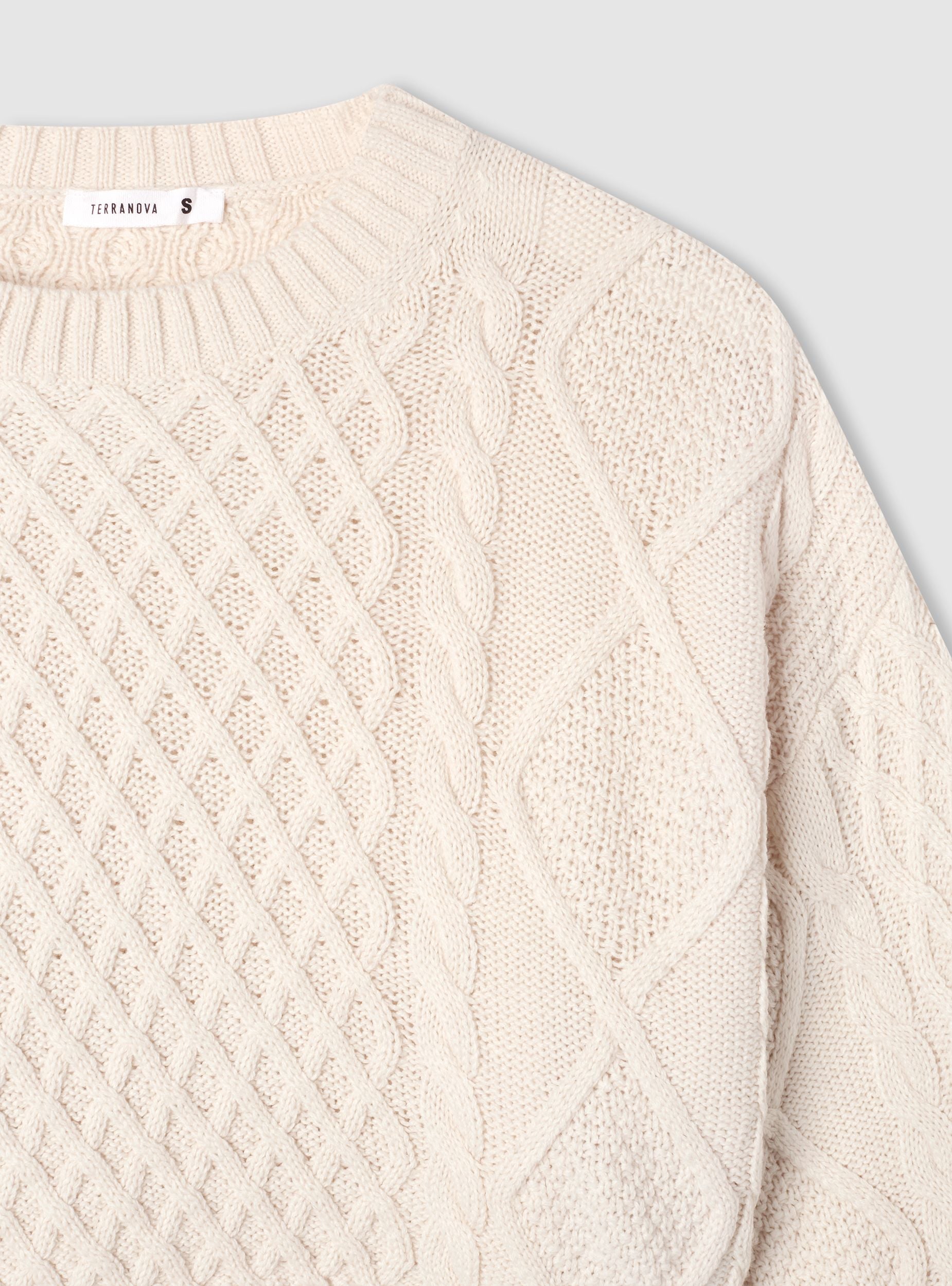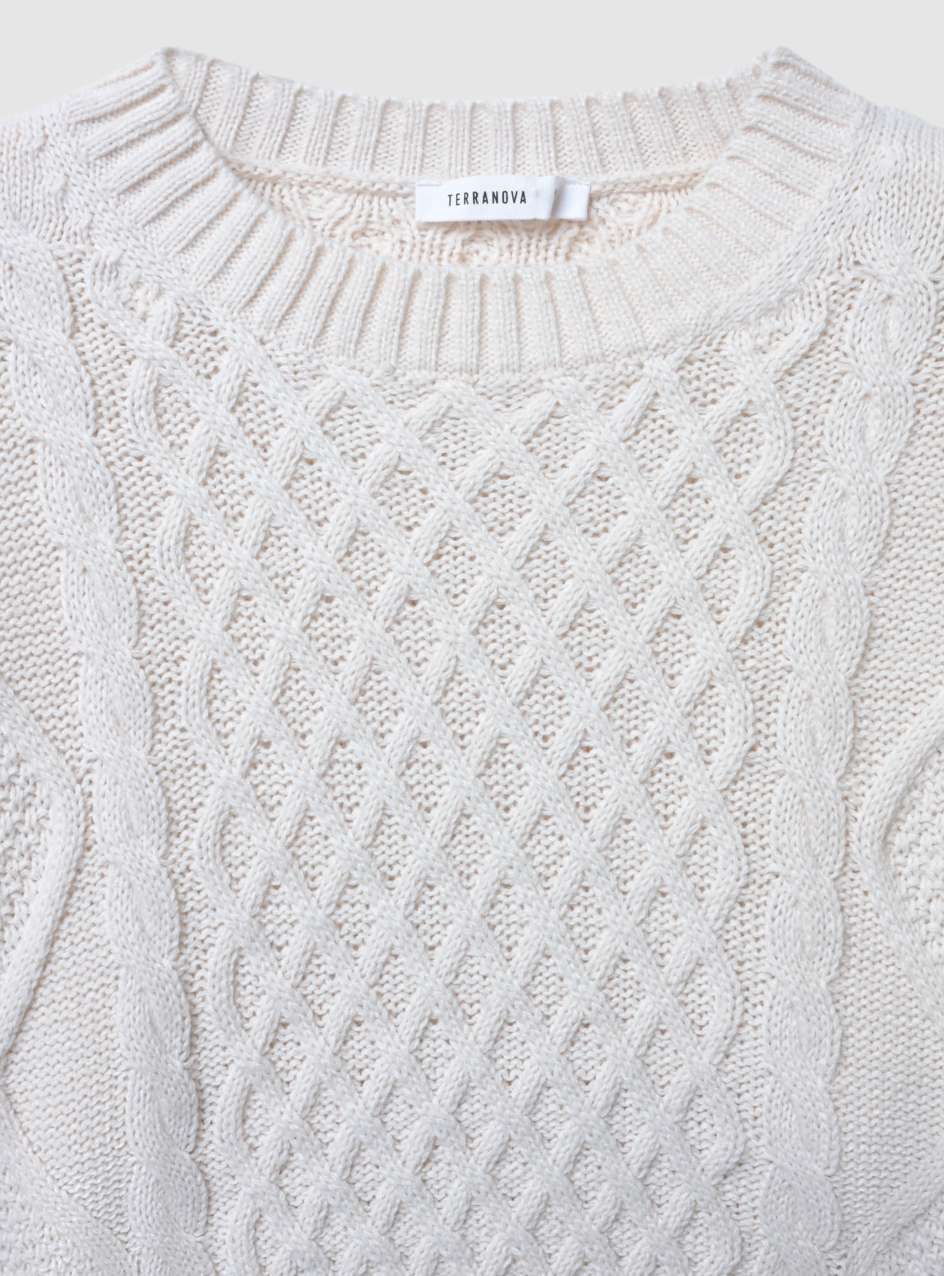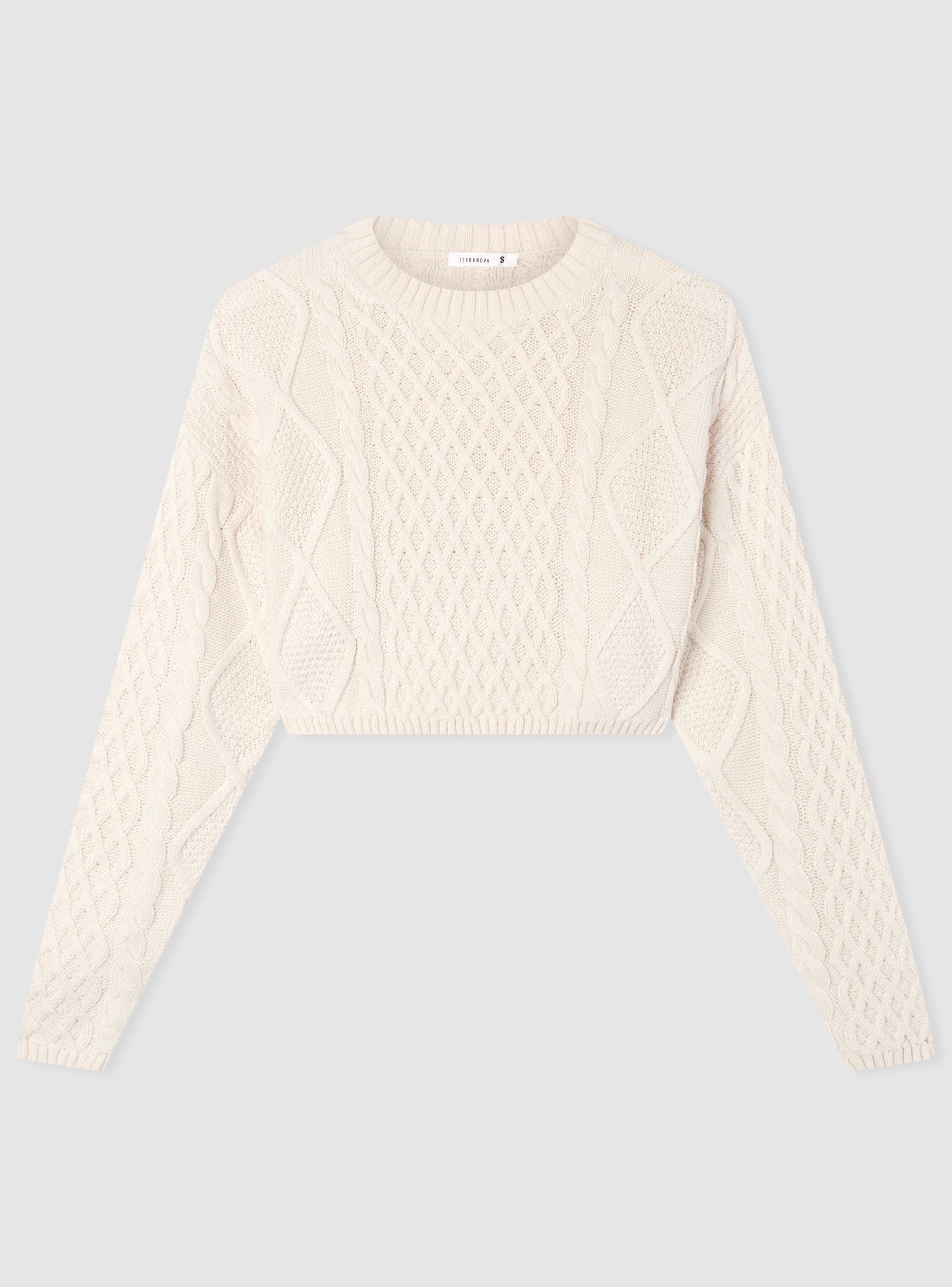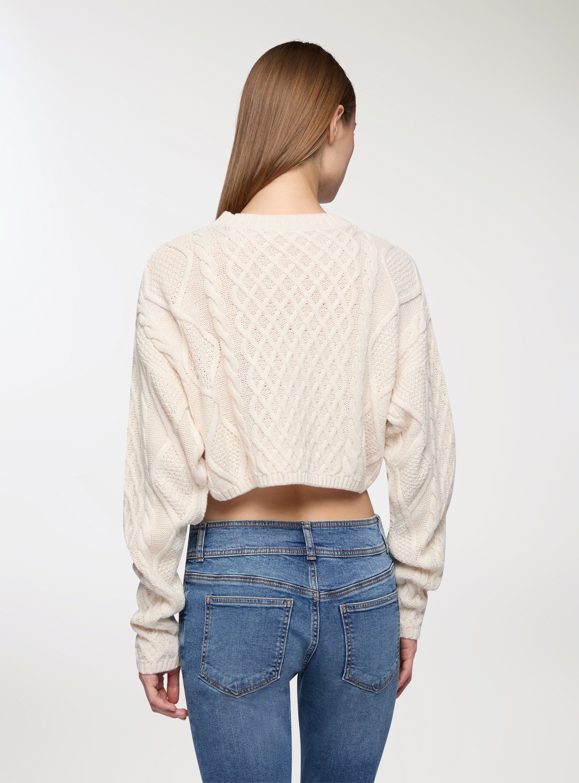 Maglia da donna con design crop e lavorazione a trecce. Ideale per un look casual e moderno, si abbina perfettamente a jeans o pantaloni a vita alta. La vestibilità corta e ampia, e il motivo intrecciato aggiungono un tocco di stile unico, rendendola perfetta per occasioni informali o per un outfit quotidiano.