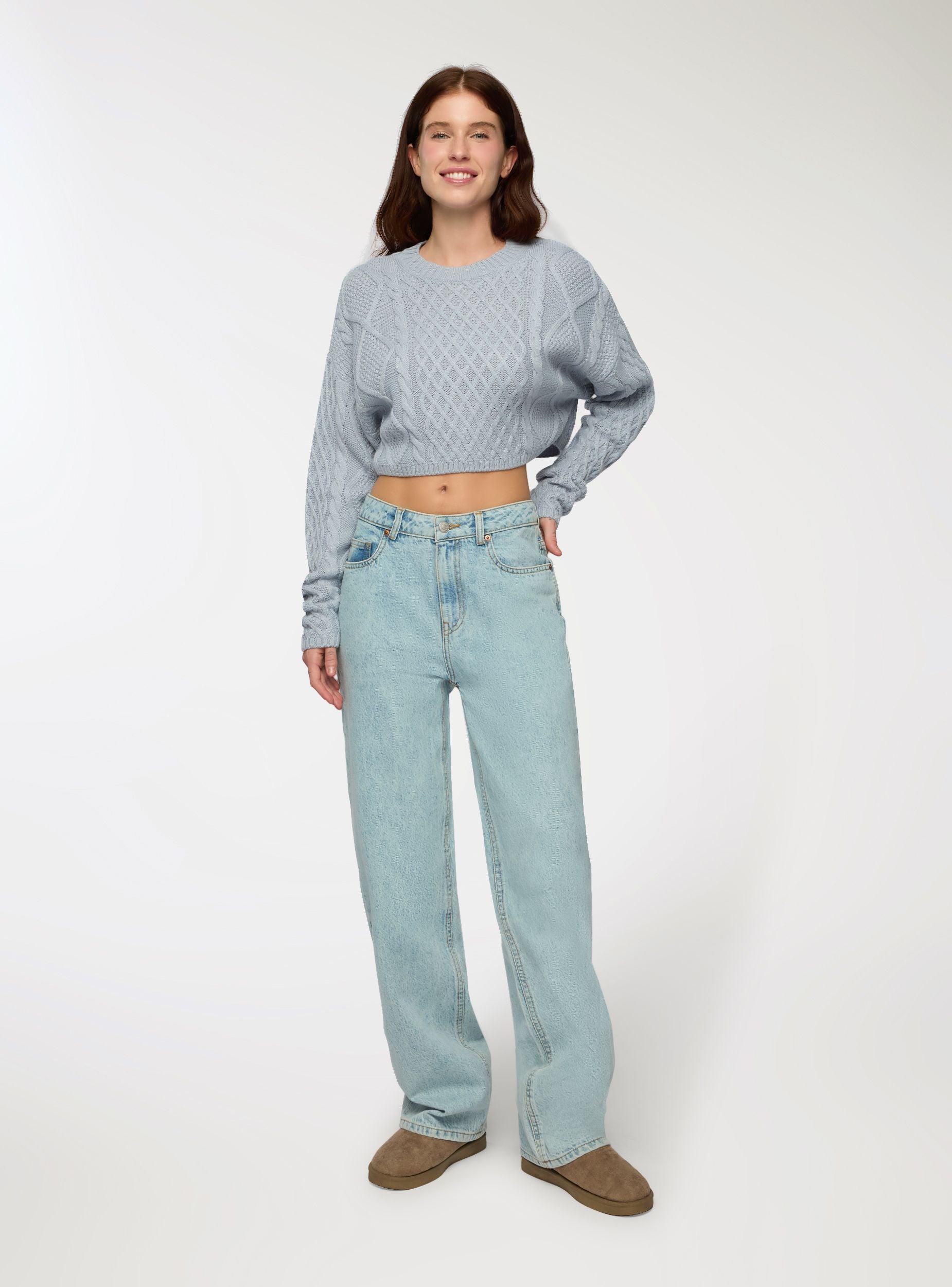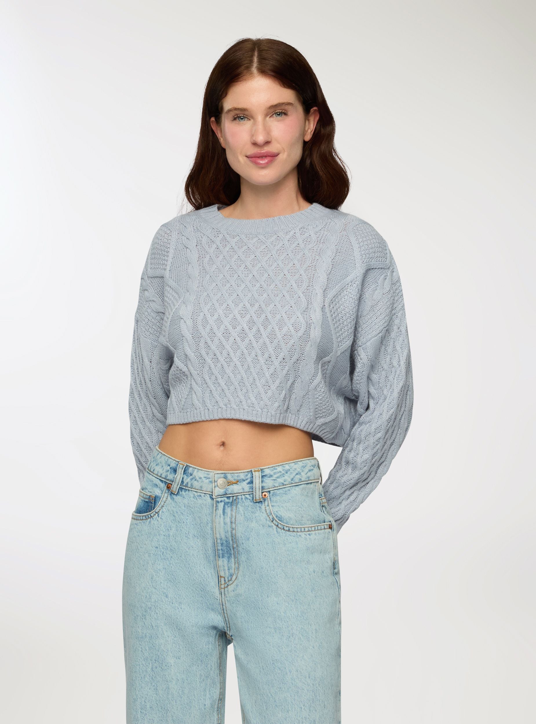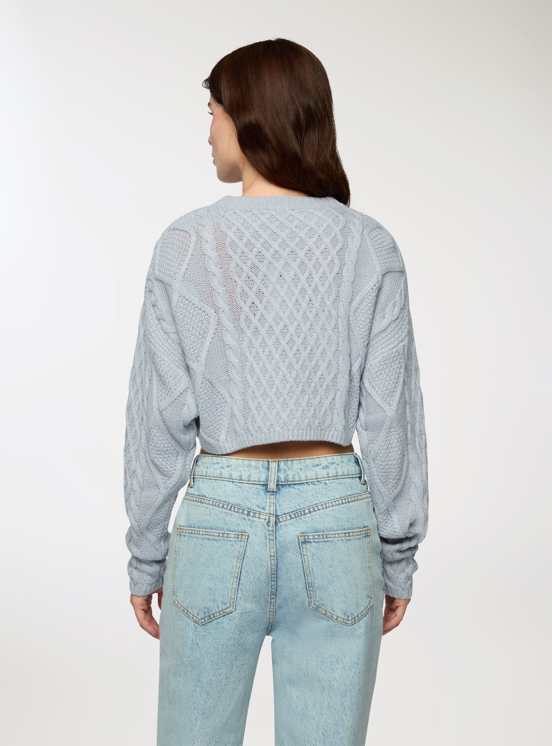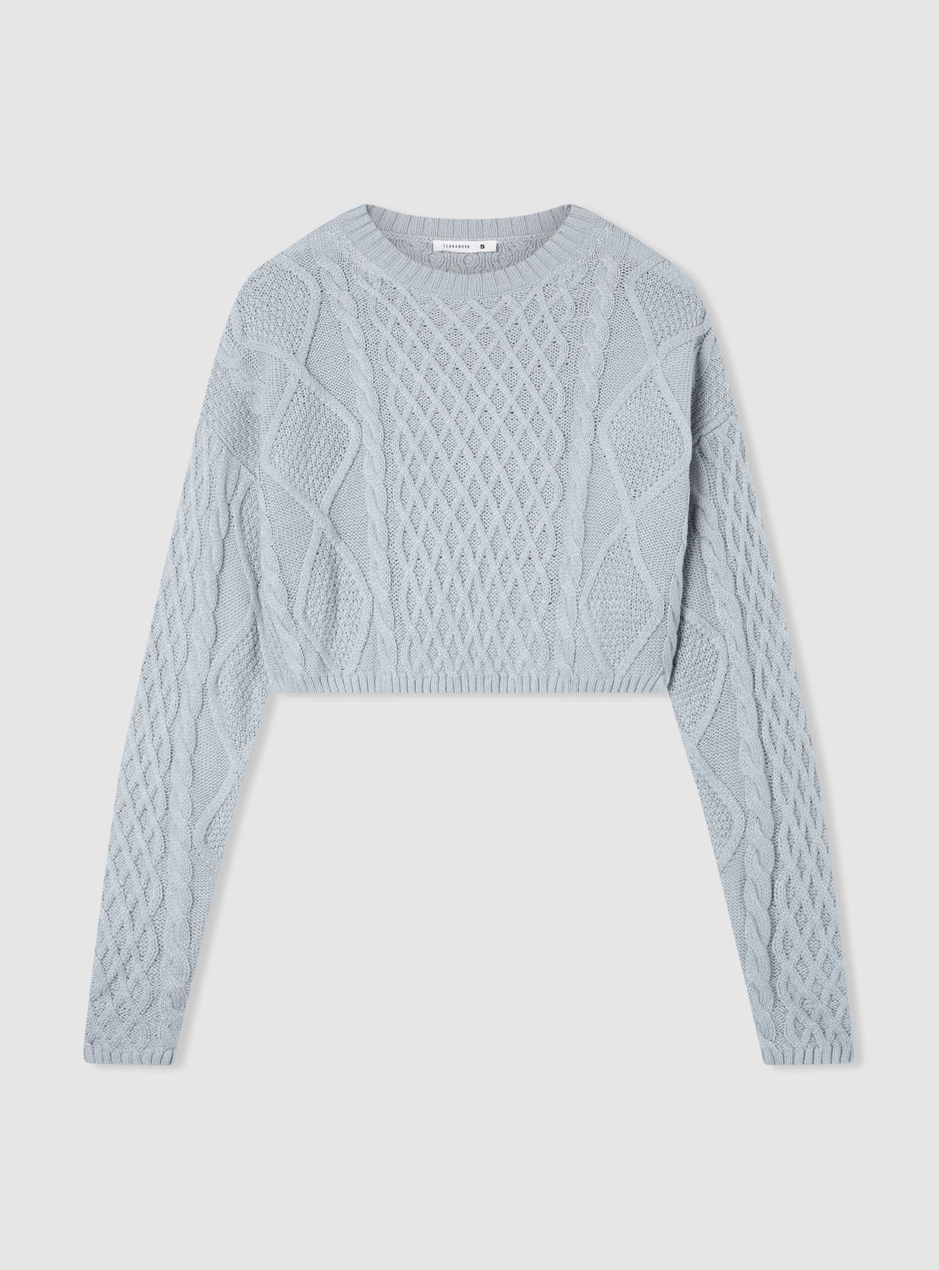 Maglia da donna con design crop e lavorazione a trecce. Ideale per un look casual e moderno, si abbina perfettamente a jeans o pantaloni a vita alta. La vestibilità corta e ampia, e il motivo intrecciato aggiungono un tocco di stile unico, rendendola perfetta per occasioni informali o per un outfit quotidiano.