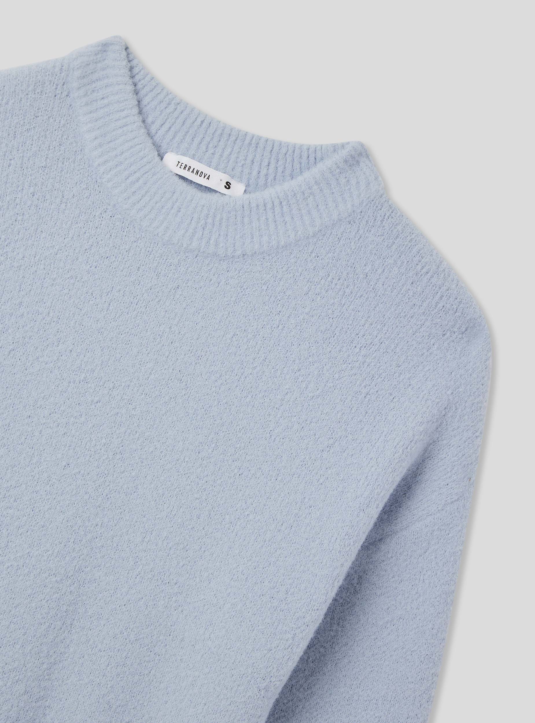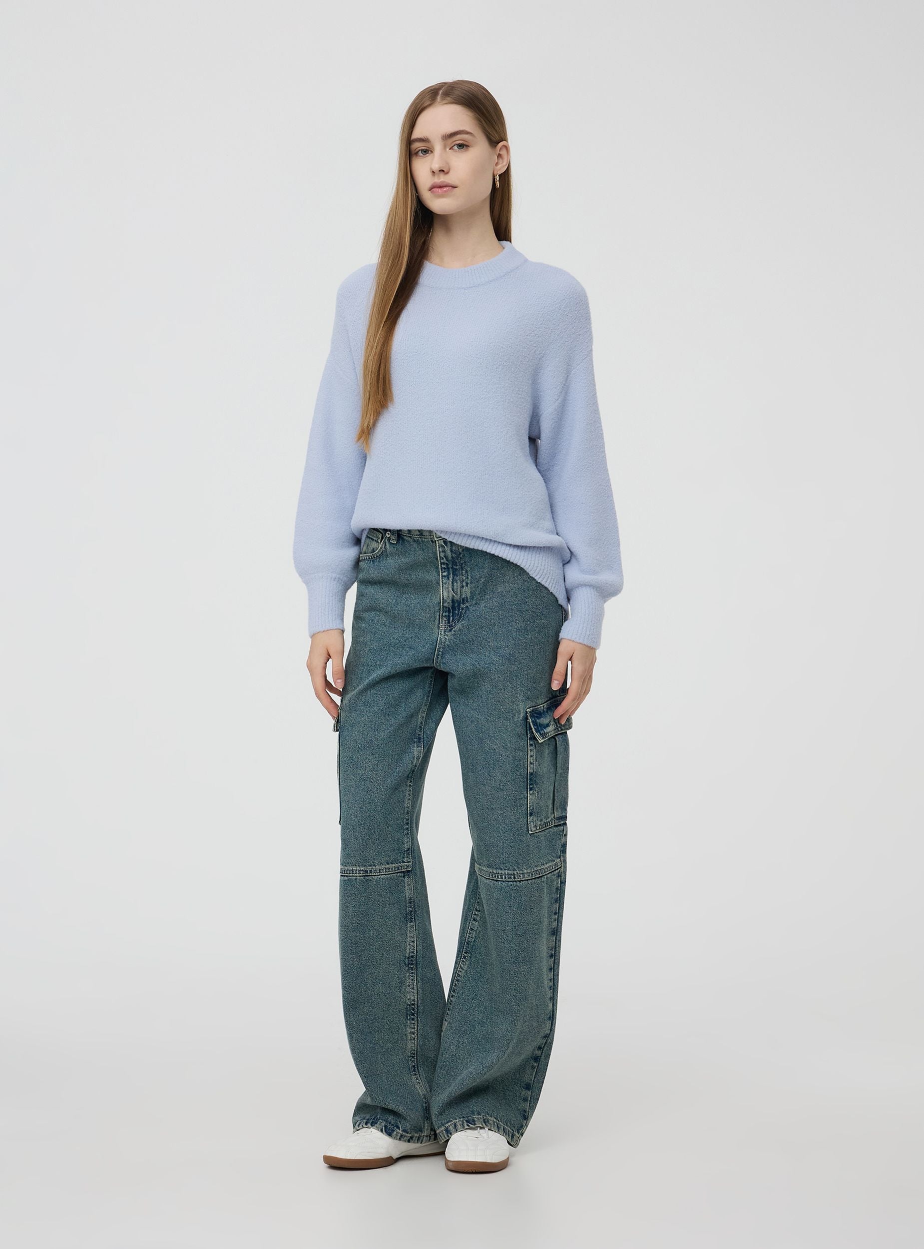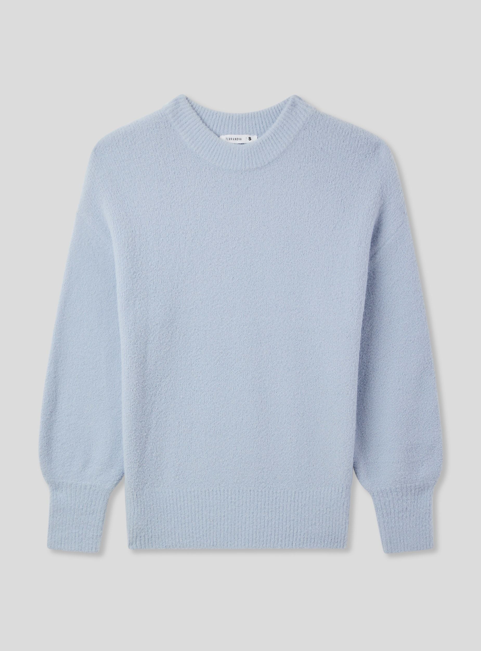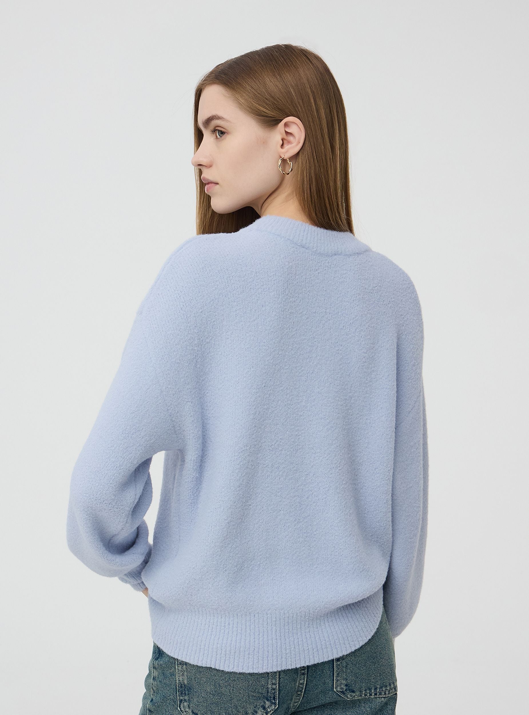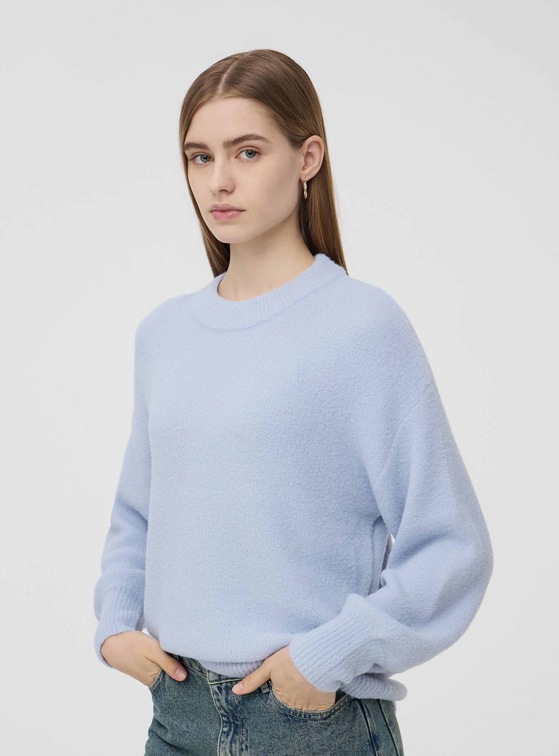 Maglia da donna con maniche a palloncino, caratterizzata da una vestibilità comoda e rilassata. Tessuto effetto pelo a tinta unita. Il design presenta una linea semplice e pulita, con dettagli a coste sui polsini, sull'orlo inferiore e sul girocollo. Le maniche lunghe a palloncino aggiungono un tocco di eleganza e femminilità. Perfetta per la stagione invernale, offre calore e stile in un unico capo.