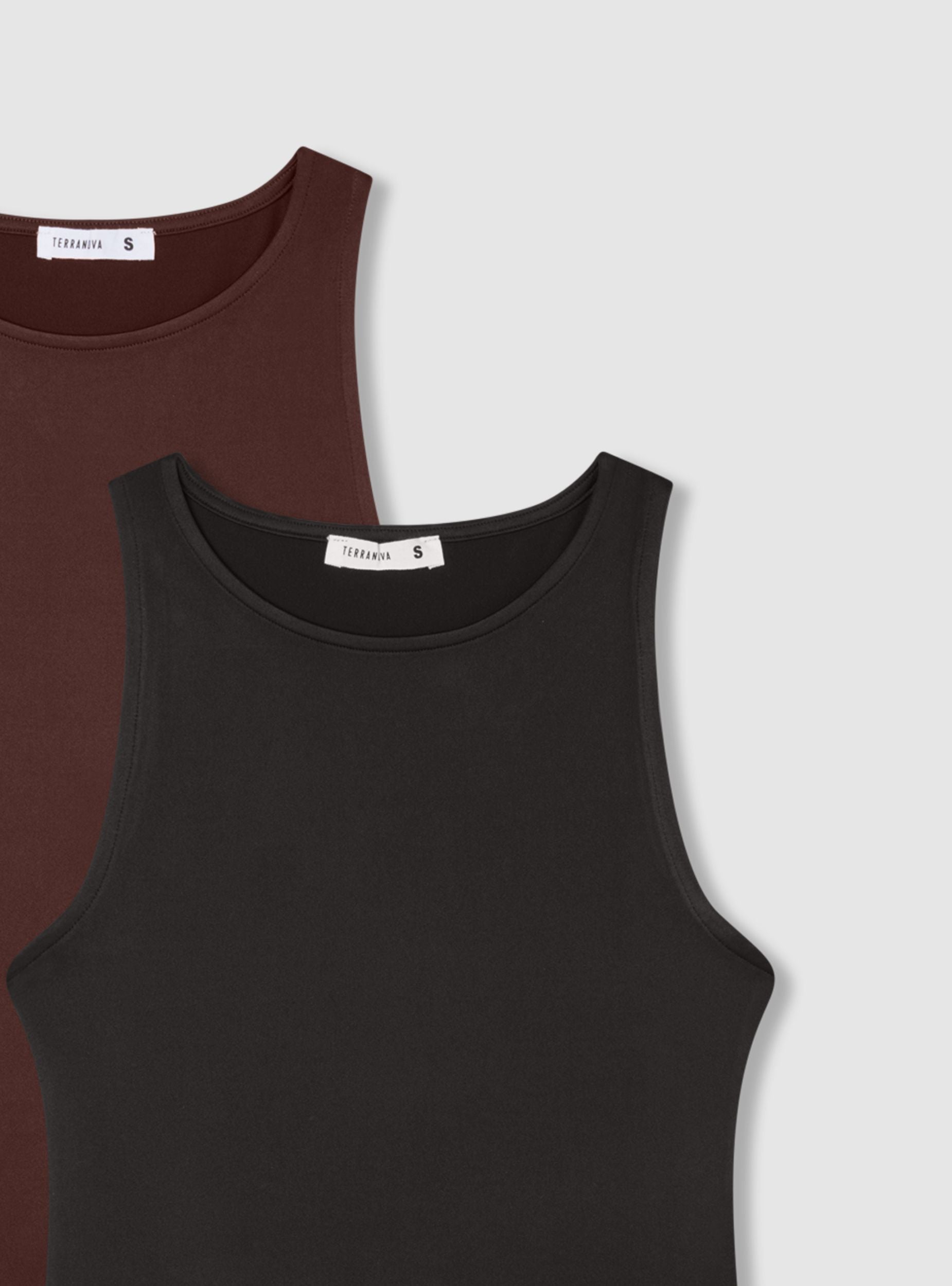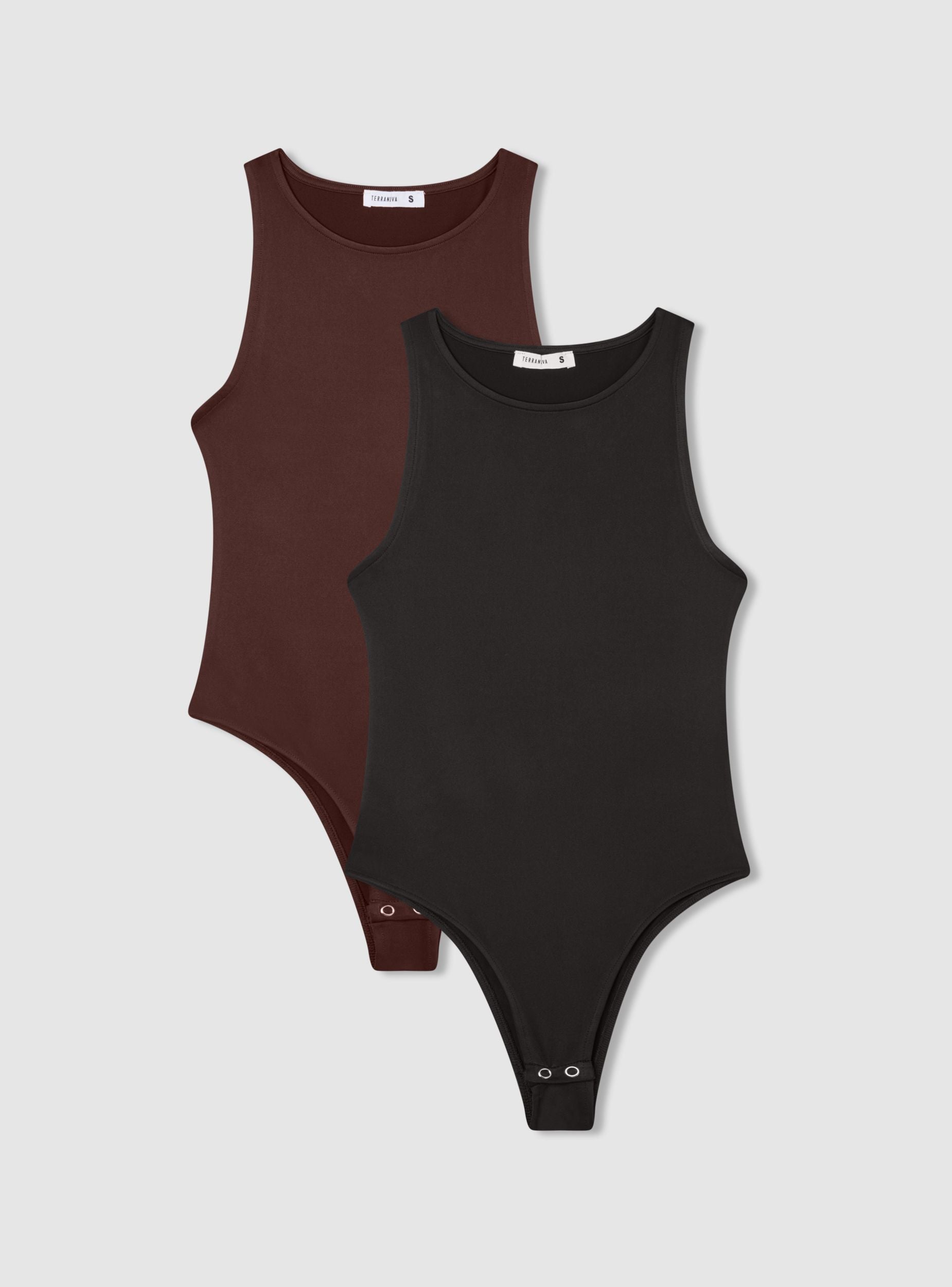 Confezione composta da due body da donna con scollo rotondo e senza maniche. Ideali per un look casual e versatile, possono essere indossati sotto giacche o cardigan oppure abbinati a pantaloni o gonne per un outfit moderno e comodo. La chiusura con bottoni a pressione garantisce praticità e comfort durante l'uso. Perfetti per diverse occasioni, offrono una vestibilità aderente e un design essenziale.