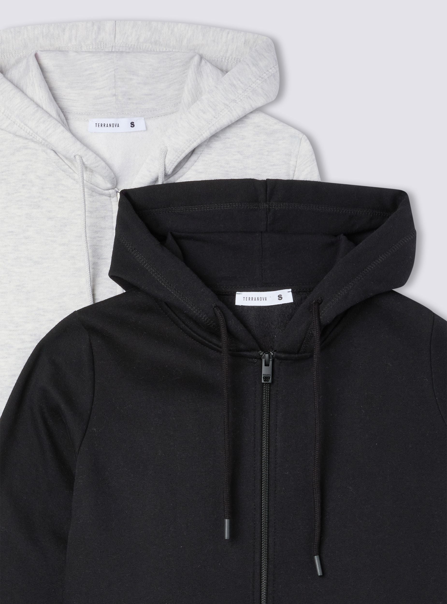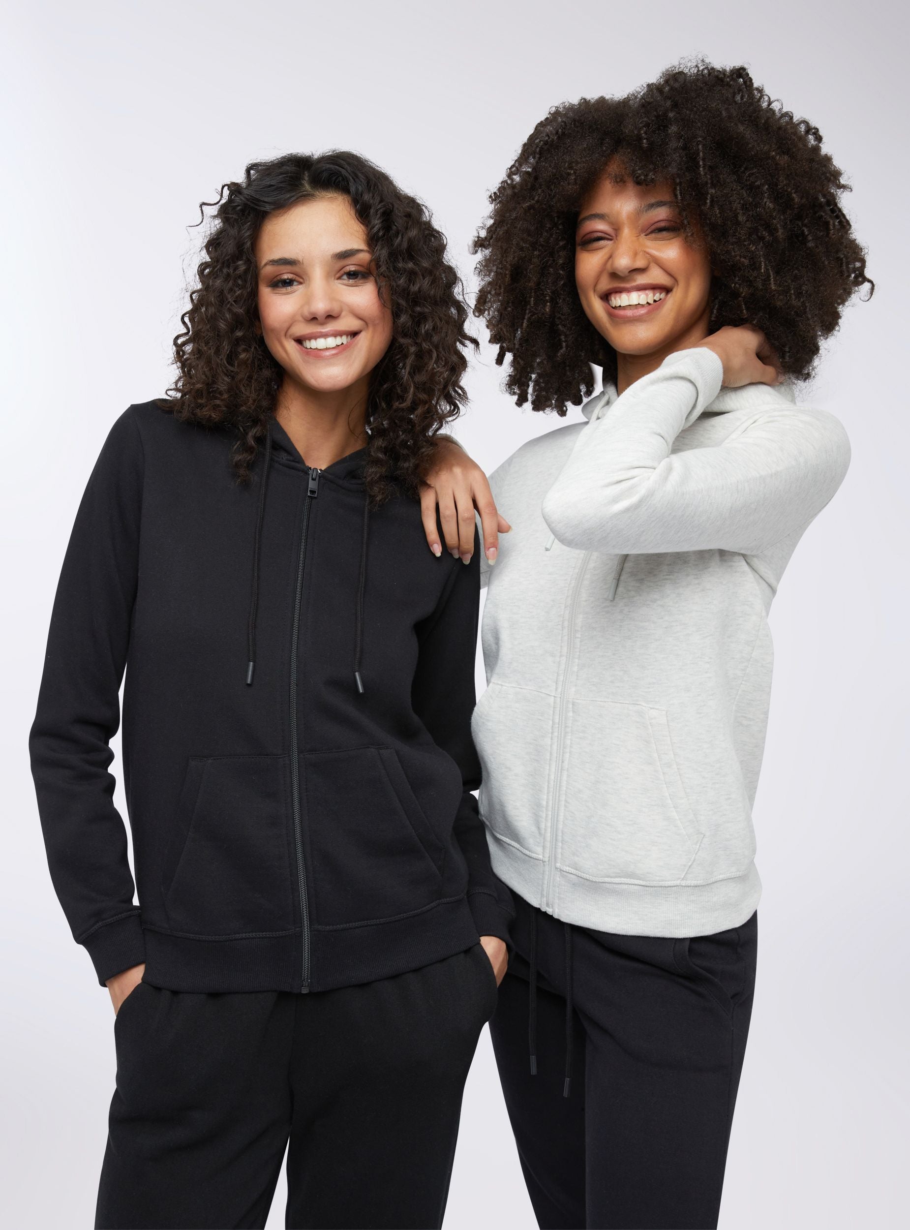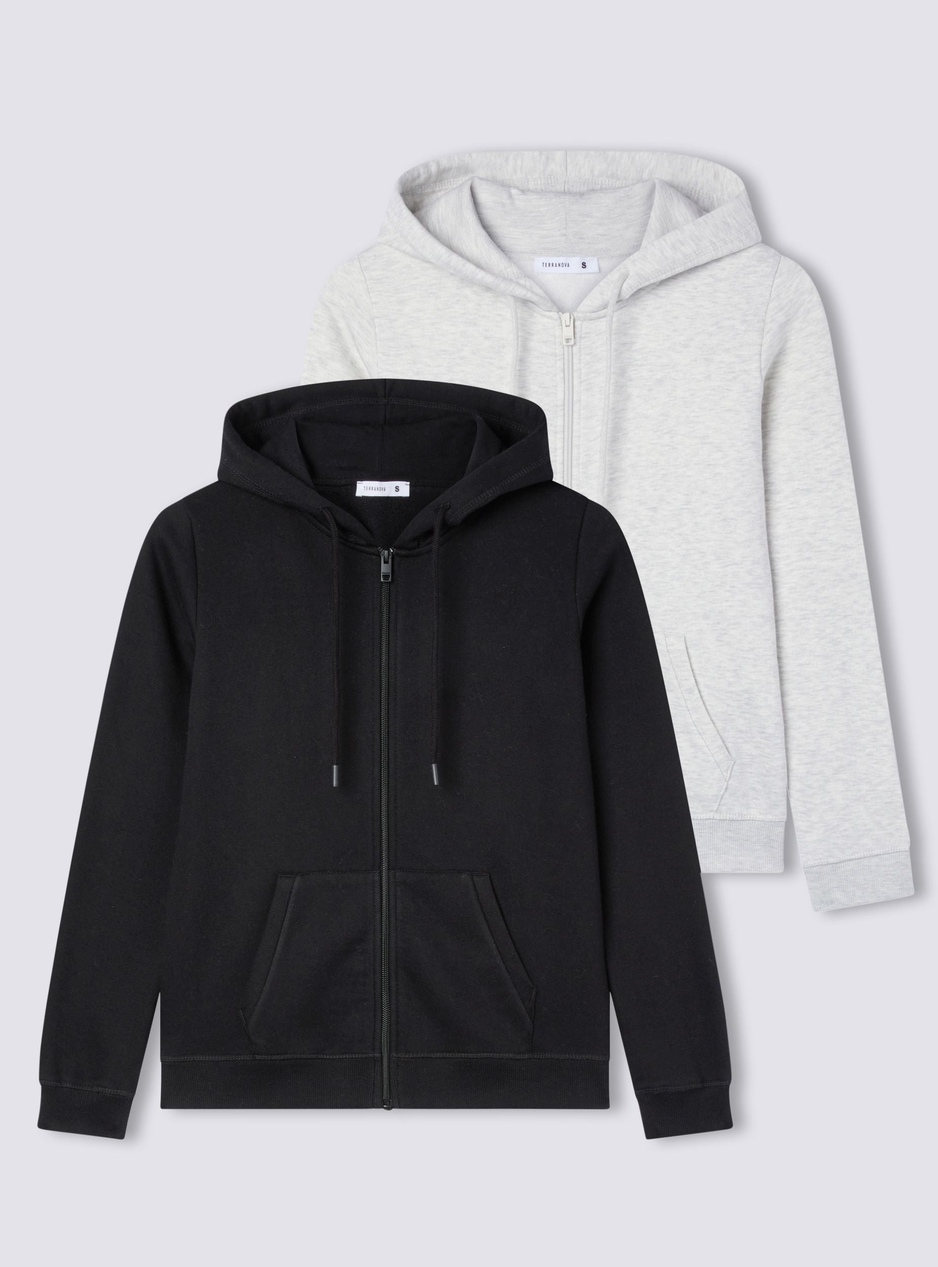 Confezione composta da 2 felpe da donna ideali per un look casual e confortevole durante le giornate più fresche. Caratterizzate da design a tinta unita, maniche lunghe e pratico cappuccio con coulisse regolabile, offrono uno stile versatile e funzionale. La chiusura con zip frontale e le comode tasche laterali le rendono perfette per il tempo libero e le attività all'aperto. Il tessuto pesante assicura calore e comfort, mentre la vestibilità rilassata si adatta a qualsiasi occasione informale.