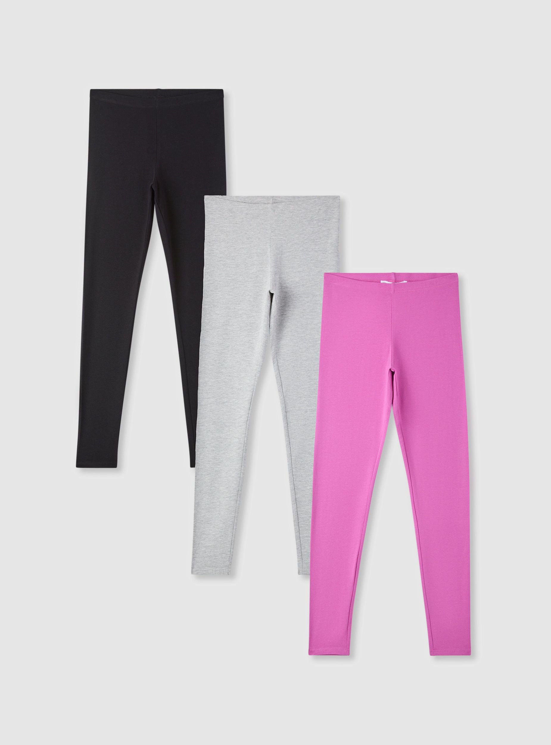 Confezione composta da 3 leggings da bambina a tinta unita, realizzati con tessuto elasticizzato per garantire comfort e libertà di movimento. Ogni leggings è dotato di elastico in vita, offrendo una vestibilità comoda e stabile durante tutta la giornata. Perfetti per essere indossati con t-shirt, maglie, felpe o abiti casual, questi leggings sono ideali per il gioco, le attività scolastiche o il tempo libero.