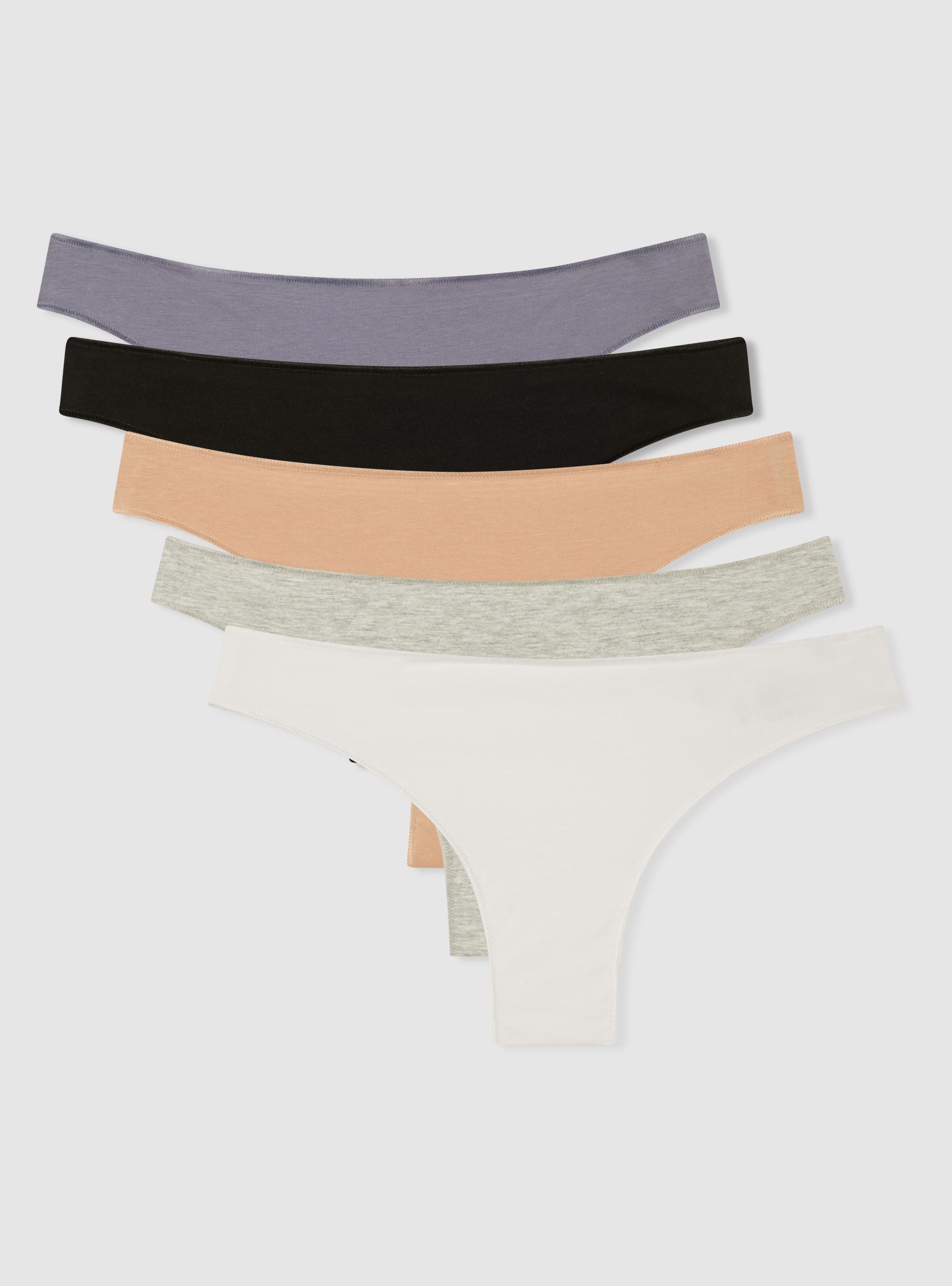 Confezione composta da 5 slip da donna con vestibilità brasiliana, ideali per un look comodo e versatile. Perfette per essere indossate sotto abiti aderenti grazie al design tinta unita e alla linea essenziale. La vestibilità garantisce comfort per tutto il giorno, rendendolo un capo indispensabile per il guardaroba quotidiano.