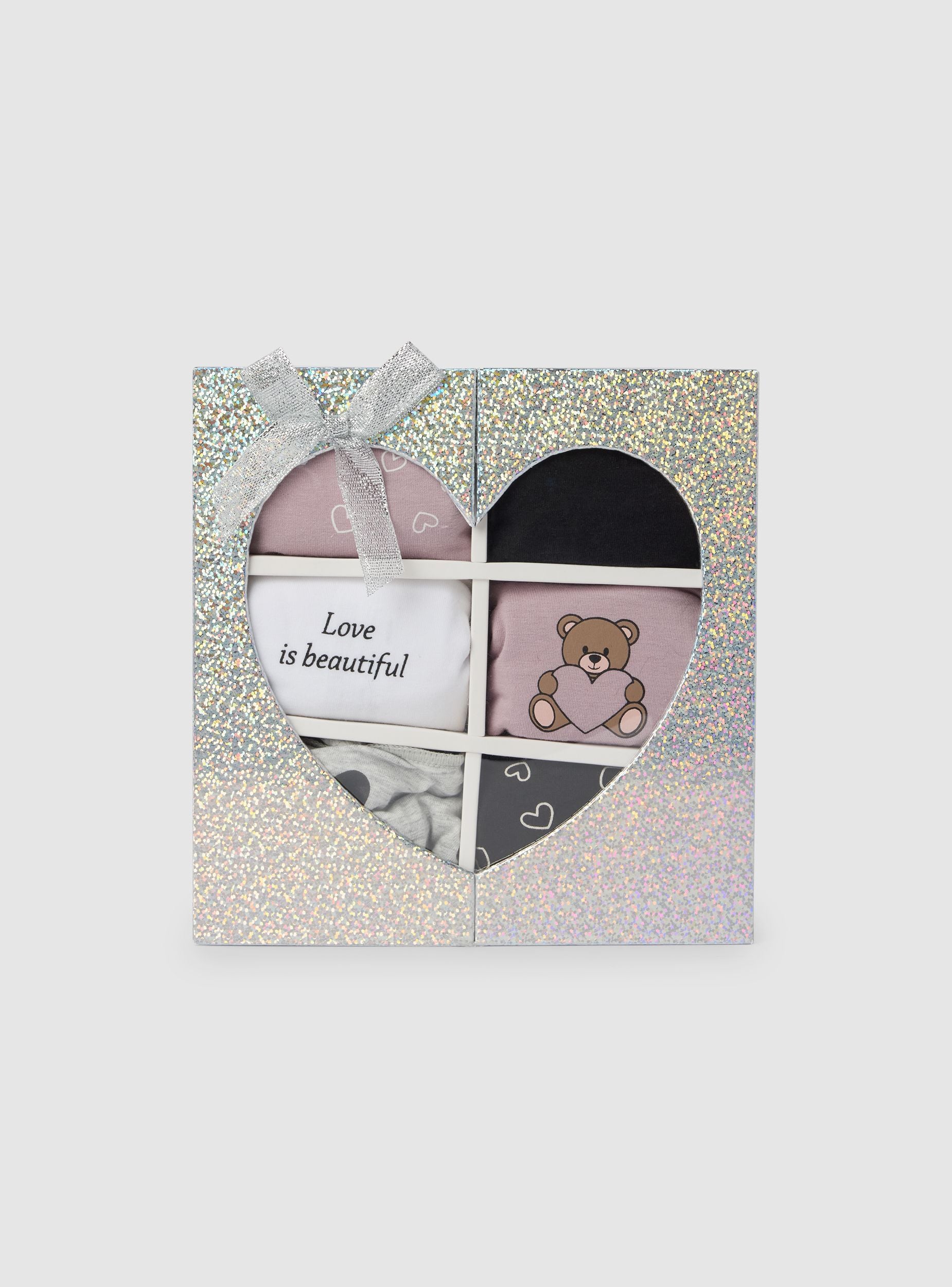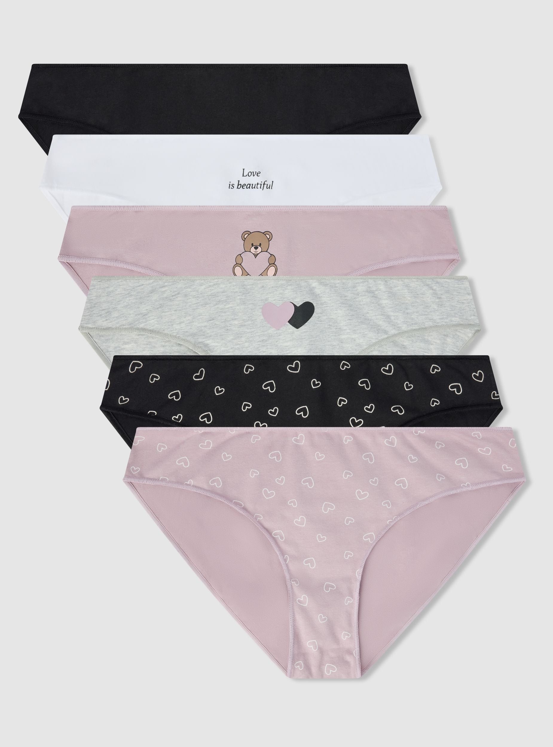 Confezione composta da 6 slip da donna, ideali per un look casual e confortevole. Ogni slip presenta un design unico con scritte e motivi decorativi, perfetti per aggiungere un tocco di stile al quotidiano. La vestibilità regolare garantisce comodità durante tutto il giorno.