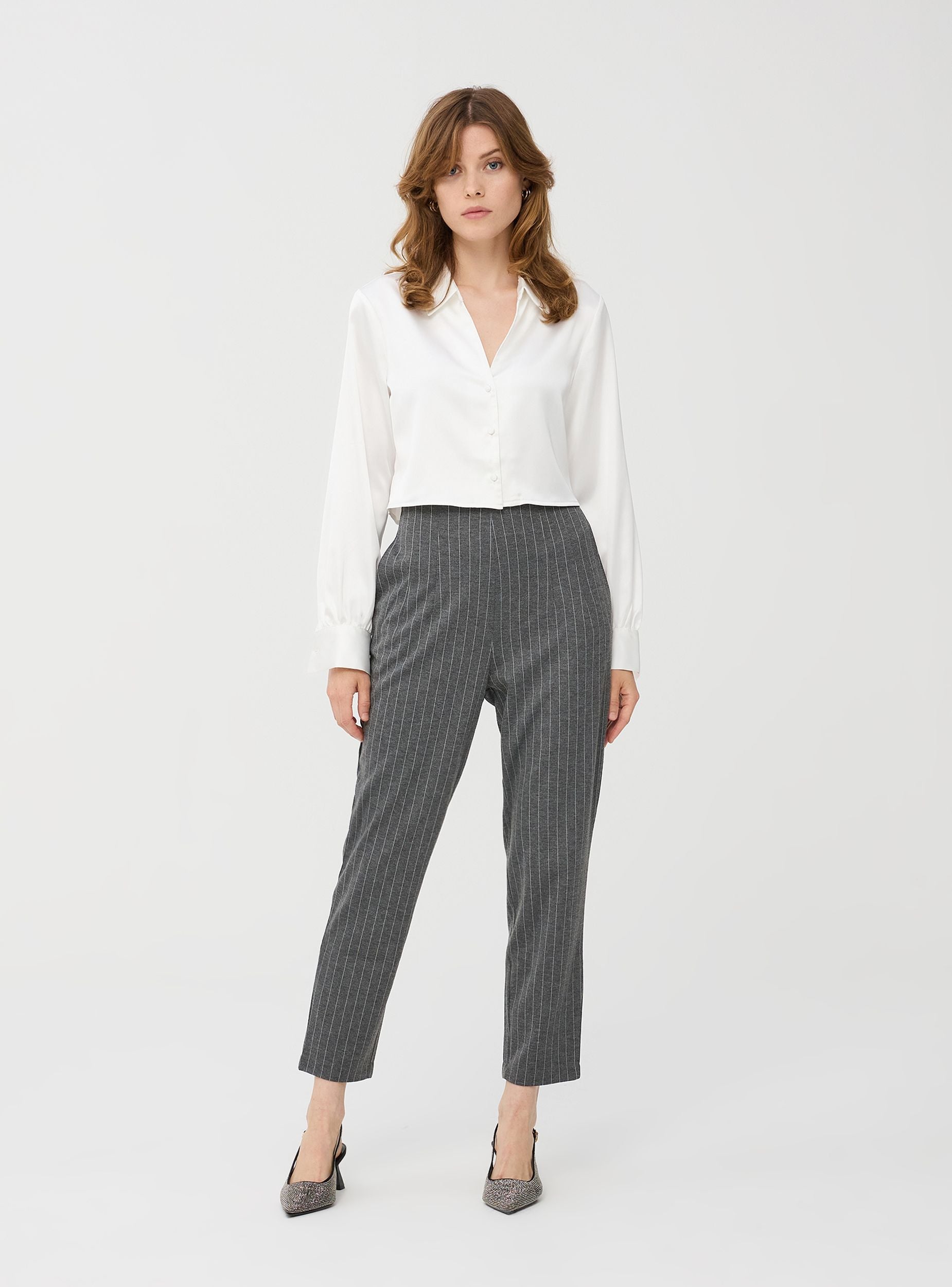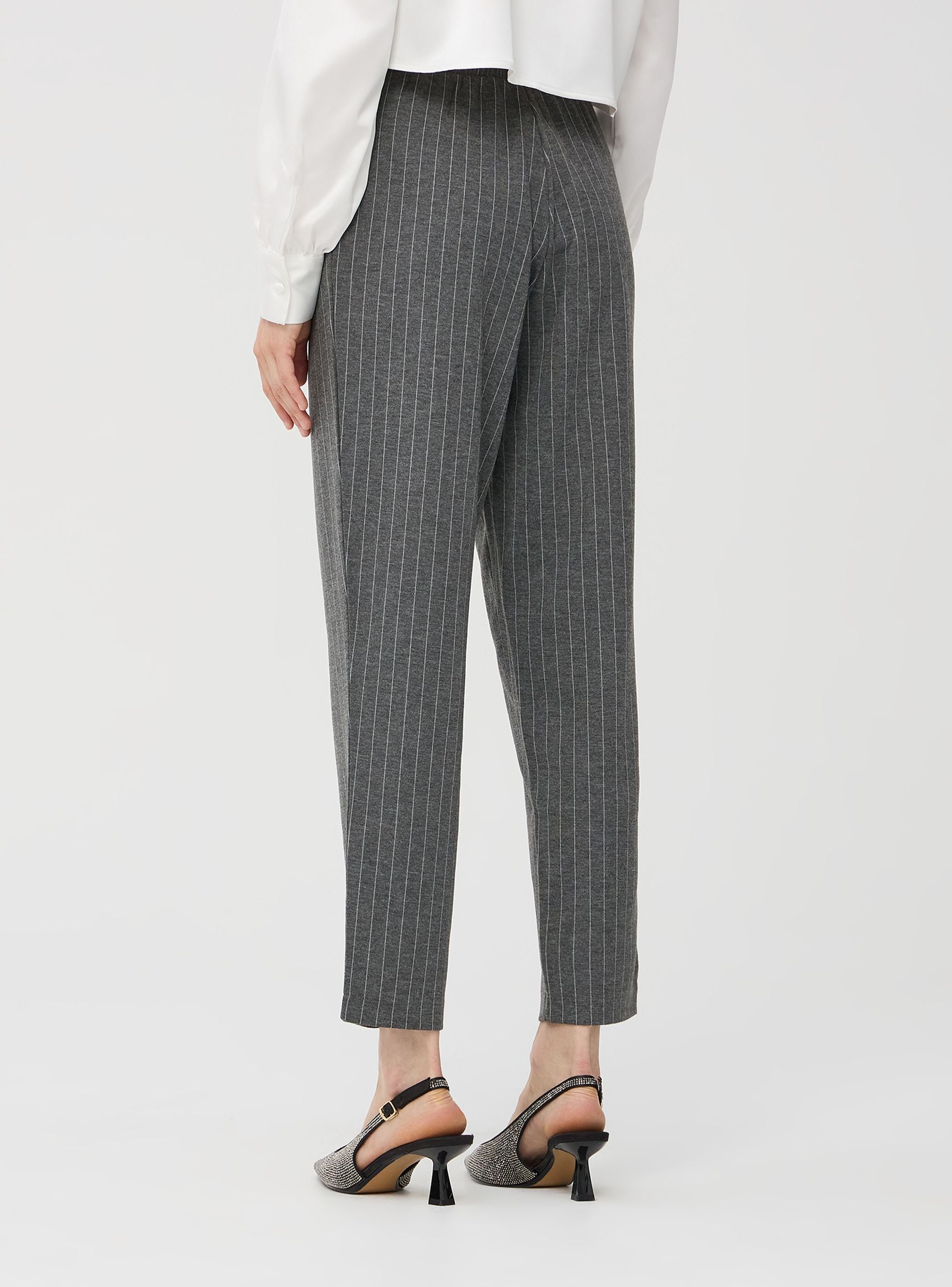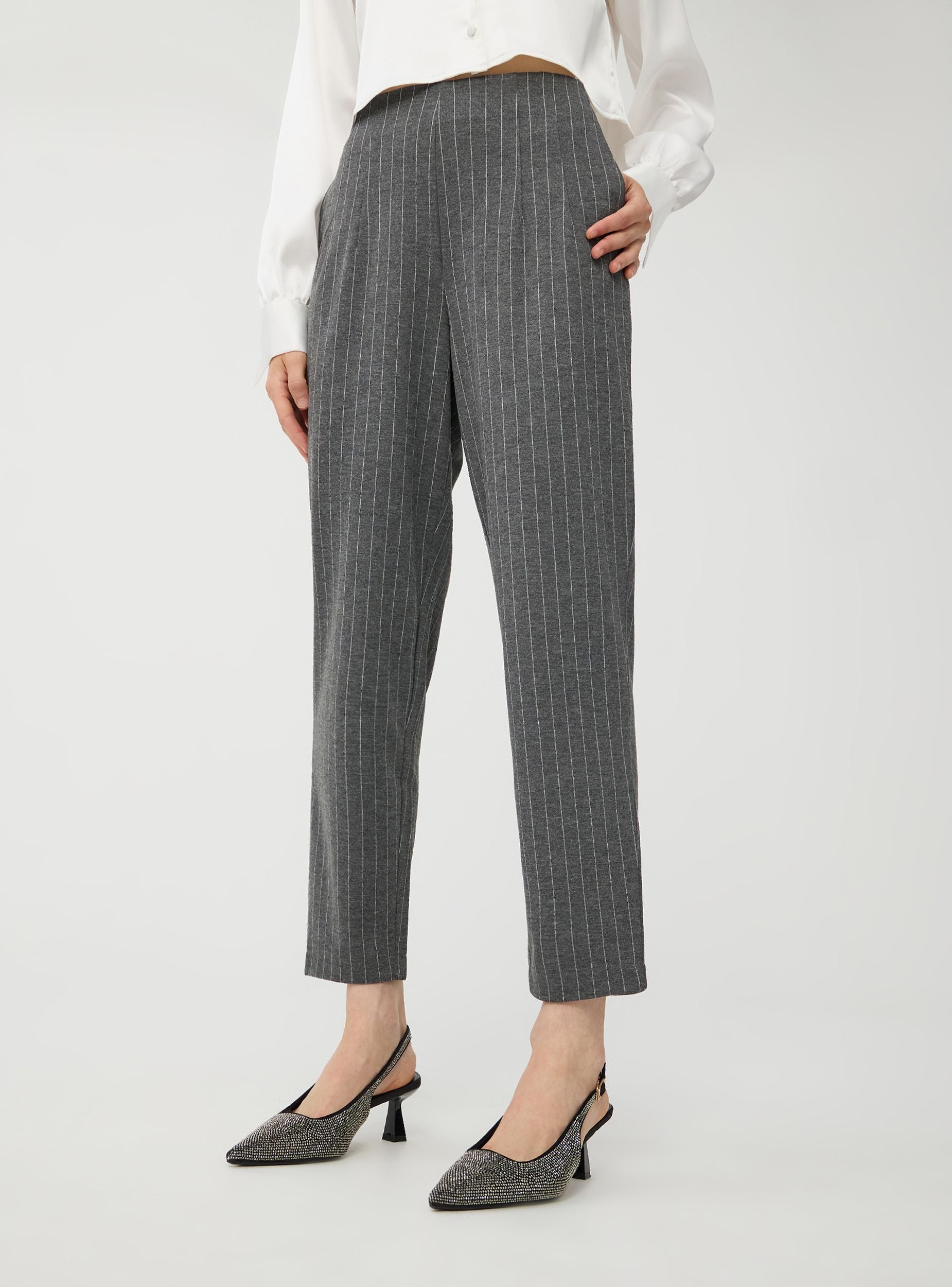 Pantaloni da donna, modello chino. Realizzati in tessuto con motivo gessato. Dotati di due tasche laterali. Facili da abbinare, perfetti per diverse occasioni. Ideali sia per occasioni casual che formali di lavoro.