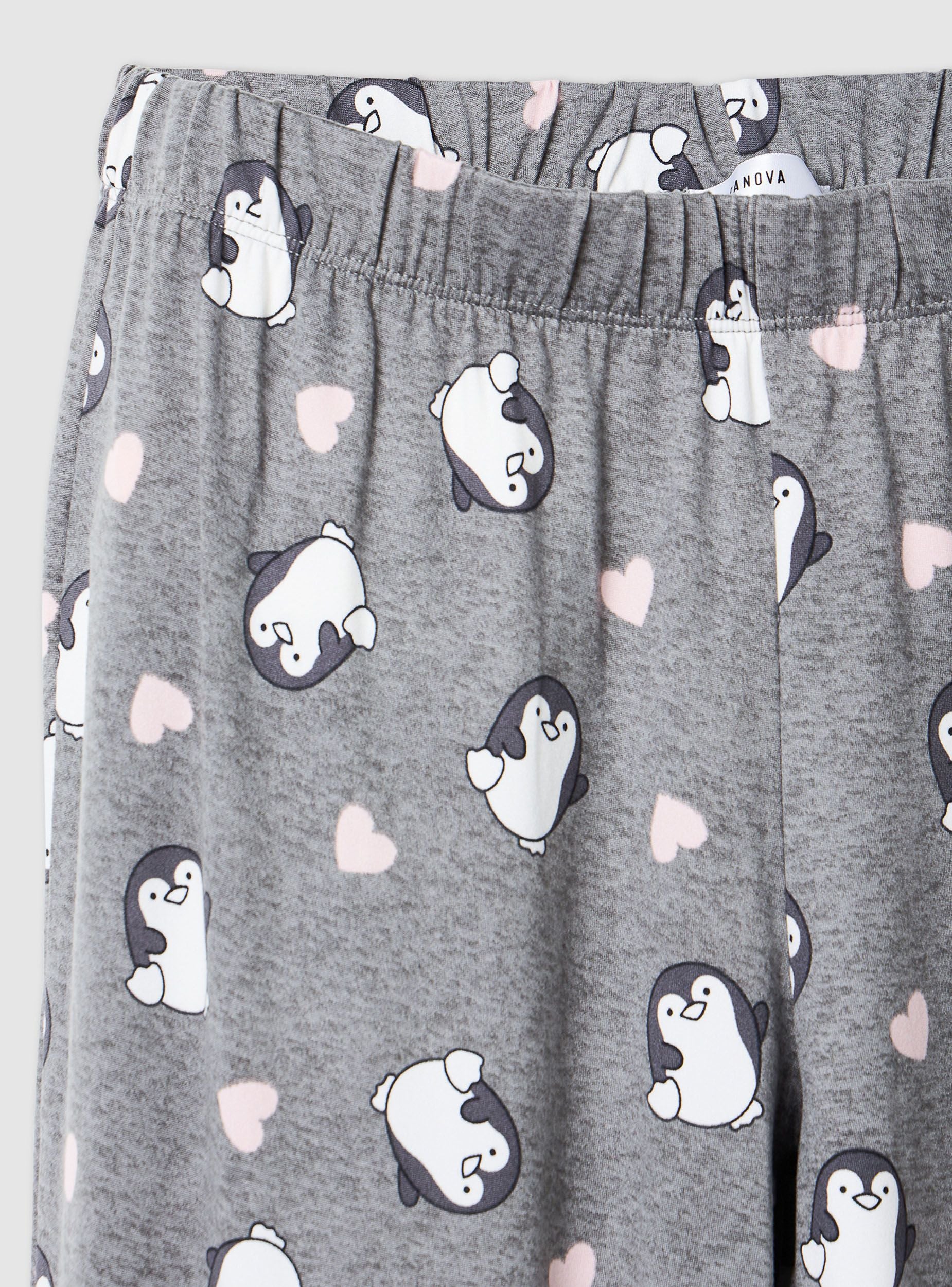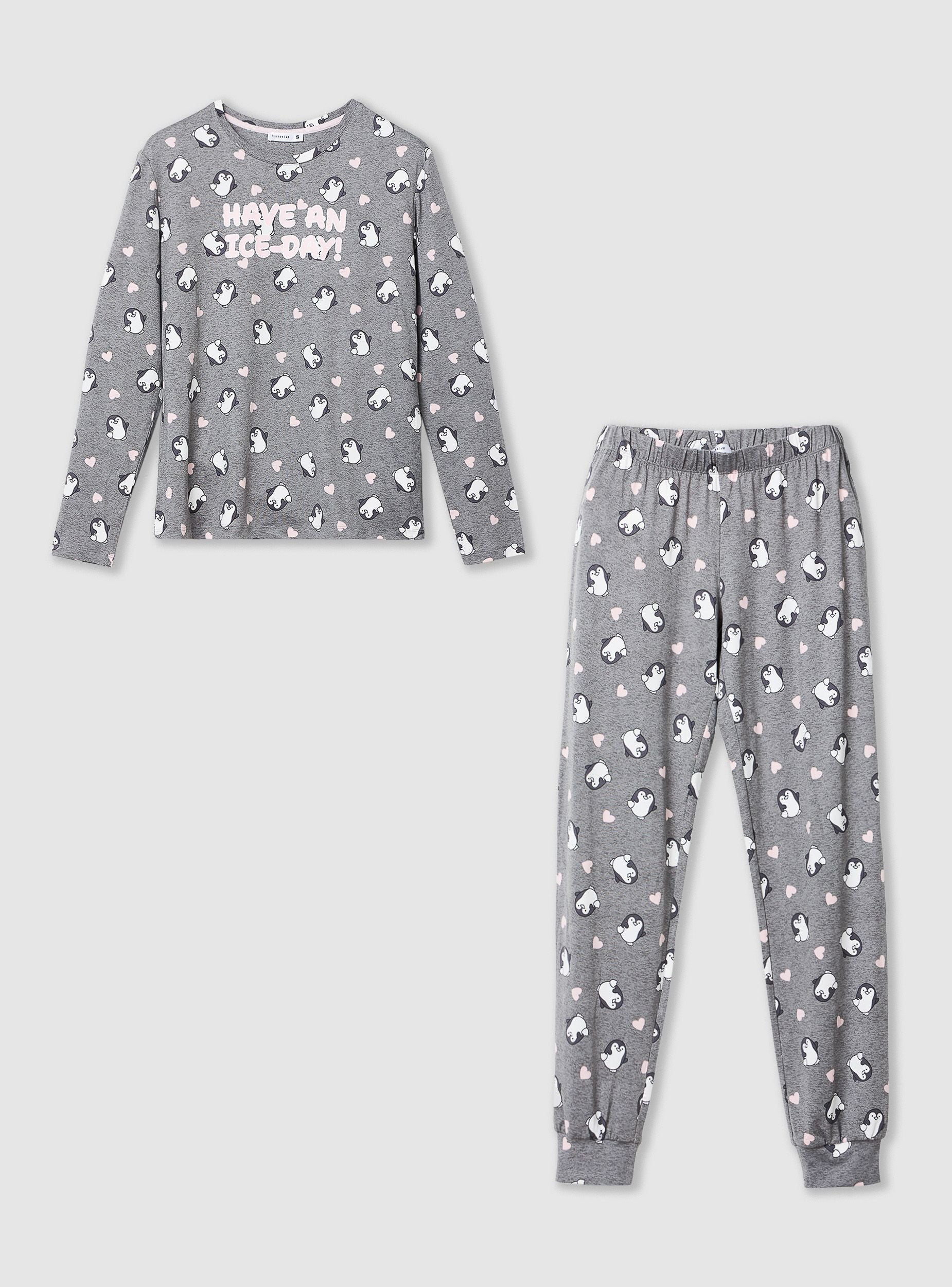 Pigiama da donna composto da maglia a maniche lunghe e pantaloni lunghi. La maglia presenta una stampa vivace con pinguini e cuori. I pantaloni, con elastico in vita, riprendono la stessa fantasia per un look coordinato. Ideale per momenti di relax in casa, offre comfort e stile grazie alla vestibilità regolare e al design accattivante.Dettagli