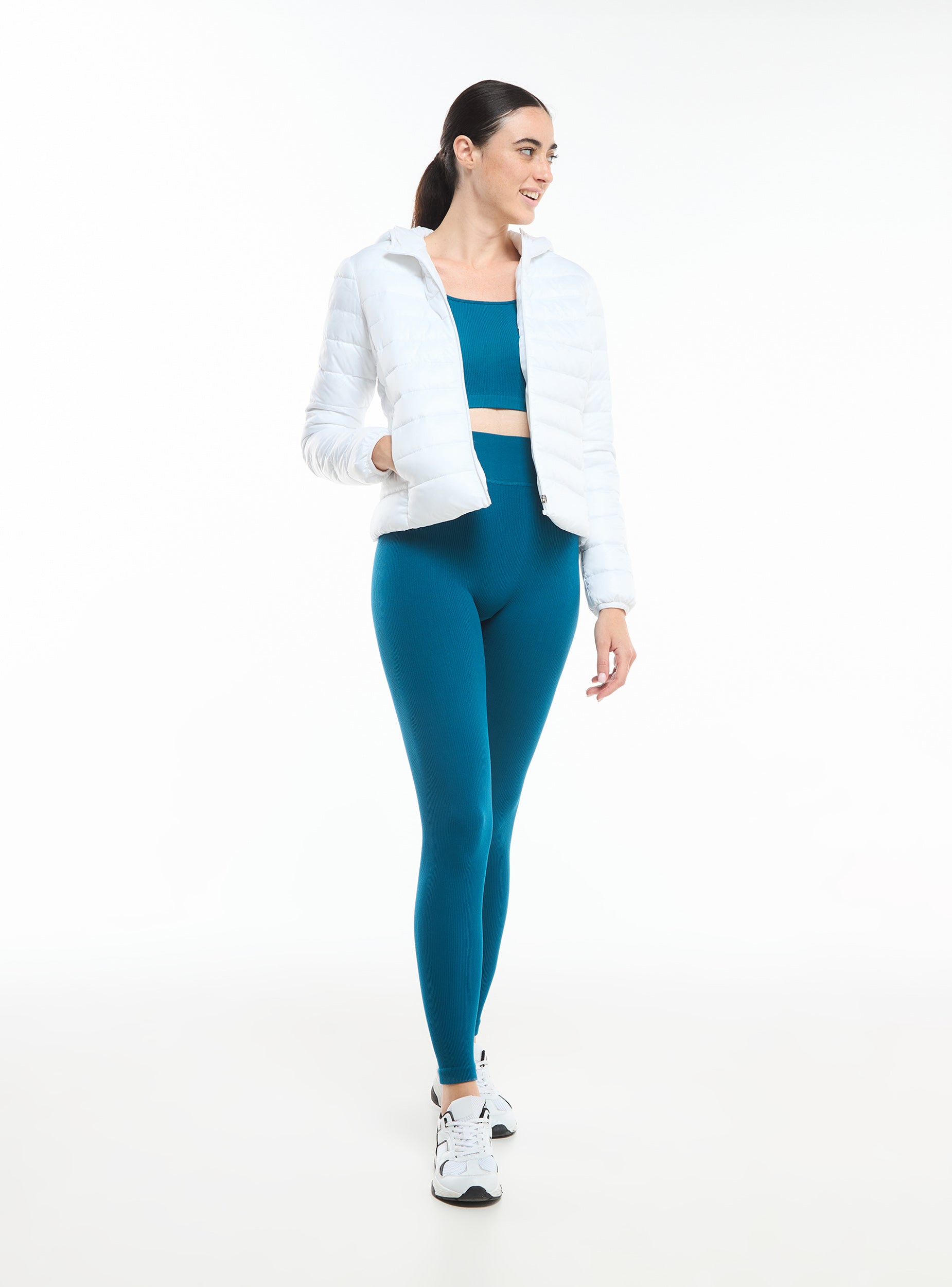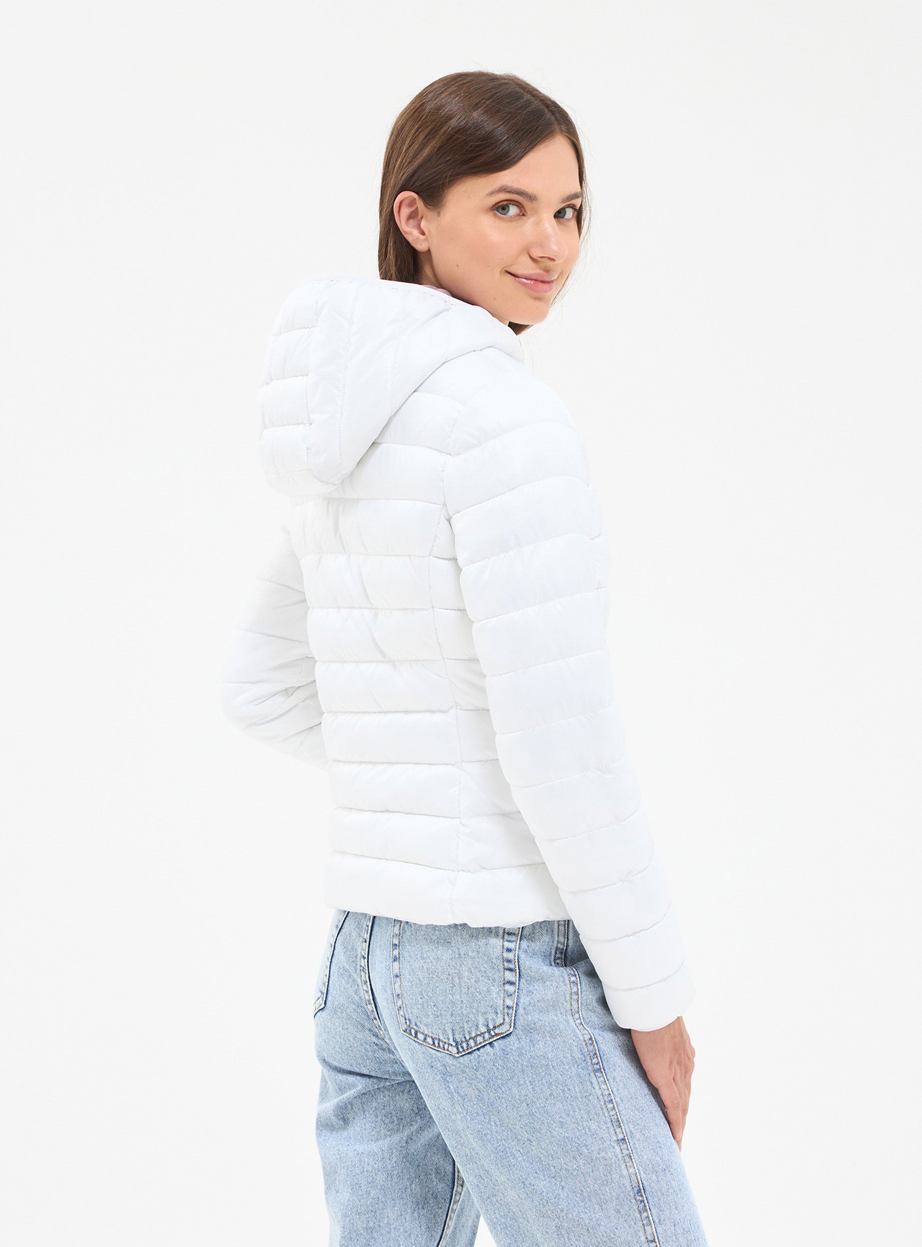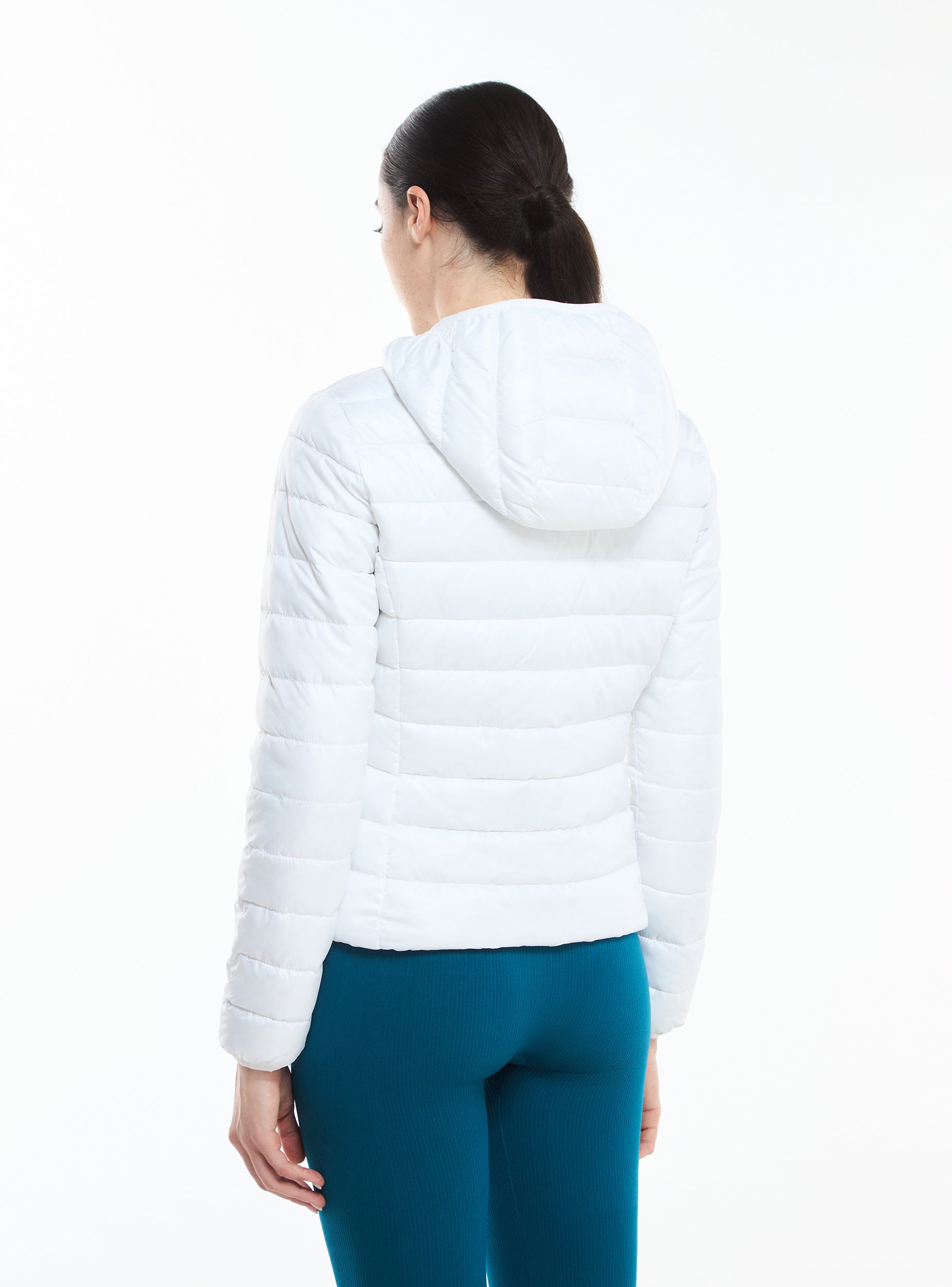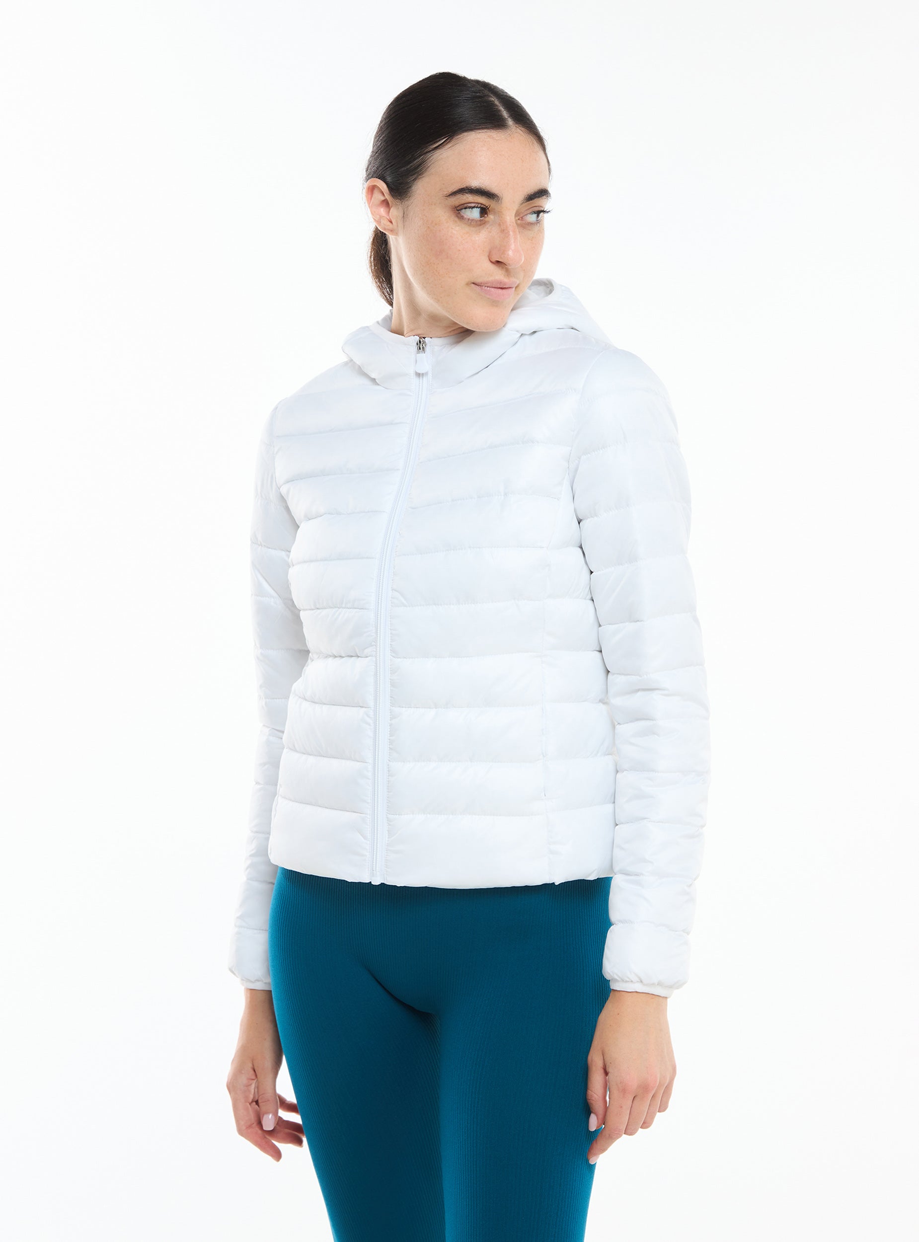 Piumino leggero da donna 100 grammi. Modello con cappuccio, chiusura frontale con zip, maniche lunghe e tasche laterali. Tinta unita. L'articolo veste piccolo.