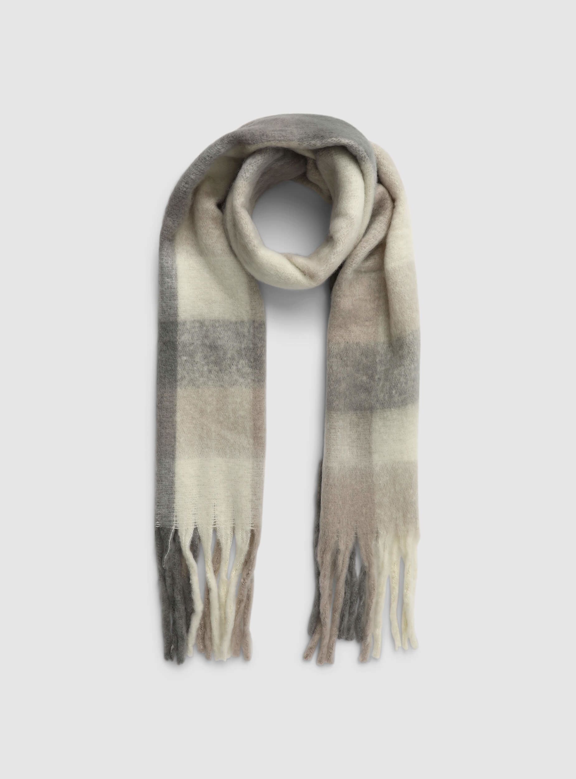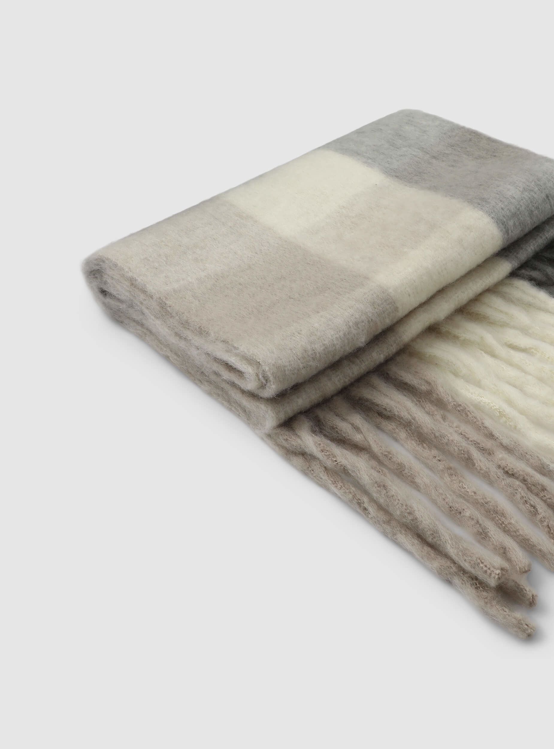 Sciarpone da donna perfetto per aggiungere un tocco di stile ai look invernali. Il motivo a quadri dona un aspetto moderno e versatile, ideale sia per l'ufficio che per il tempo libero. Le frange alle estremità aggiungono movimento e carattere, mentre la lunghezza permette di avvolgerla facilmente attorno al collo o sulle spalle per un comfort extra nelle giornate fredde.