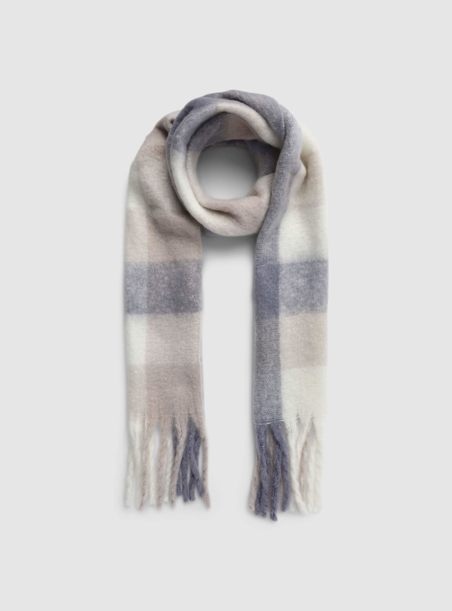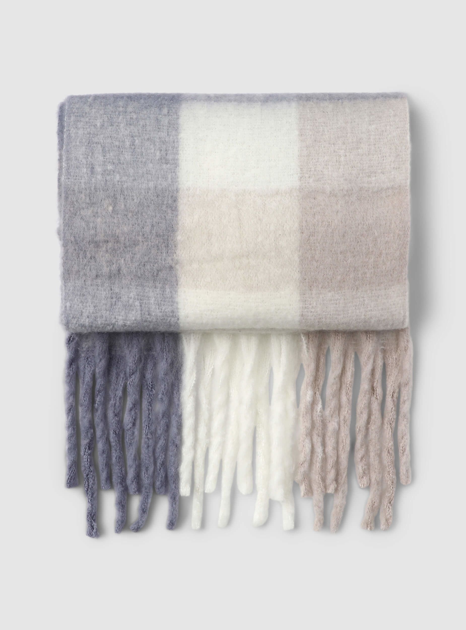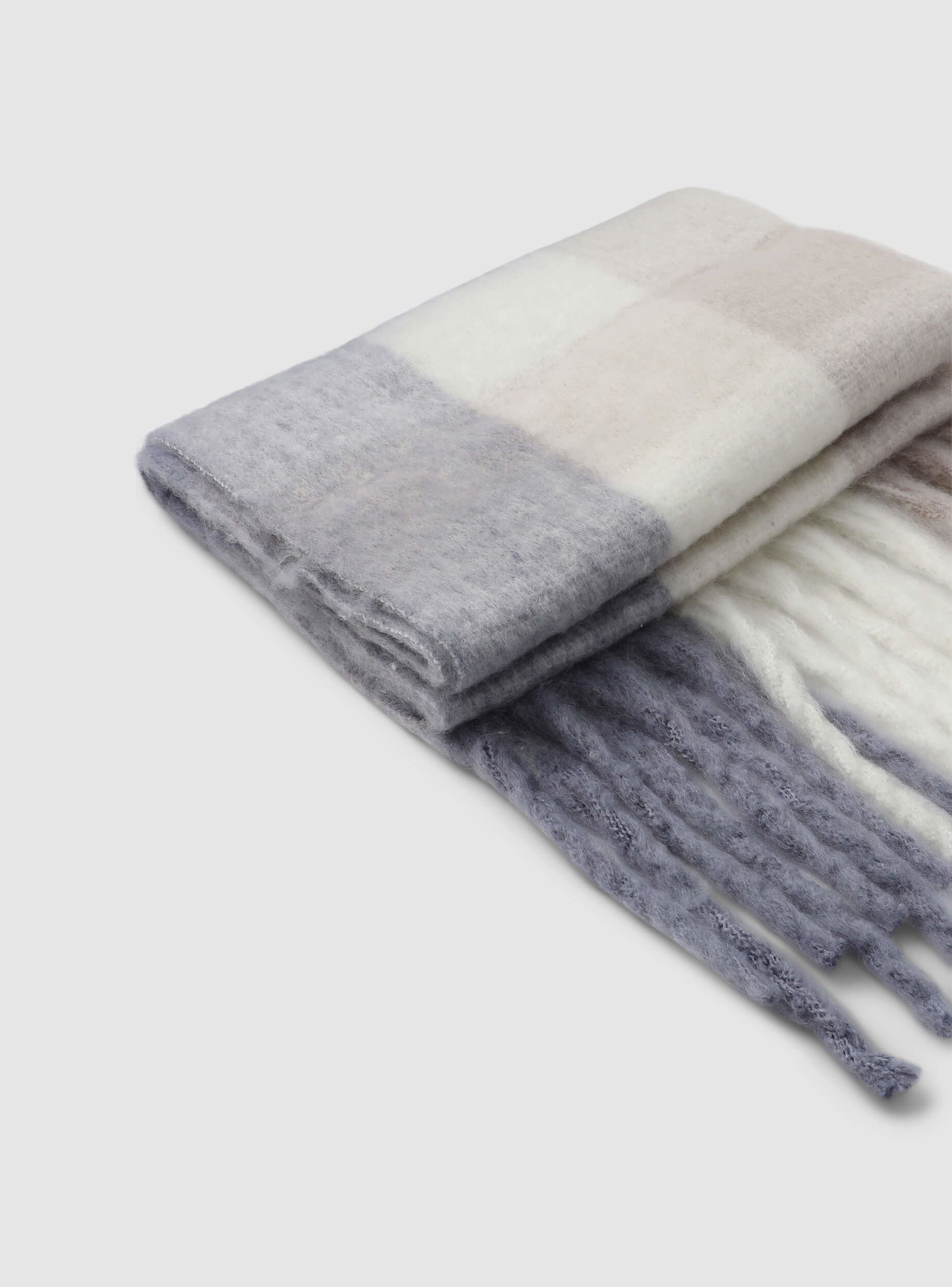 Sciarpone da donna perfetto per aggiungere un tocco di stile ai look invernali. Il motivo a quadri dona un aspetto moderno e versatile, ideale sia per l'ufficio che per il tempo libero. Le frange alle estremità aggiungono movimento e carattere, mentre la lunghezza permette di avvolgerla facilmente attorno al collo o sulle spalle per un comfort extra nelle giornate fredde.