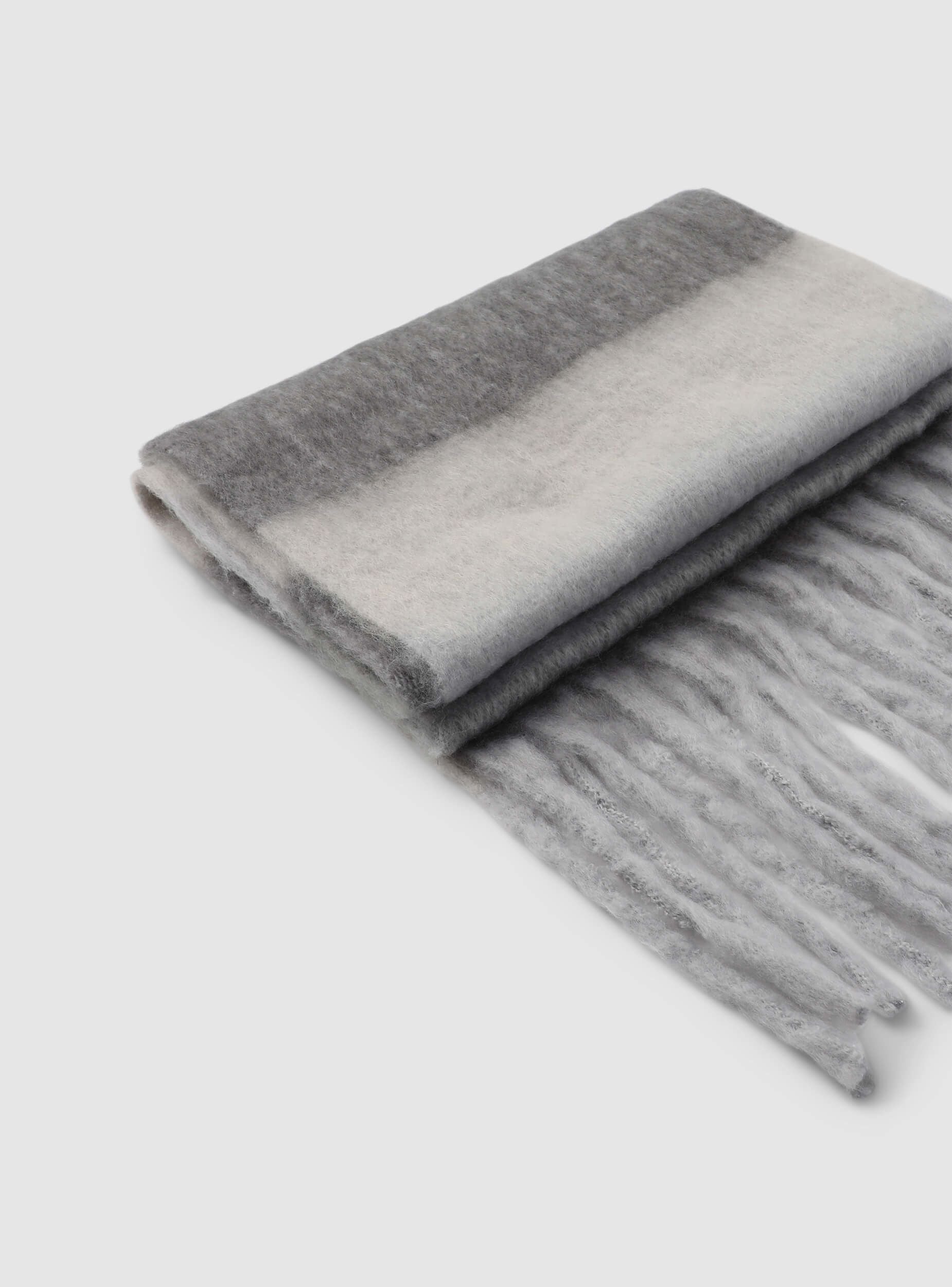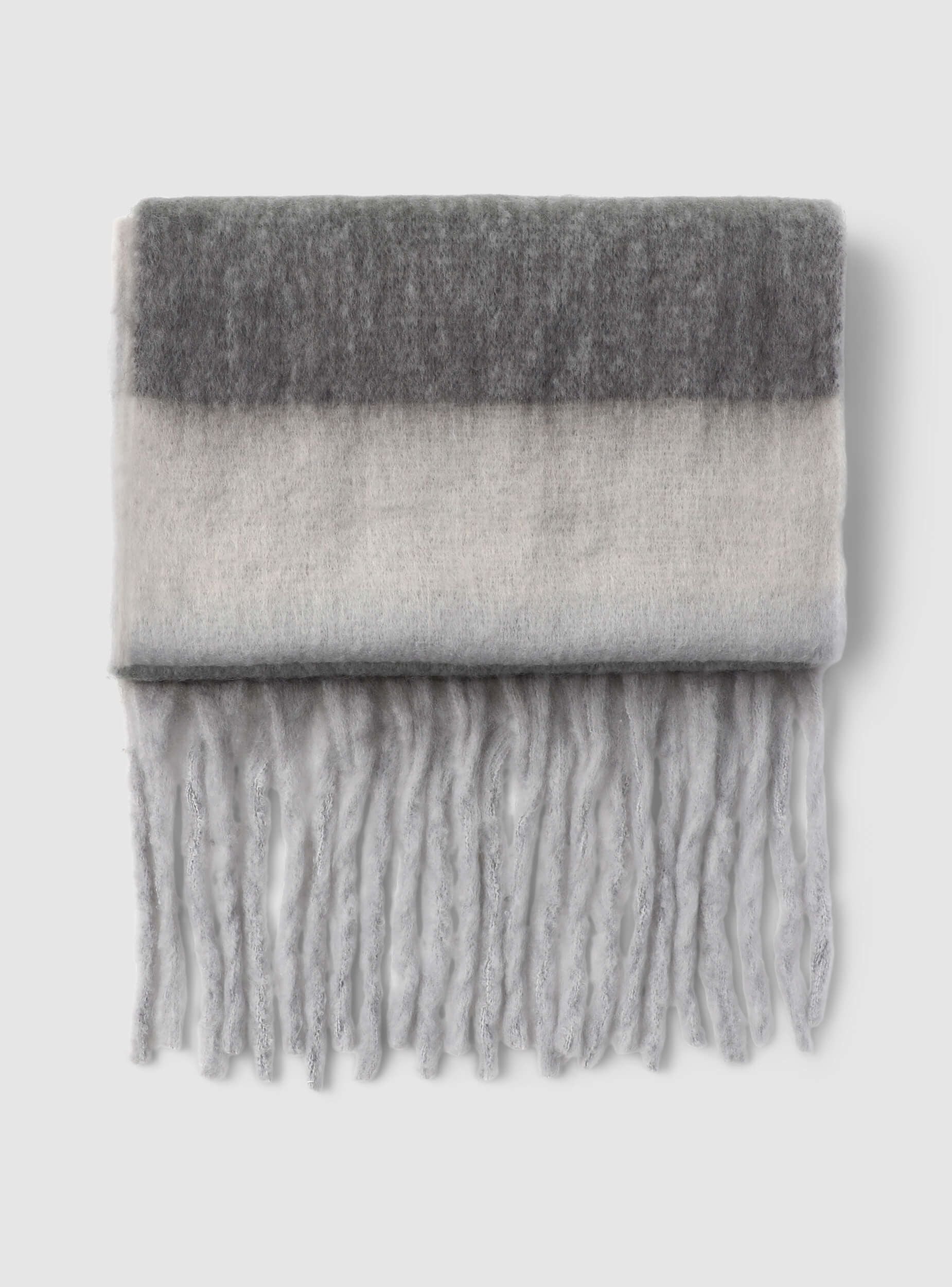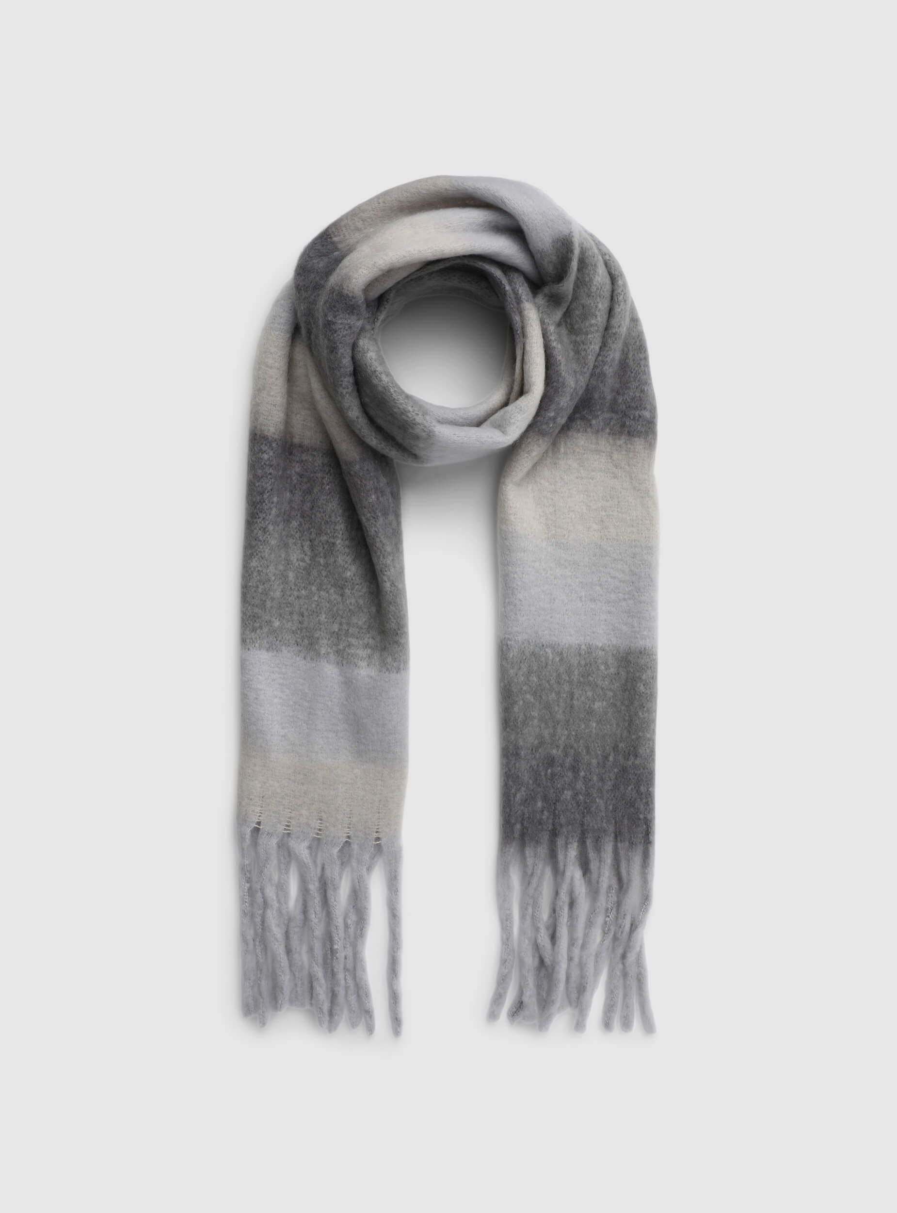 Sciarpone da donna perfetto per completare look casual e raffinati nelle giornate più fredde. Il design a righe sfumate aggiunge un tocco moderno e versatile, ideale sia per l'ufficio che per il tempo libero. Le frange lunghe alle estremità donano movimento e carattere, rendendo questo accessorio facile da abbinare a cappotti, giacche o maglioni per uno stile sempre attuale.