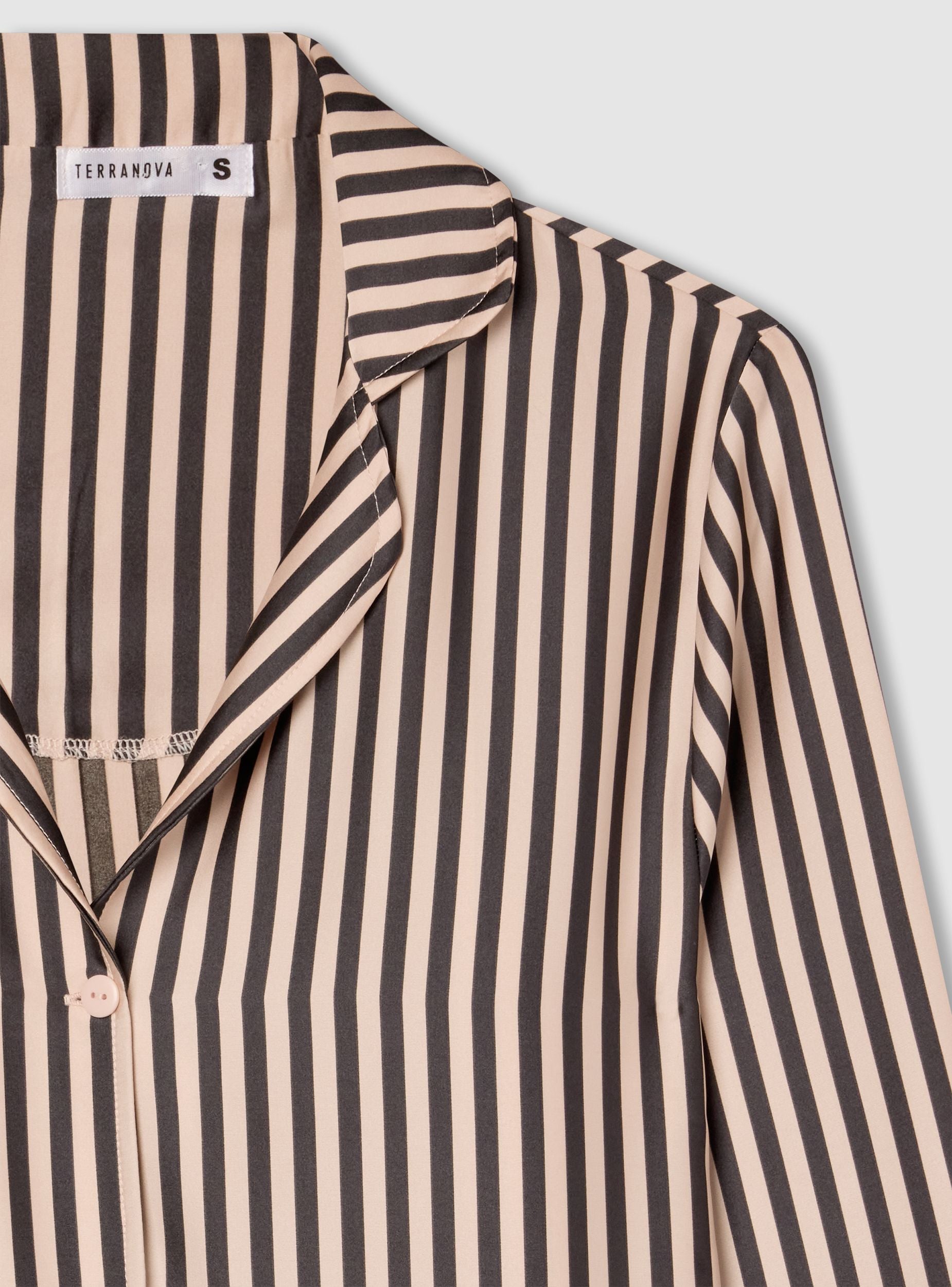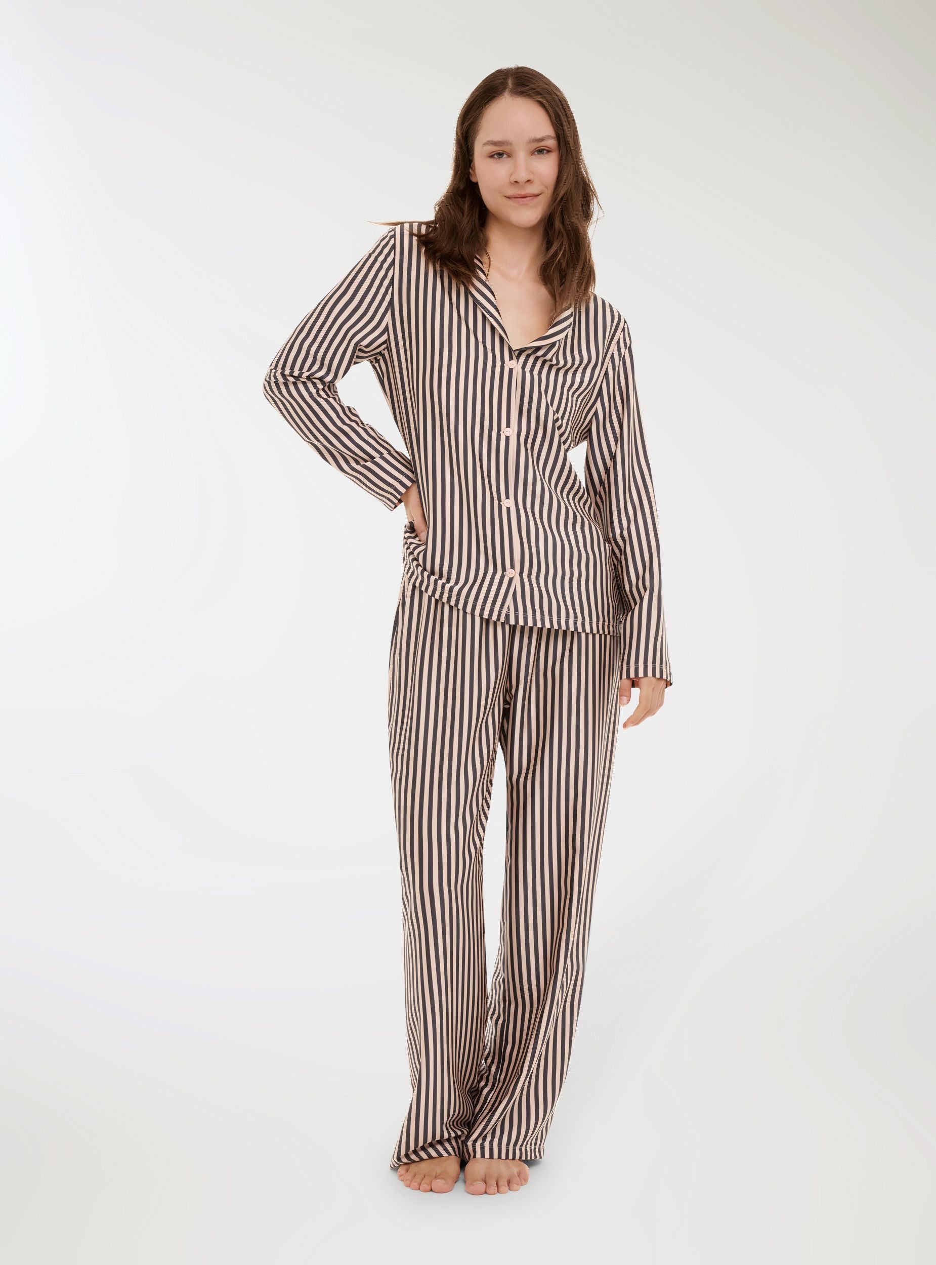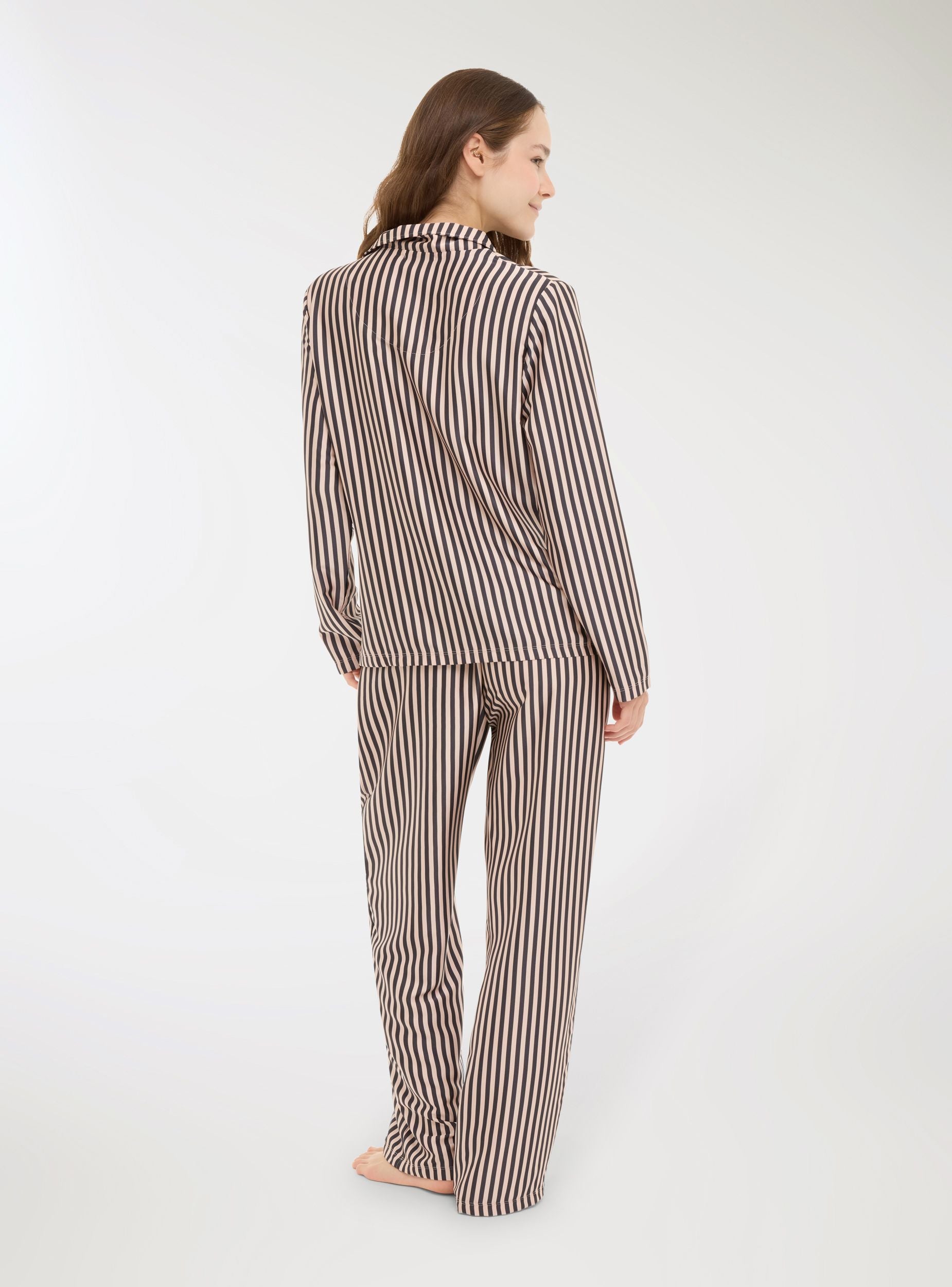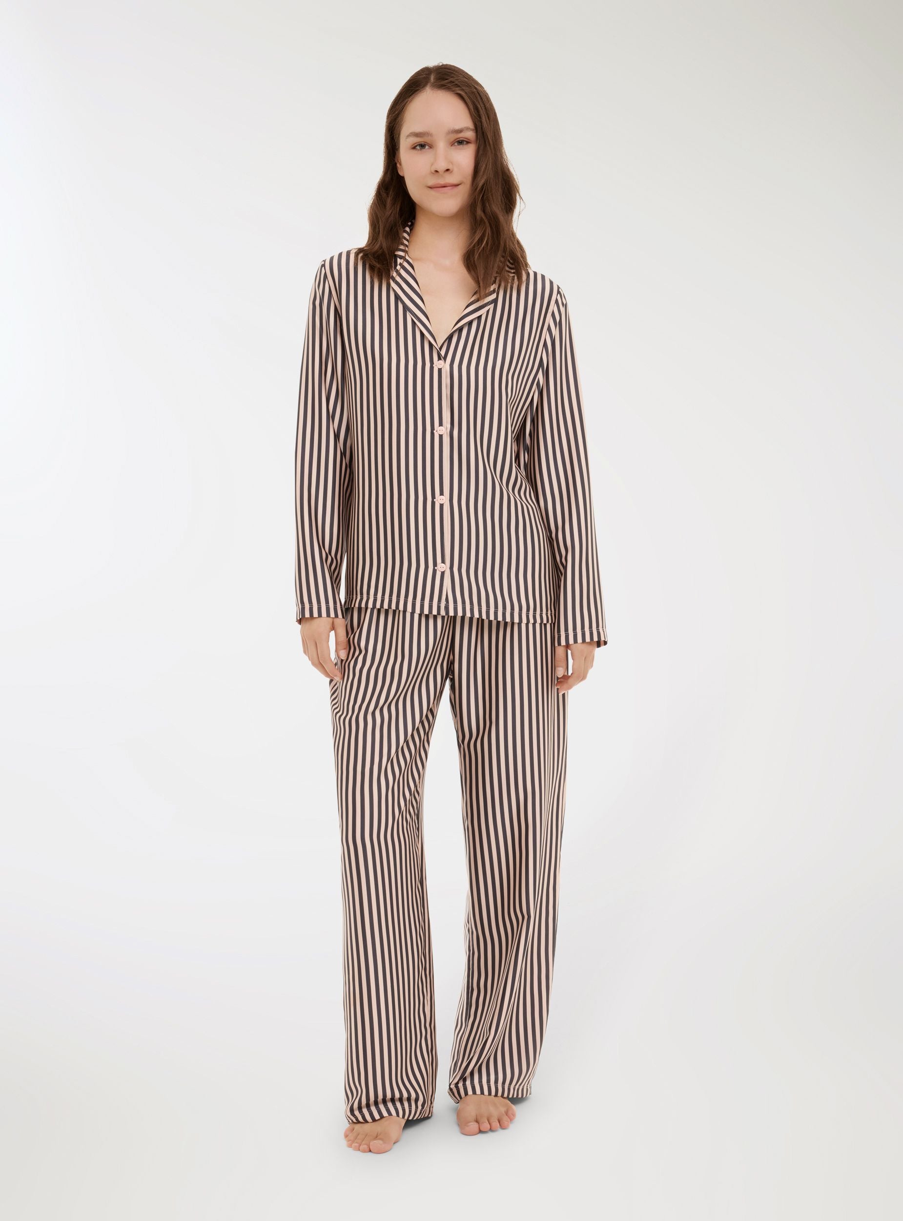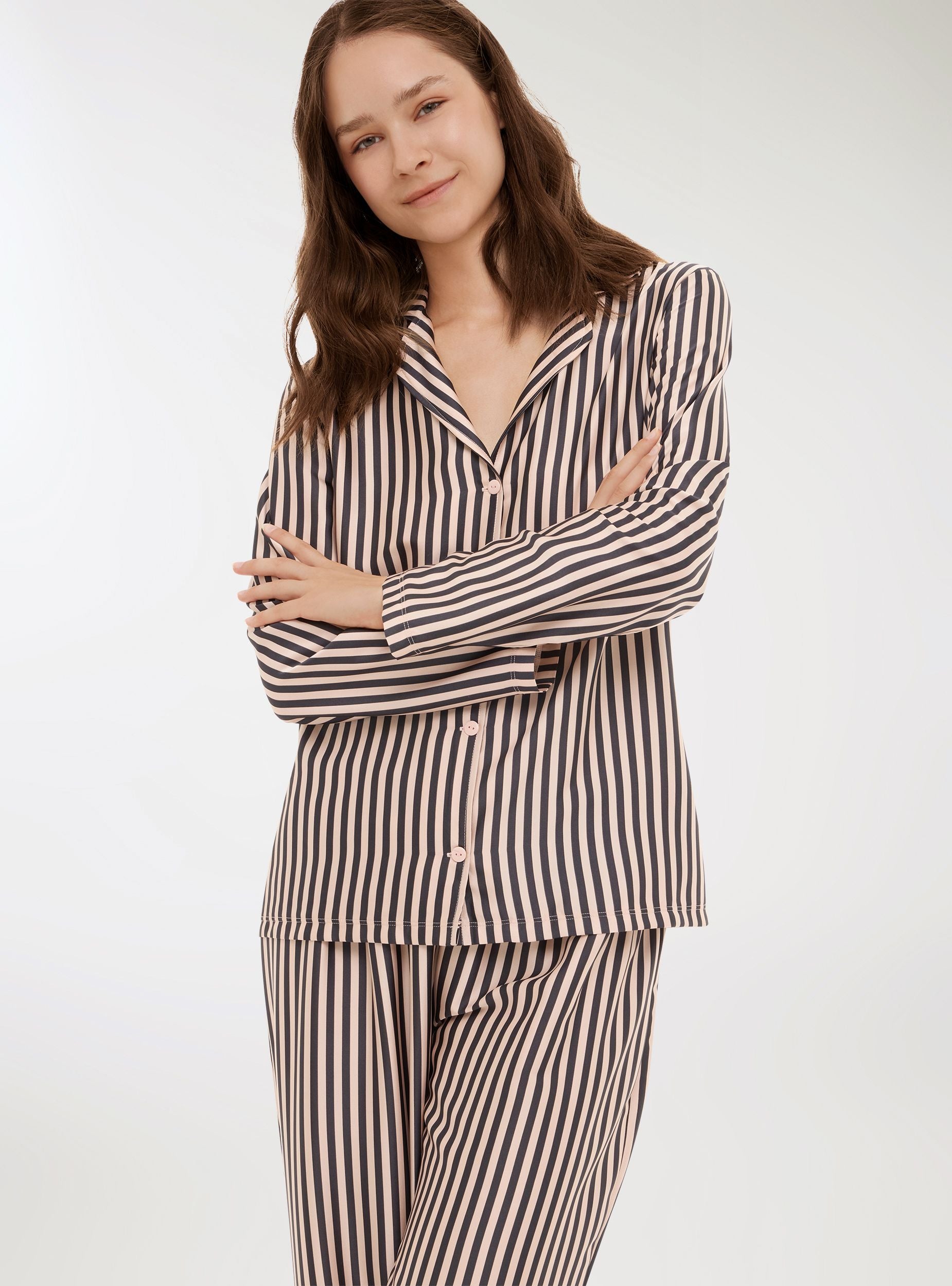 Pigiama da donna composto da camicia e pantaloni lunghi, caratterizzato da una fantasia a righe. La camicia presenta una chiusura con bottoni e un colletto classico, mentre i pantaloni hanno una vestibilitá comoda con elastico in vita. Ideale per momenti di relax e per un look confortevole e raffinato anche a casa.