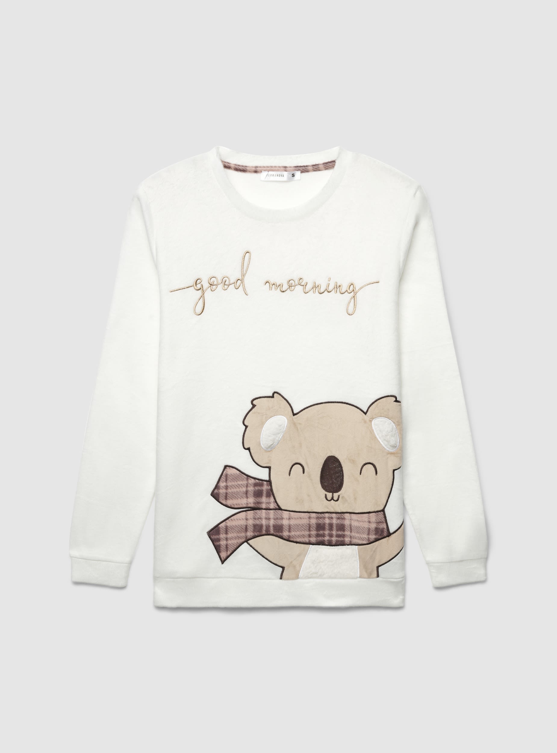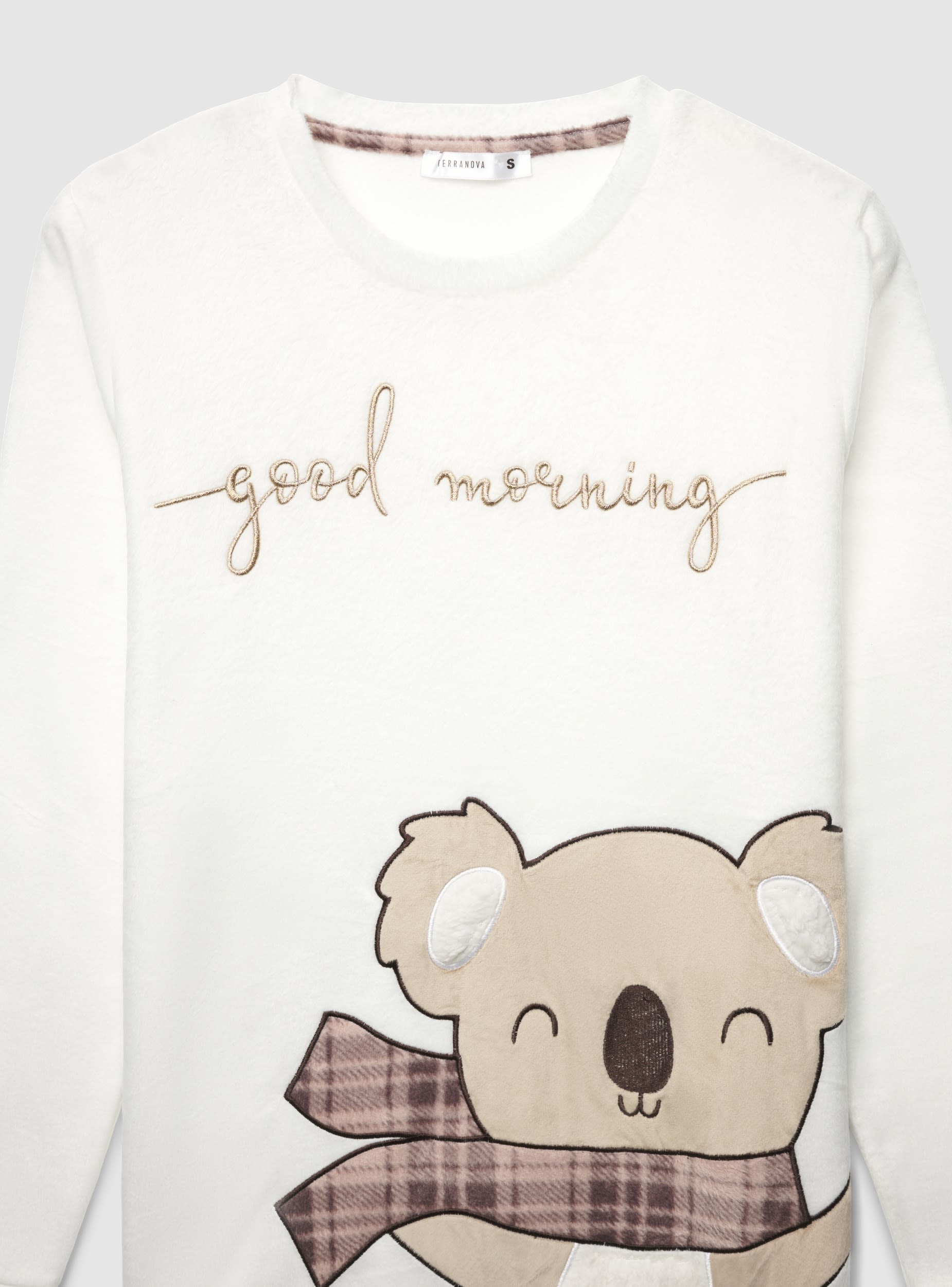 Set pigiama da donna con maglia a maniche lunghe e scollo tondo, impreziosita dalla scritta ricamata “good morning” e grande applicazione koala sul davanti. Pantaloni lunghi a quadri con elastico in vita. Vestibilità regular fantasia con stampe e ricami. Ideale per serate rilassate e giornate di relax in casa, si abbina a vestaglia e pantofole per un look cozy.Dettagli