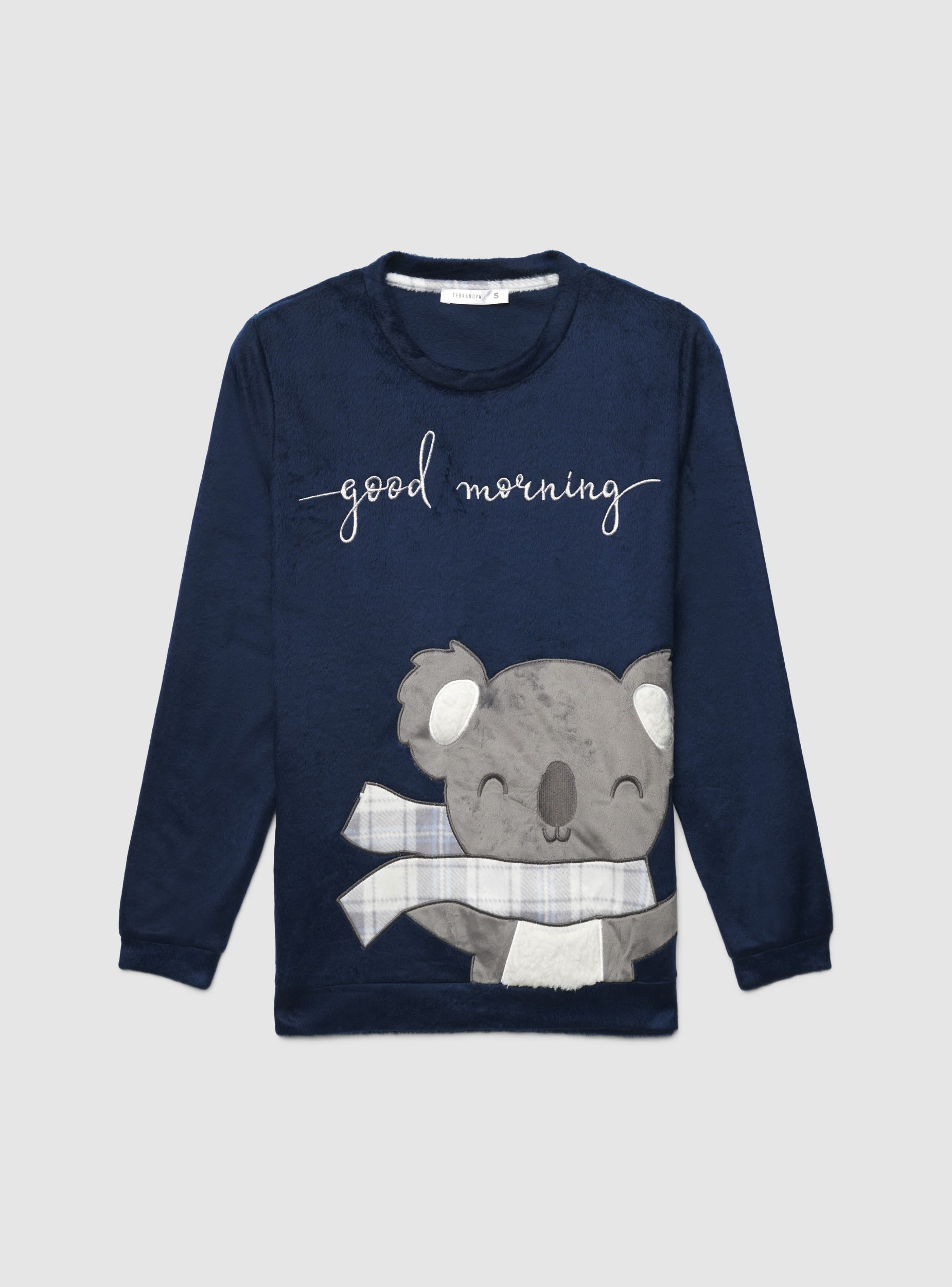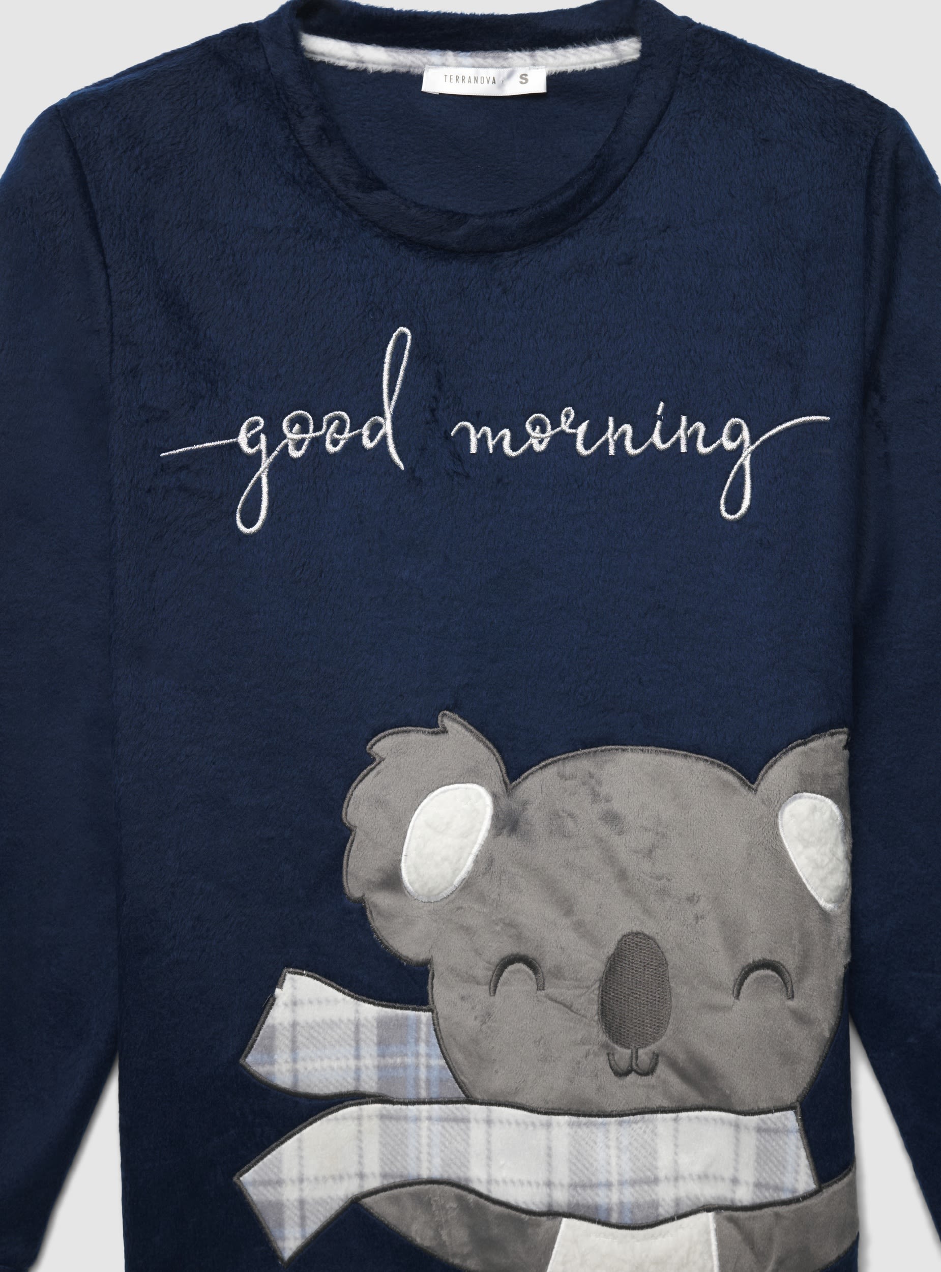 Set pigiama da donna con maglia a maniche lunghe e scollo tondo, impreziosita dalla scritta ricamata “good morning” e grande applicazione koala sul davanti. Pantaloni lunghi a quadri con elastico in vita. Vestibilità regular fantasia con stampe e ricami. Ideale per serate rilassate e giornate di relax in casa, si abbina a vestaglia e pantofole per un look cozy.