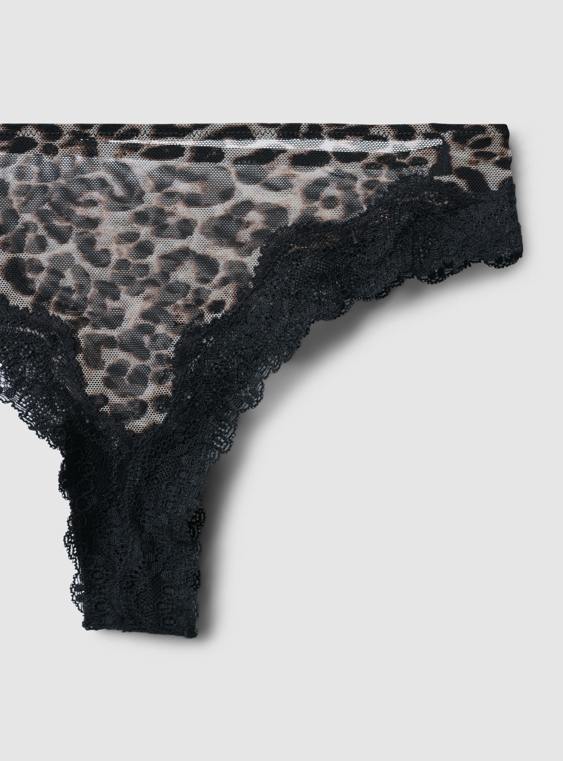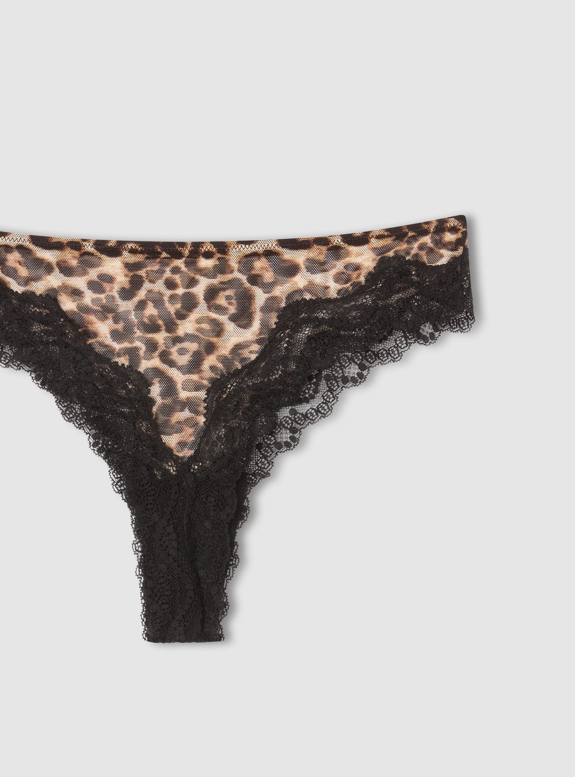 Slip da donna con design brasiliana. Presenta dettagli in pizzo che aggiungono un tocco raffinato e femminile. La vestibilità brasiliana garantisce comfort e stile, mentre il motivo animalier dona un aspetto audace e moderno. Perfetto da abbinare a reggiseni coordinati per un look completo e sofisticato.