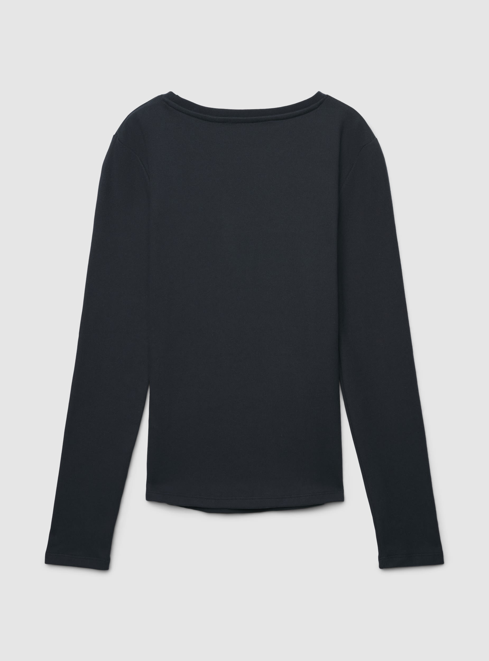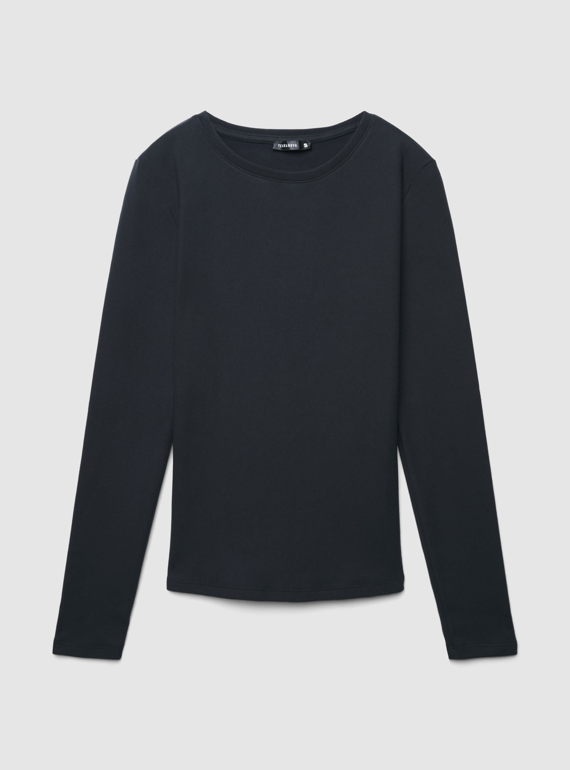 Maglietta da donna a manica lunga, perfetta per l’uso quotidiano e per il layering nelle mezze stagioni. Linea regular con scollo tondo e bordi rifiniti, design a tinta unita facile da abbinare sotto cardigan, blazer o jeans a vita alta. Il tessuto morbidamente elasticizzato offre comfort e libertà nei movimenti. Ideale per look casual, urban o per l’ufficio informale, con pantaloni, gonne o pantaloncini.