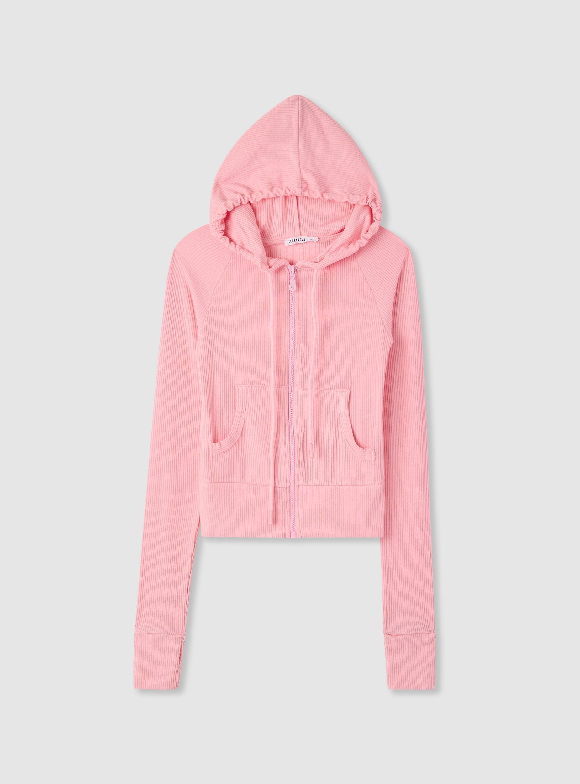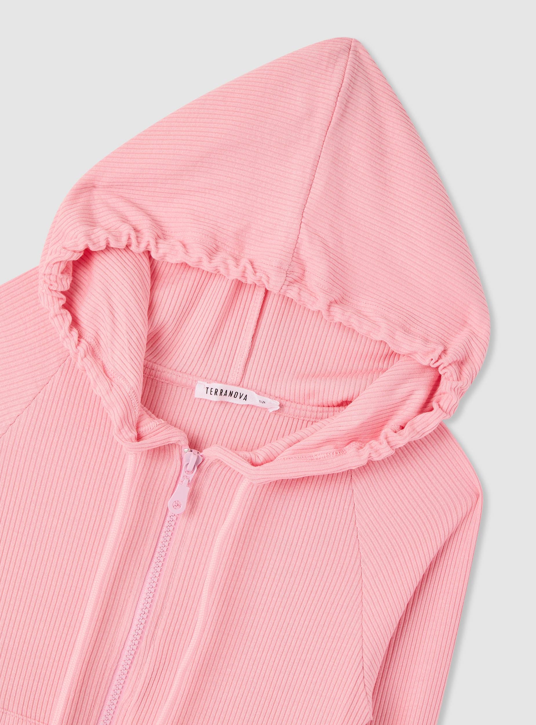 Felpa da donna con cappuccio, ideale per il tempo libero e look urban. Modello con zip frontale, maniche lunghe raglan e polsini ampi. Tasca a marsupio sdoppiata per praticità e bordi arricciati sul cappuccio con coulisse. Lavorazione a costine in tinta unita che valorizza la vestibilità e dona comfort. Perfetta su jeans a vita alta o leggings per outfit casual o sportivi leggeri.
