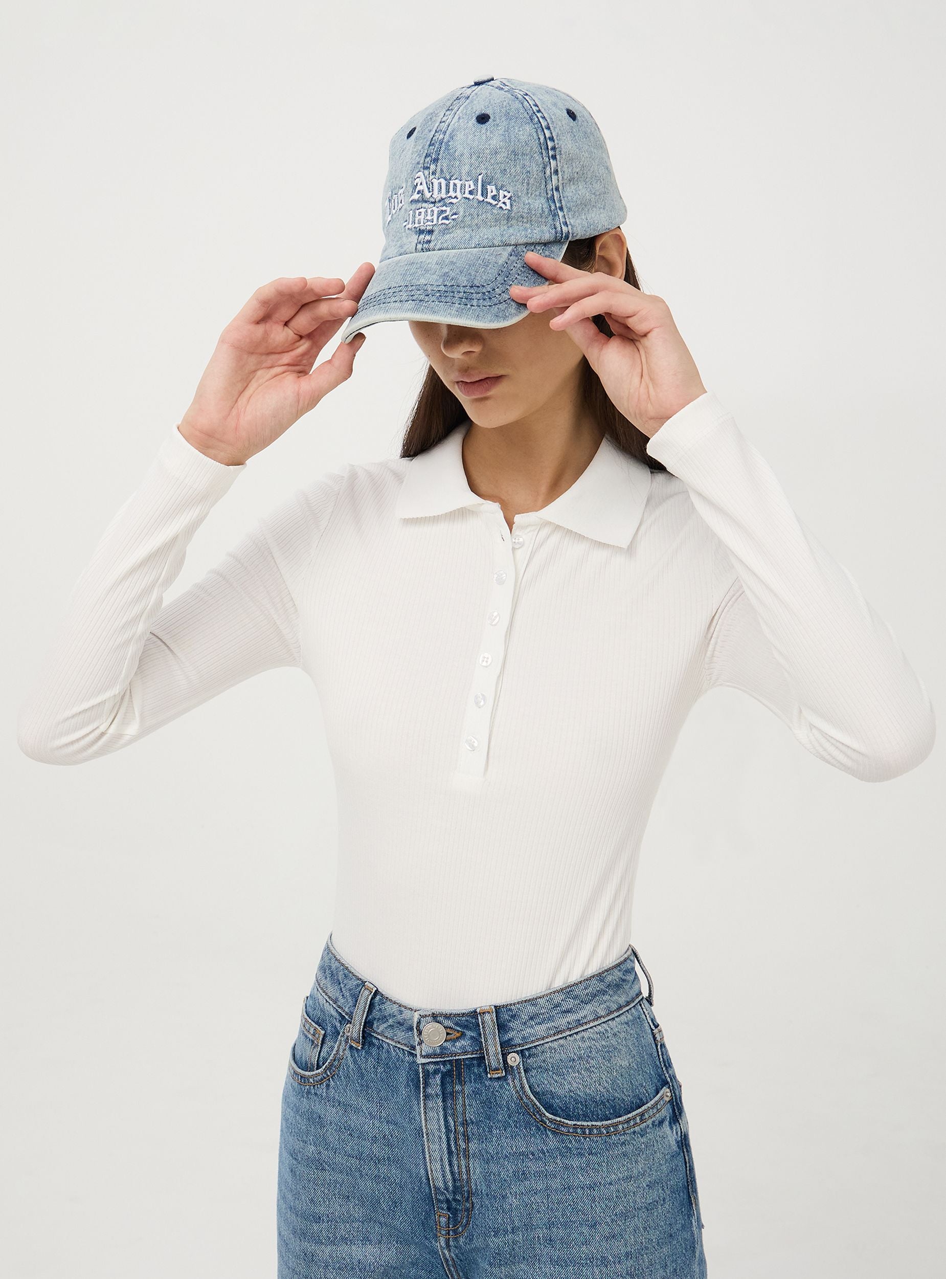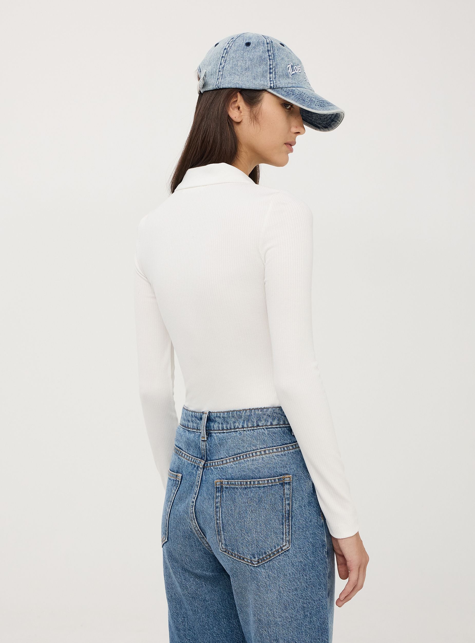 Body da donna a maniche lunghe, con collo a polo e chiusura con bottoni sul davanti. Il tessuto a tinta unita ha una texture a coste. Il modello è aderente, enfatizzando la silhouette, ed è perfetto per essere abbinato sia con capi casual che con look più eleganti. Chiusura con bottoni a pressione sul fondo.
