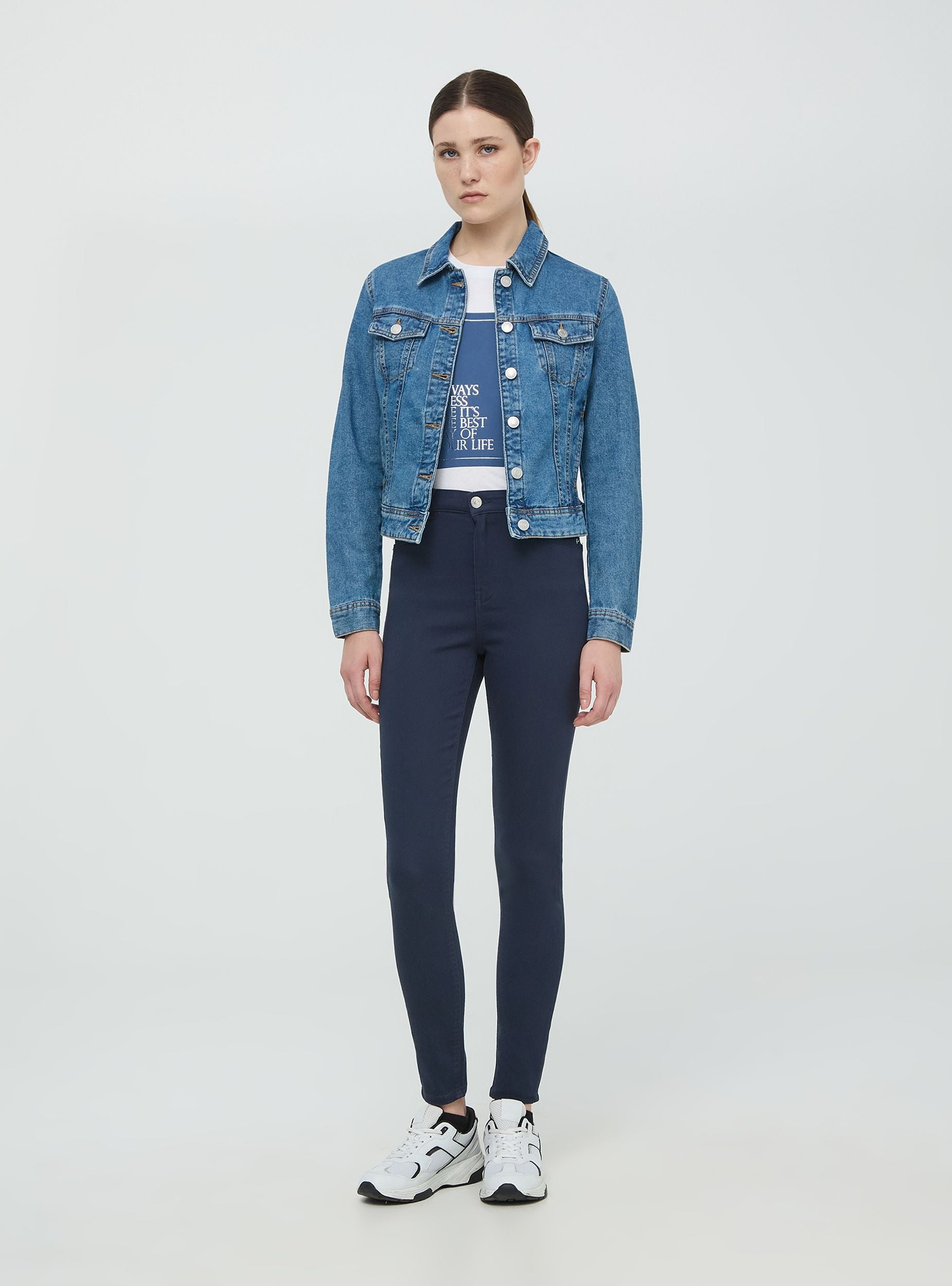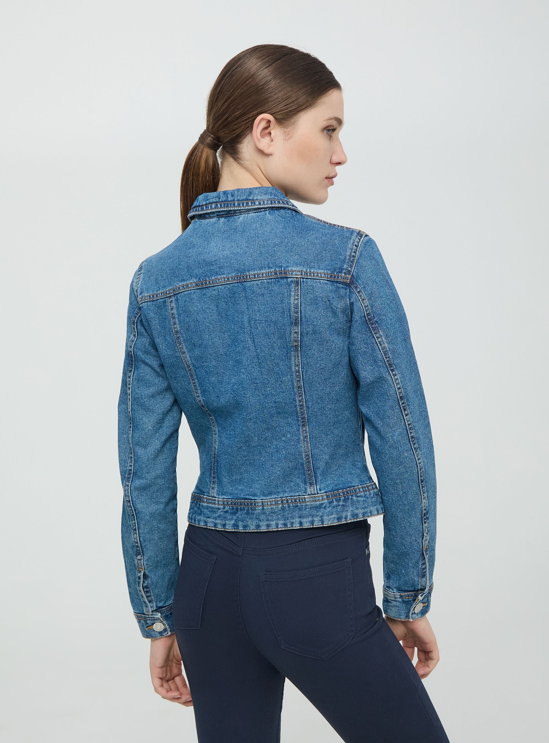 Giacca di jeans in denim blu medio ideale per un look casual e trendy. Realizzata in cotone offre una vestibilità regolare e confortevole. Presenta bottoni in metallo argentato sul davanti, sui polsini e sulle due tasche frontali con pattina. Cuciture a contrasto che aggiungono un tocco di stile. Perfetta per uscite casual, passeggiate in città o serate informali. Iconica e versatile, un must-have per il guardaroba femminile.