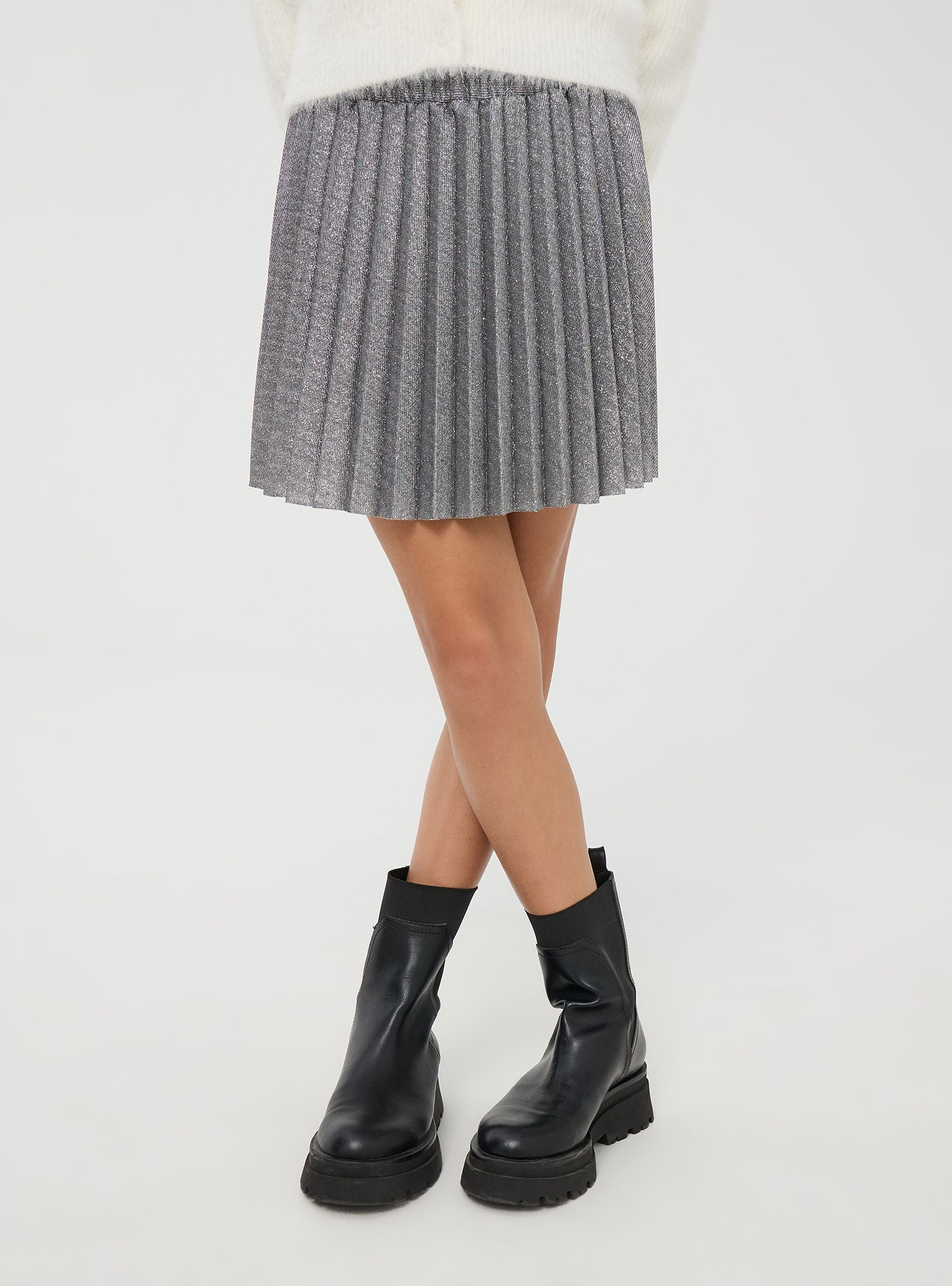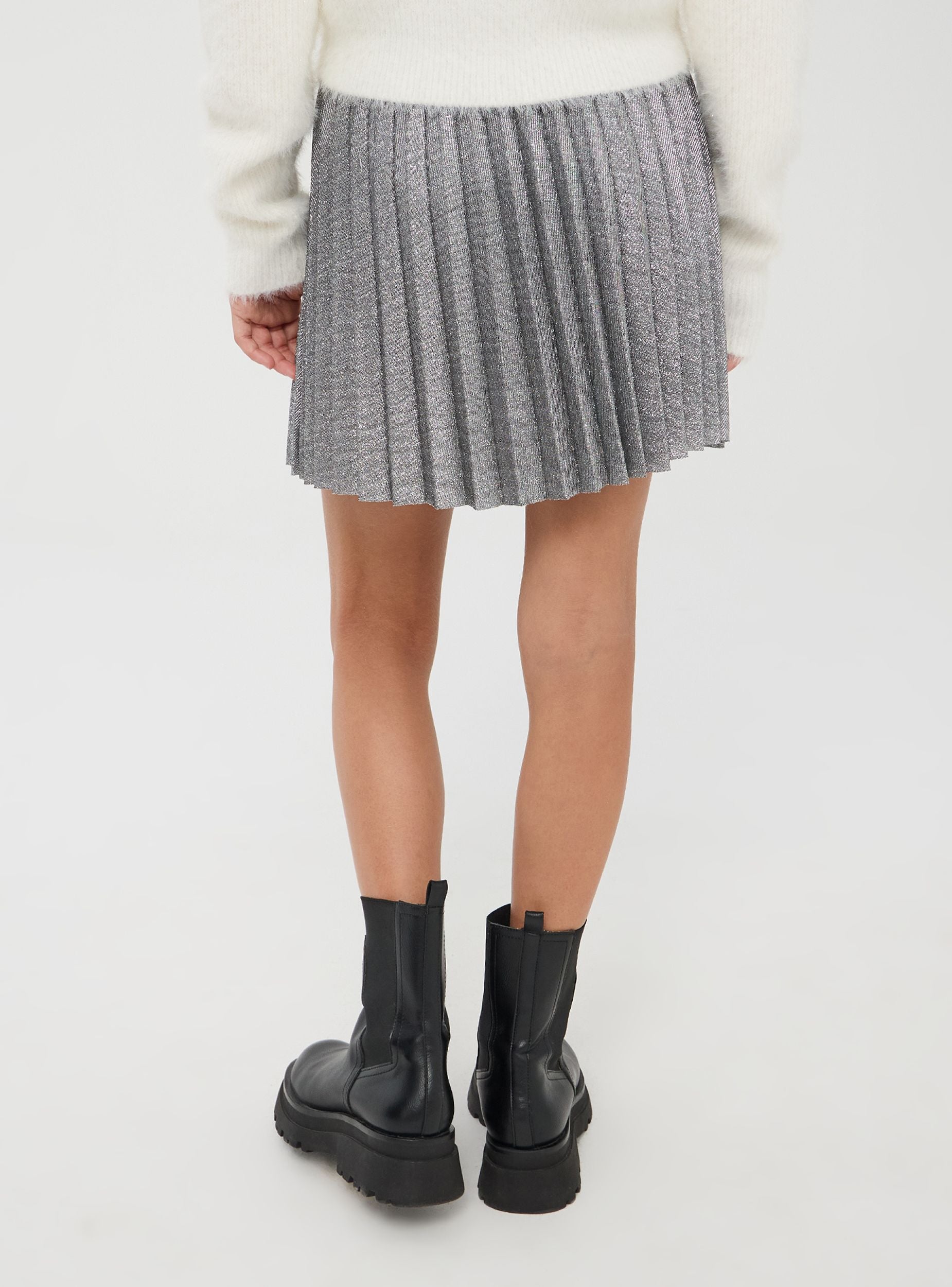 Gonna corta da bambina a pieghe con elastico in vita in tessuto a tinta unita luccicante. Il design plissettato conferisce un aspetto elegante e dinamico, rendendo il capo ideale per diverse occasioni. Perfetta per cerimonie e feste, questa gonna può essere abbinata a una camicetta elegante e a delle ballerine per un look raffinato. Per un outfit casual e quotidiano, si può indossare con una t-shirt semplice e delle sneakers.