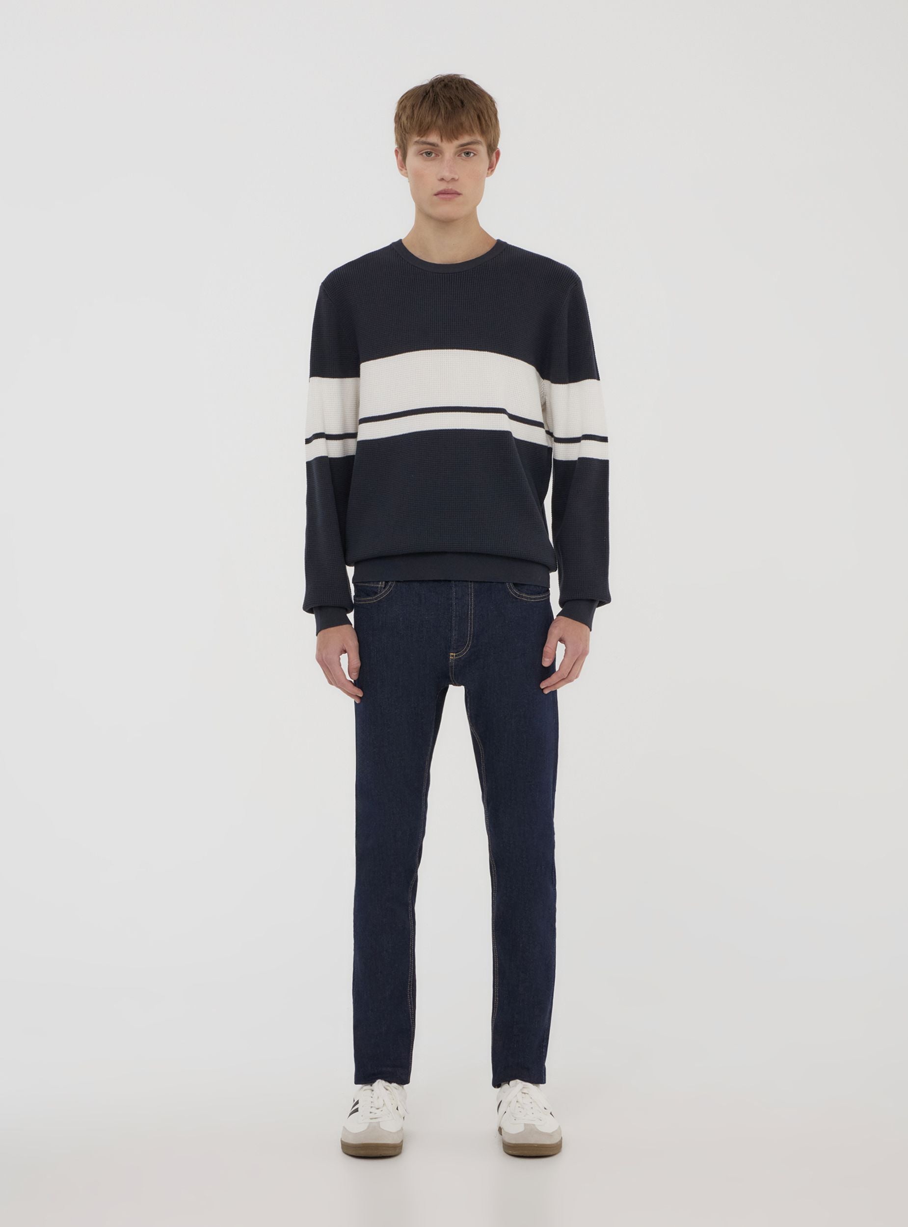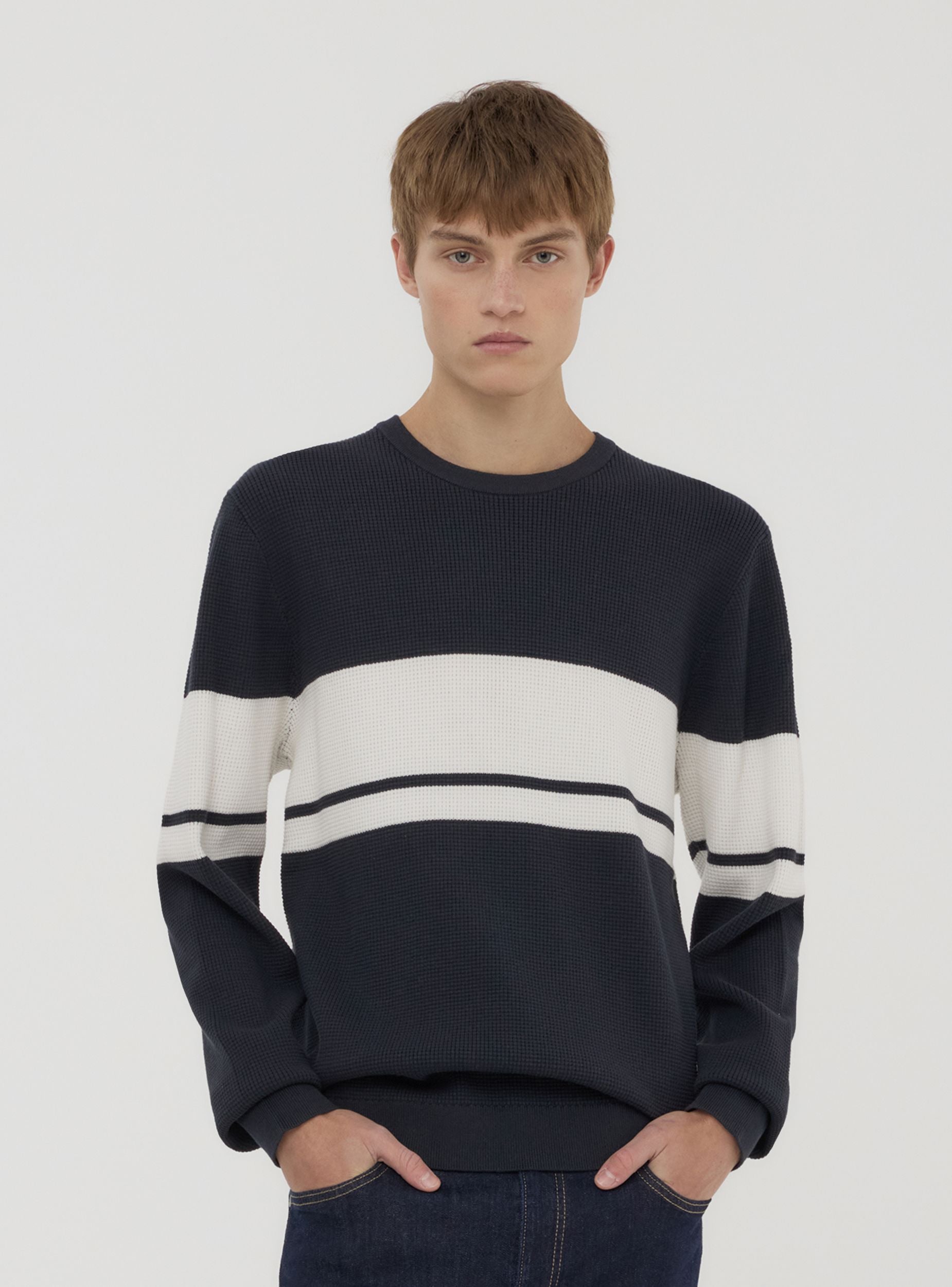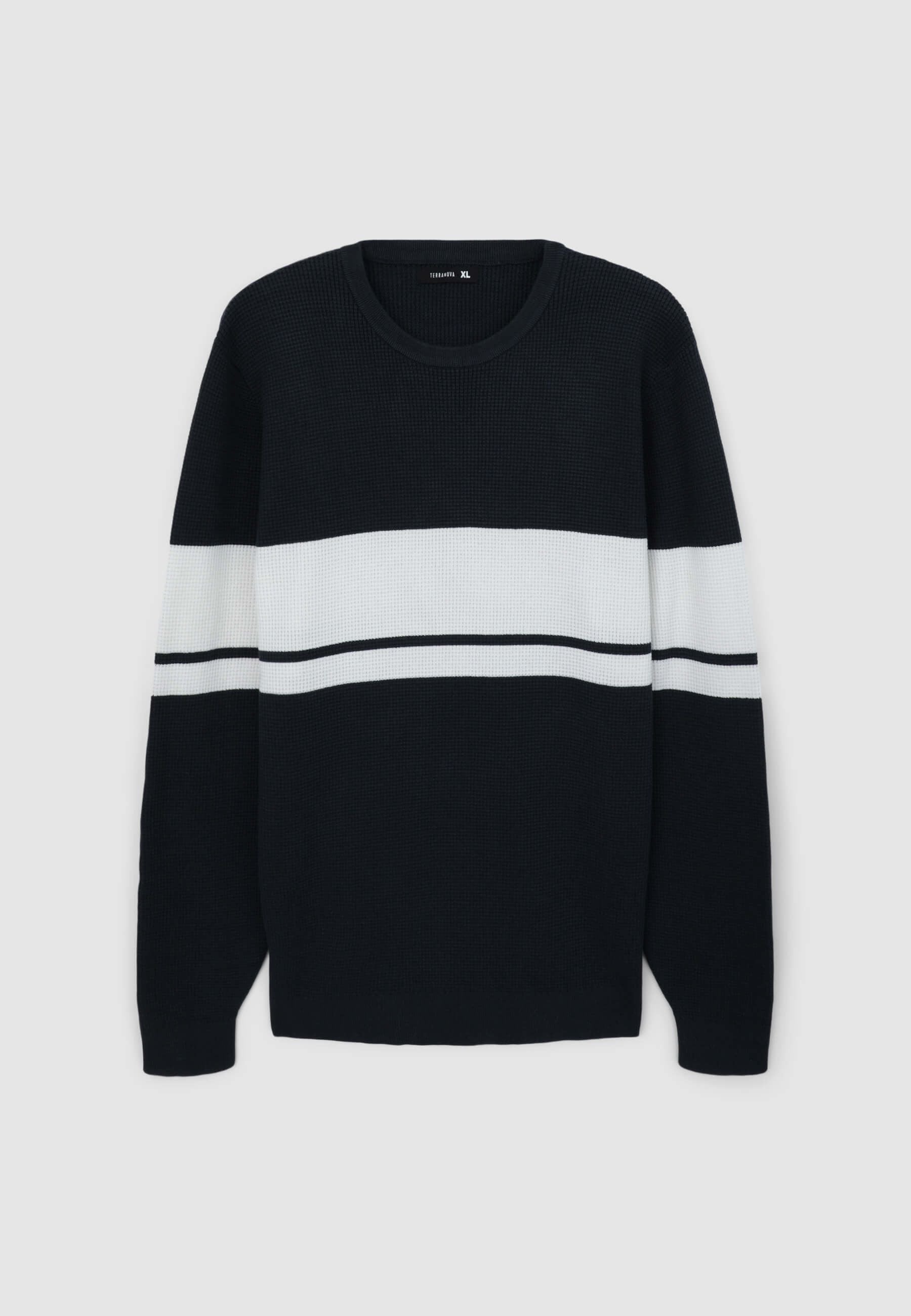 Maglia da uomo a maniche lunghe con girocollo e motivo a righe, perfetta per un look casual e moderno. Ideale da abbinare a jeans o pantaloni chino, dona versatilità a qualsiasi outfit. Adatta per il tempo libero o un'uscita informale, unisce comfort e stile in un design che si distingue per semplicità e carattere.