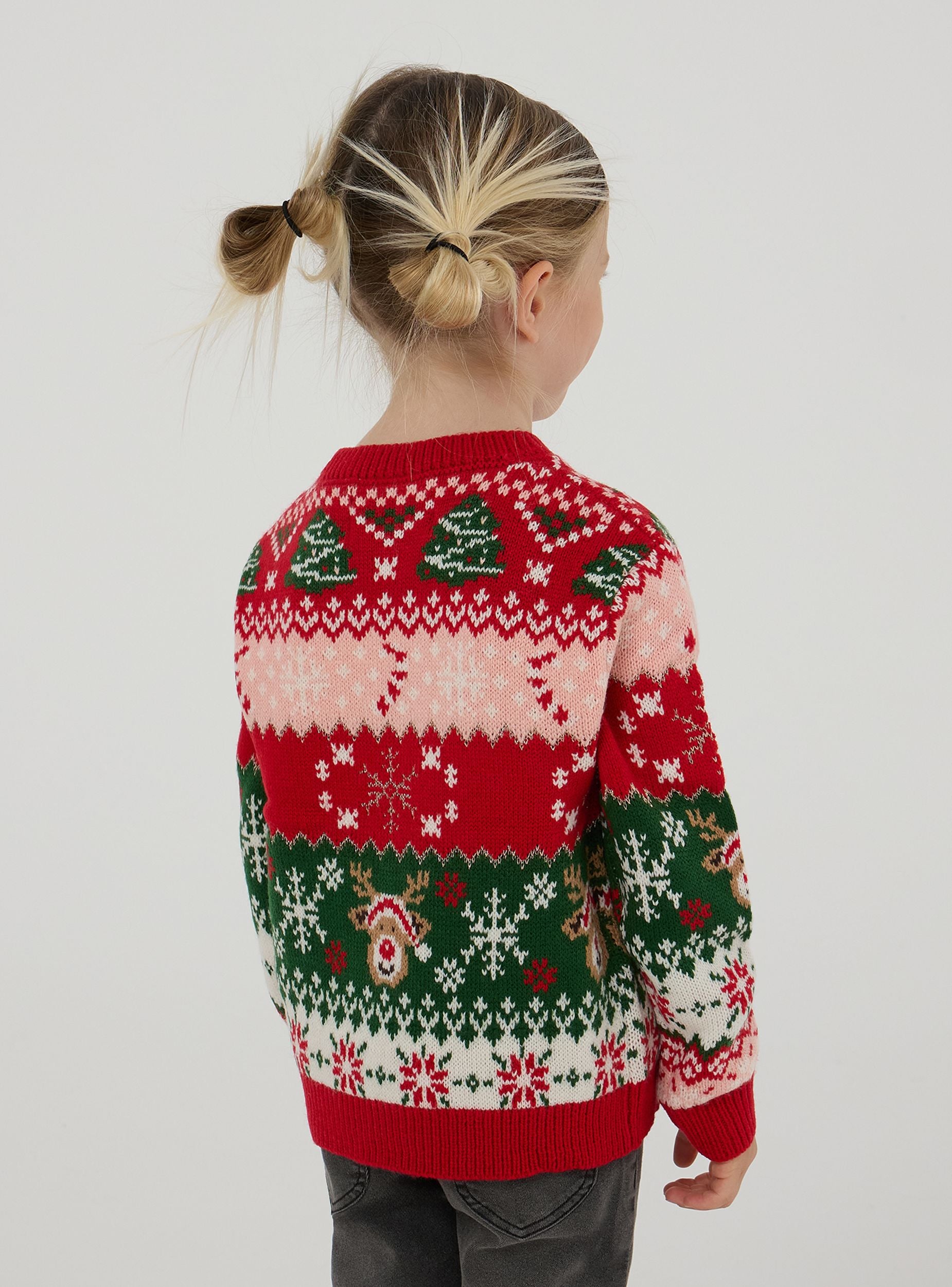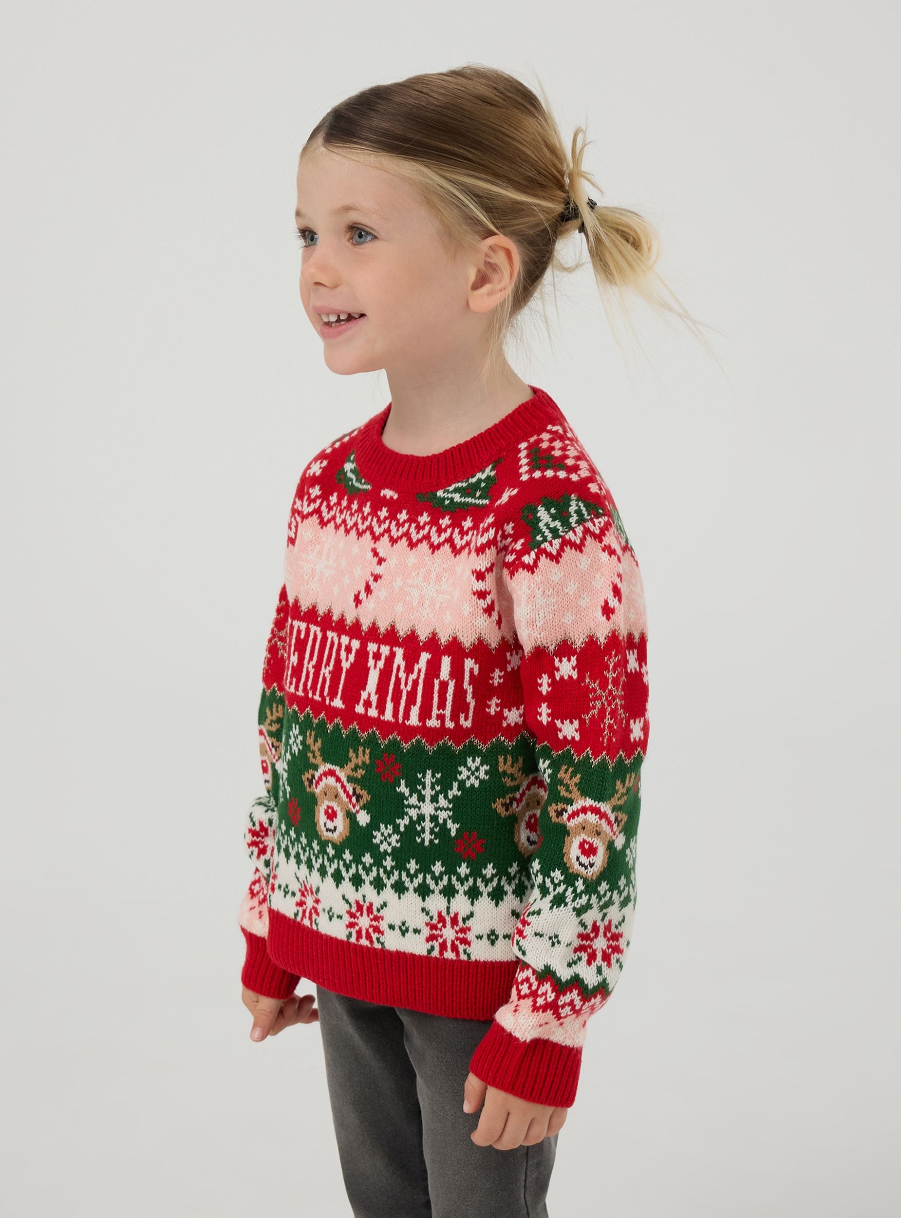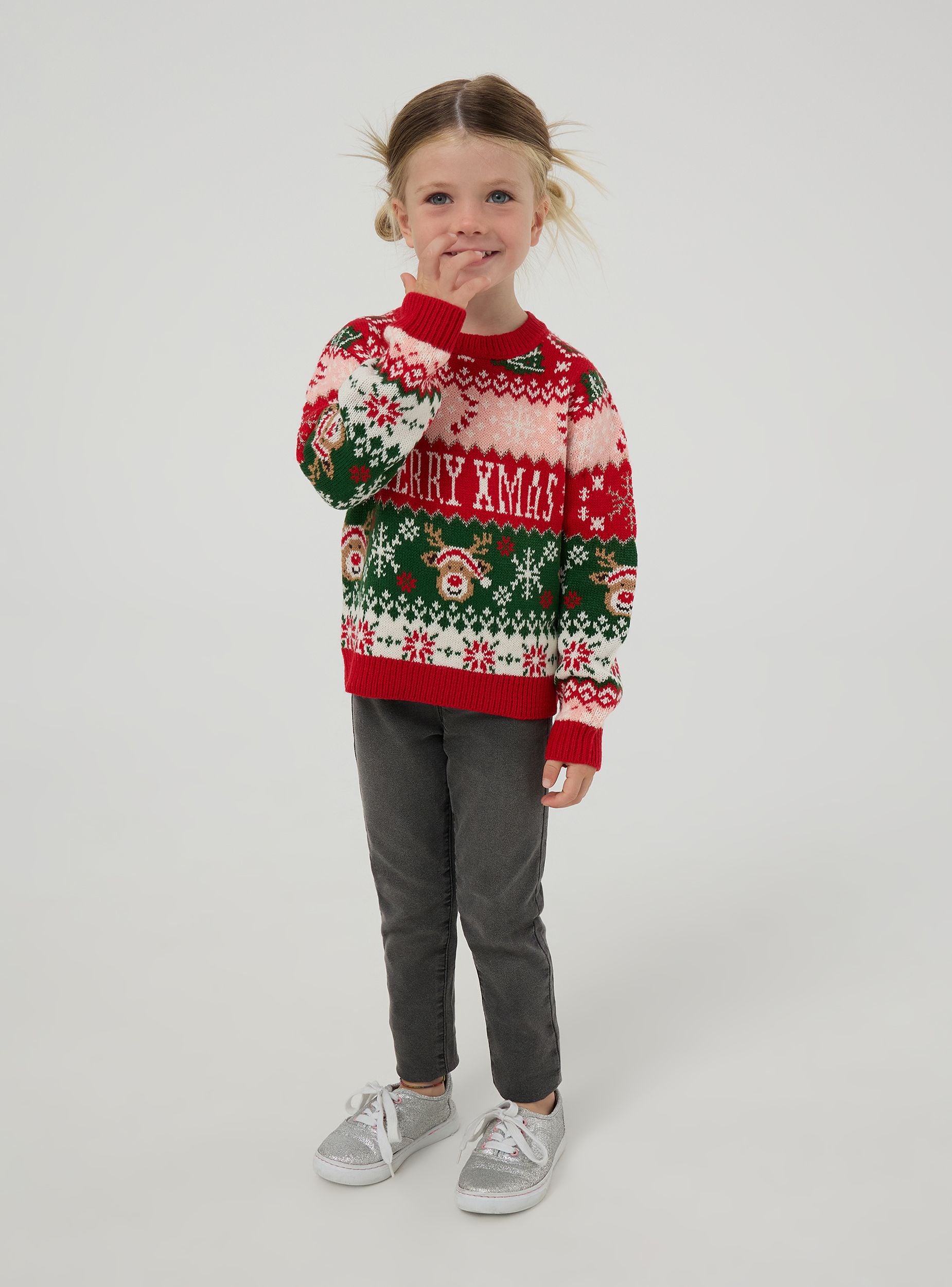 Maglia da bimba a tema natalizio con motivo festivo e scritta Merry Xmas. Realizzata con dettagli lavorati a maglia che includono disegni di renne e fiocchi di neve, perfetta per celebrare le festività in modo allegro e confortevole. Il girocollo, i polsini e l'orlo a coste assicurano una vestibilità confortevole. Questa maglia è ideale per le festività natalizie, perfetta per feste a tema, eventi scolastici e familiari. Si abbina facilmente con jeans o pantaloni eleganti, garantendo un look festivo e alla moda per la tua bimba.
