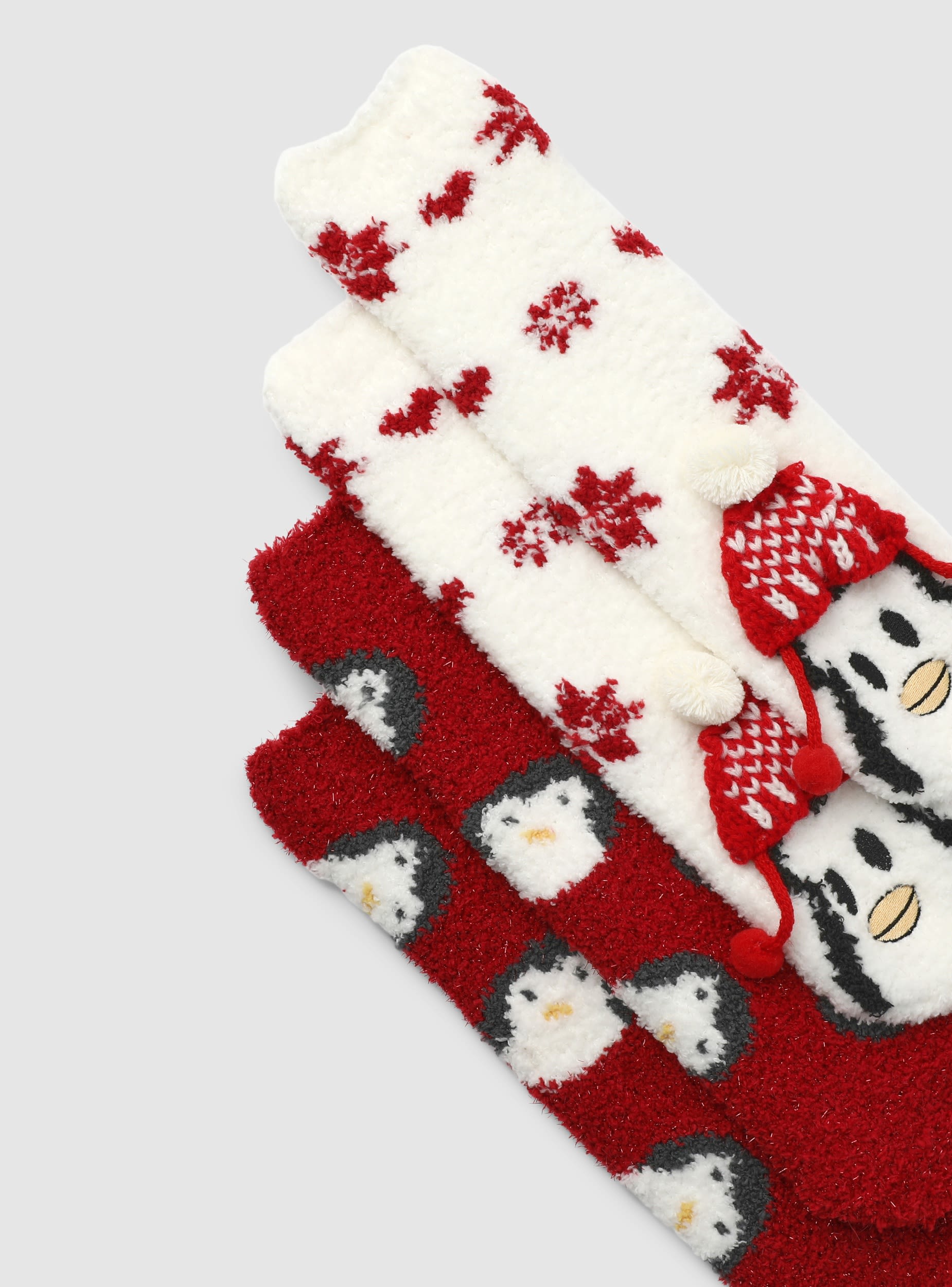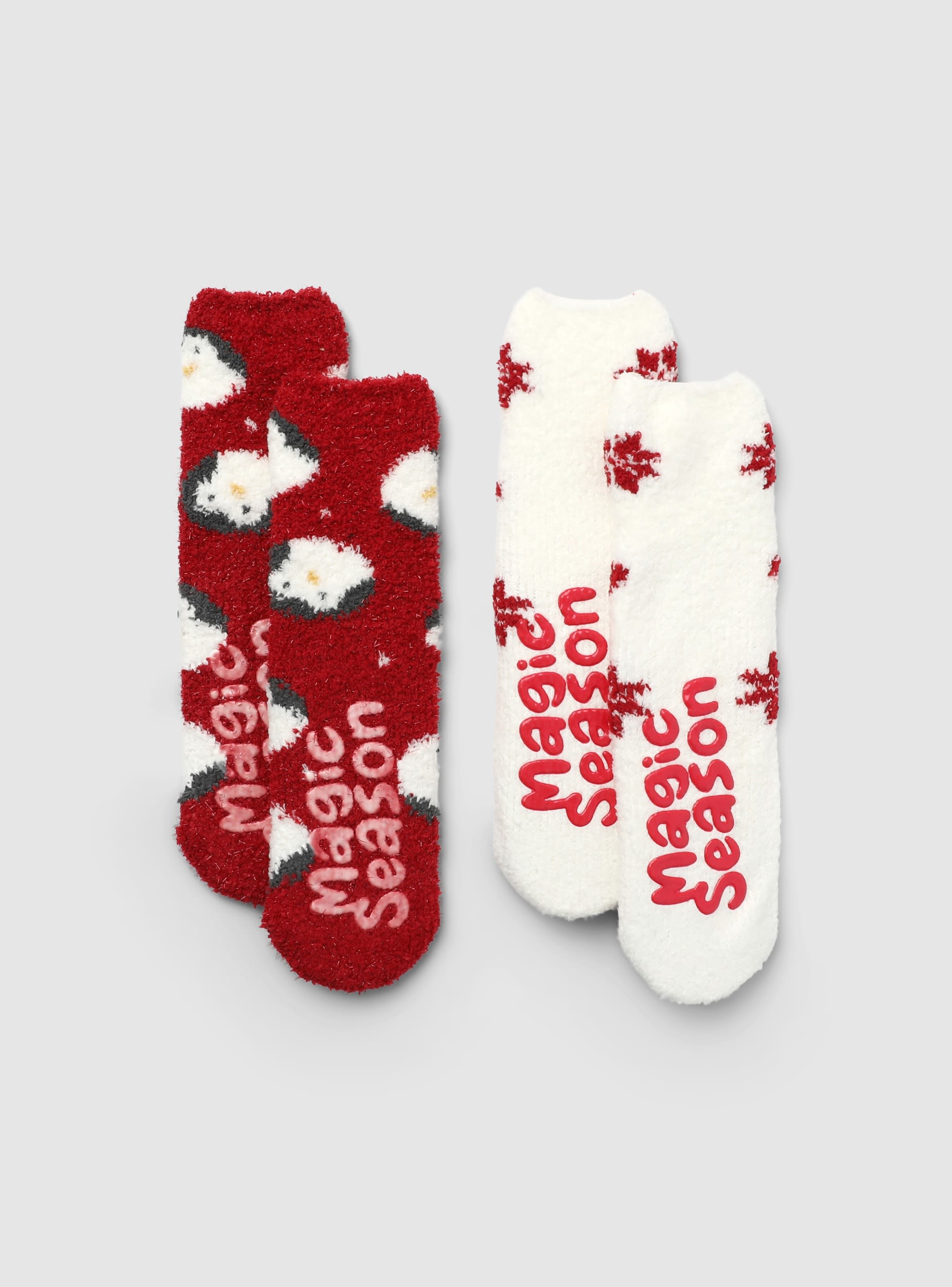 Confezione composta da 2 paia di calzini natalizi da donna, soffici, caldi e allegri. Entrambi i modelli sono caratterizzati da simpatiche fantasie ispirate al Natale, come pinguini e fiocchi di neve, con applicazioni tridimensionali che donano un tocco giocoso e originale. Realizzati in tessuto effetto peluche, sono estremamente morbidi al tatto e ideali per tenere i piedi al caldo durante i momenti di relax in casa. La suola è dotata di pratici inserti antiscivolo con scritta “Magic Season”, pensati per garantire stabilità e sicurezza su tutte le superfici. Perfetti anche come idea regalo, questi calzini uniscono stile, comfort e funzionalità in un unico accessorio che trasmette tutta l’atmosfera delle feste.