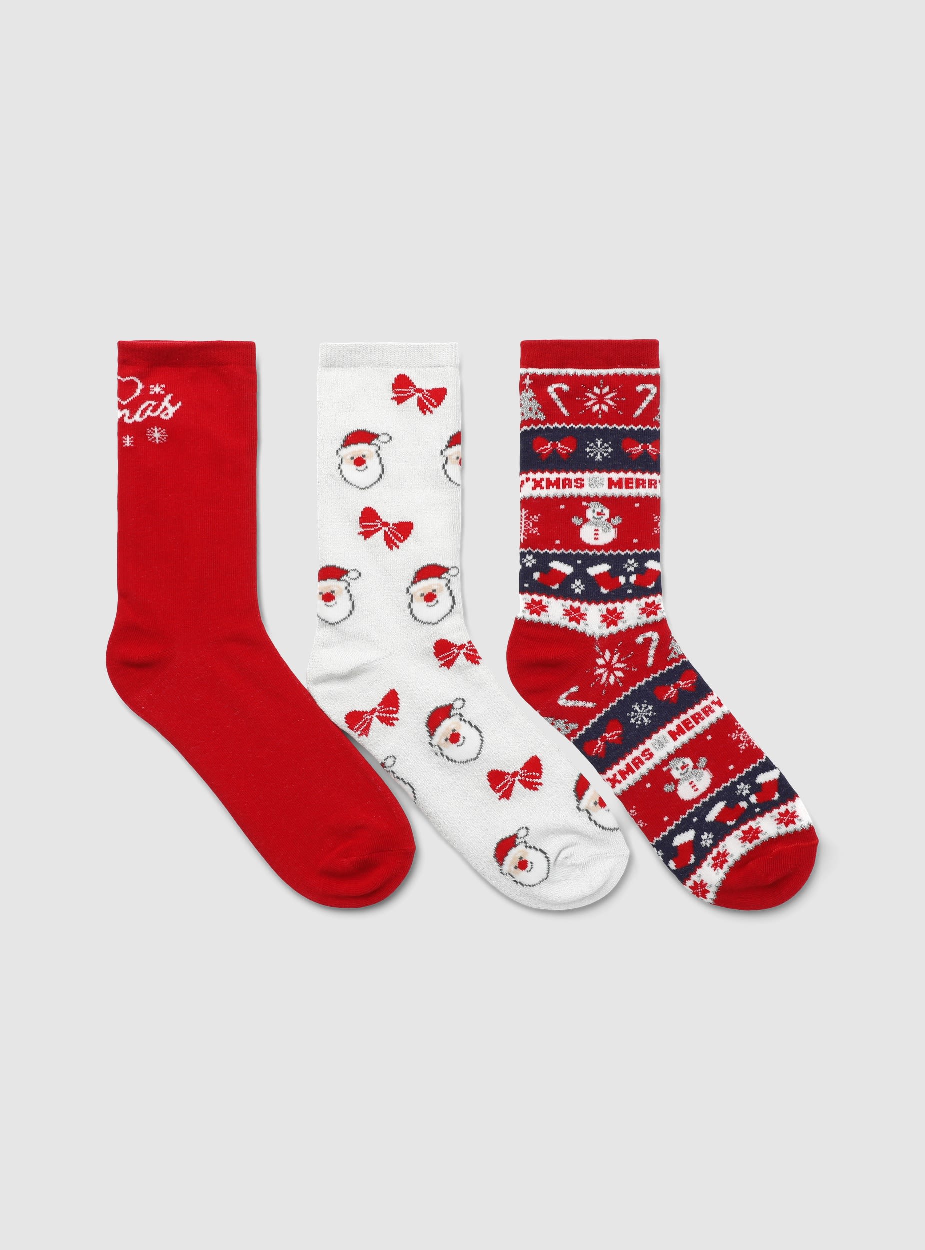 Calzini da donna perfetti per il periodo natalizio. Questo set include tre paia di calzini con fantasie diverse, ogni paio è decorato con un tema diverso, per accompagnare le tue giornate con un tocco di fantasia e magia natalizia. Ideali per aggiungere un tocco festivo ai tuoi outfit invernali, sono comodi e versatili, perfetti per essere indossati a casa o con scarpe chiuse. La vestibilità standard garantisce comfort per tutto il giorno.