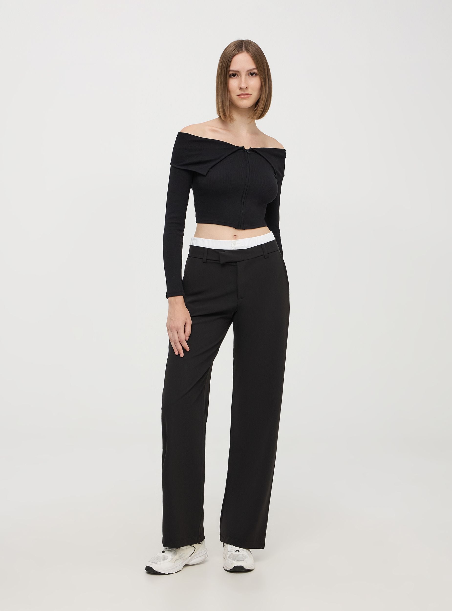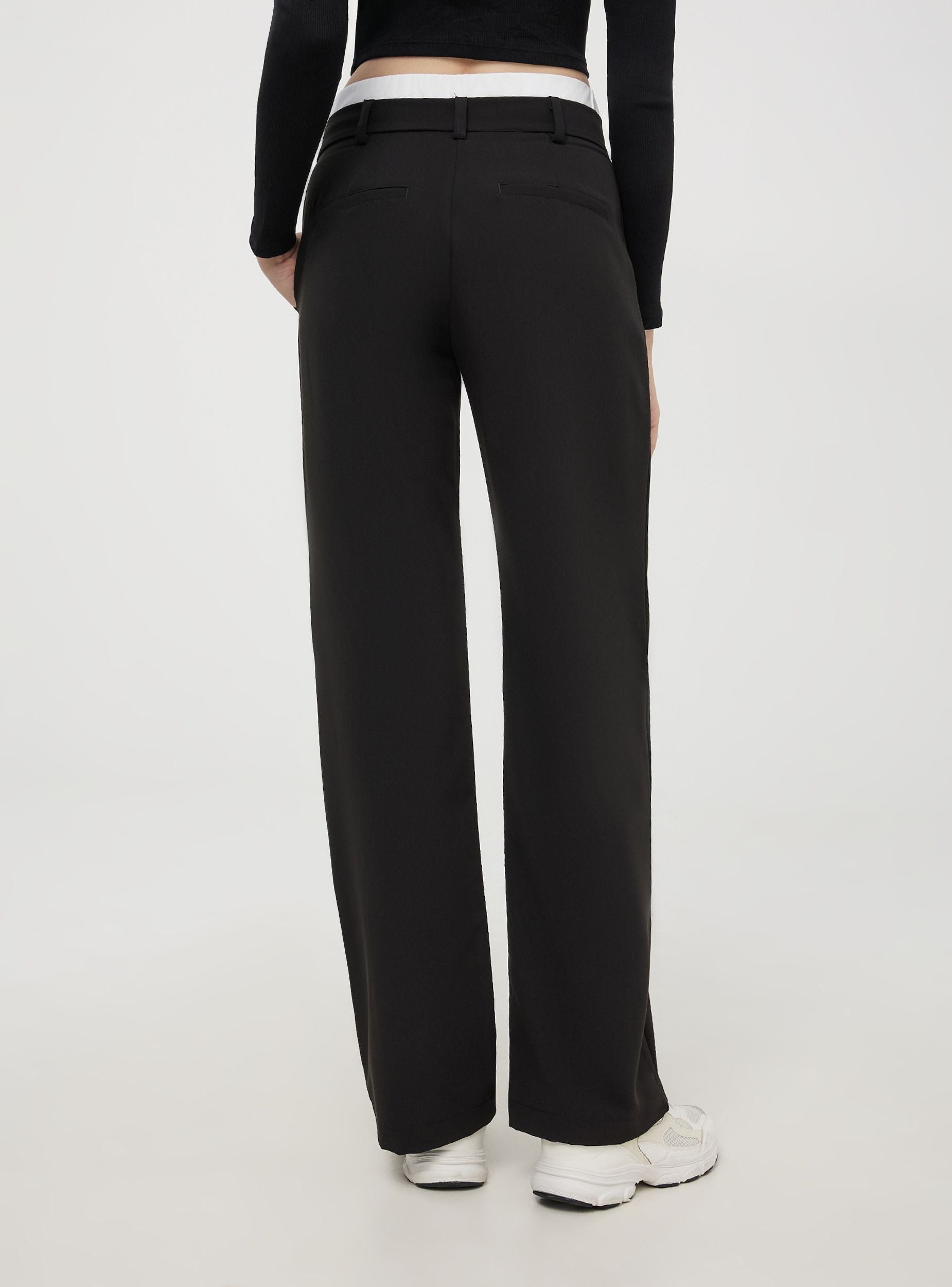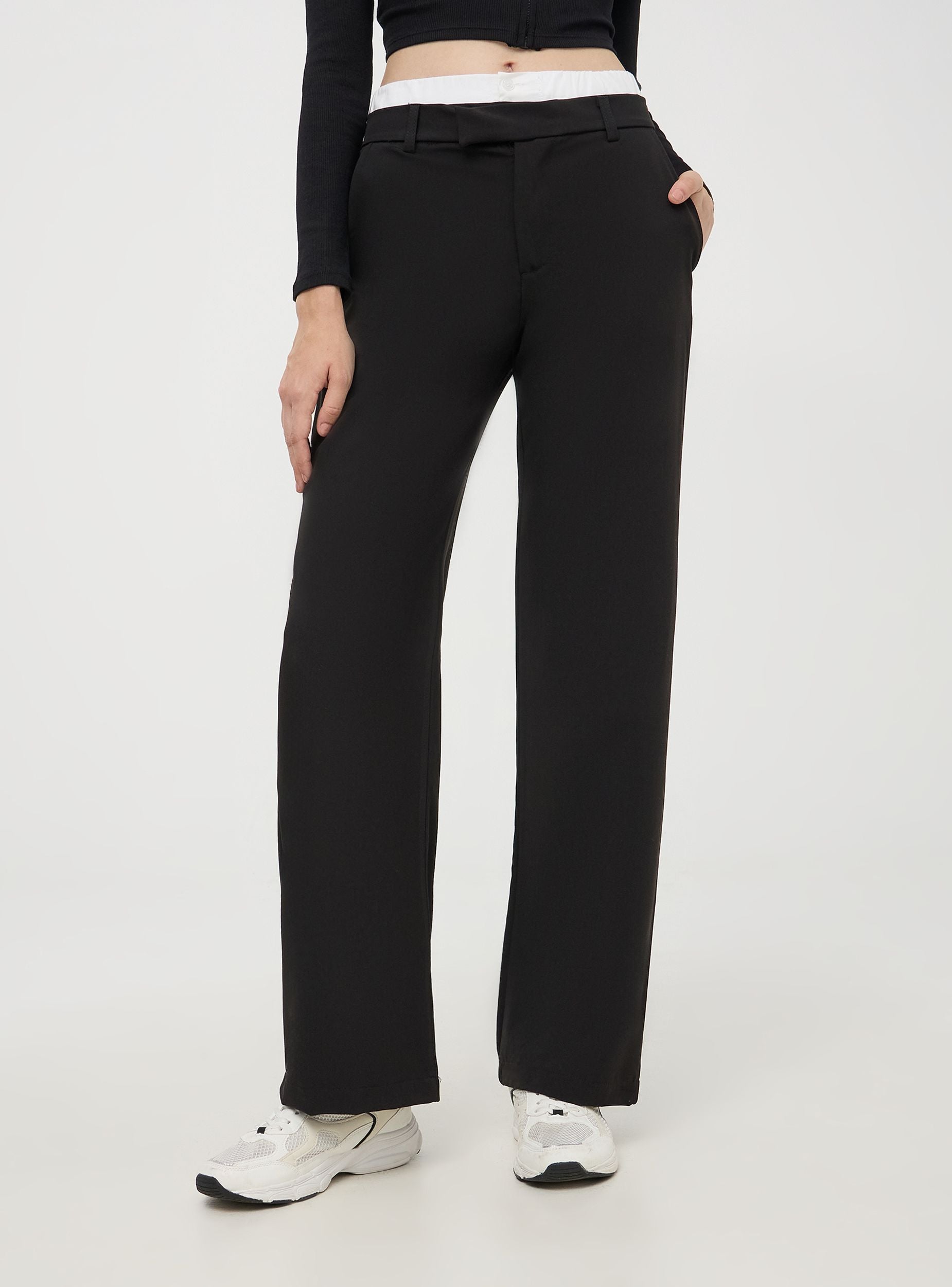 Pantaloni sartoriali da donna dal taglio elegante e moderno, caratterizzati da una vita in tessuto doppiato con effetto underwear a contrasto. Realizzati in tessuto poliviscosa a tinta unita, questi pantaloni offrono una vestibilità perfetta e un comfort eccezionale. La vita in tessuto doppiato crea un dettaglio distintivo e sofisticato. Presentano una chiusura con zip e bottone nascosti, passanti per cintura e tasche laterali alla francese, con cuciture precise e rifiniture curate. Questi pantaloni sono ideali per un look professionale e raffinato, perfetti per l'ufficio, riunioni di lavoro e eventi formali. La vita a contrasto con effetto underwear aggiunge un tocco di originalità e femminilità, rendendoli adatti anche per occasioni speciali e serate eleganti. Abbinabili a una camicia o un top aderente per valorizzare il dettaglio della vita e creare un outfit chic e contemporaneo.Dettagli