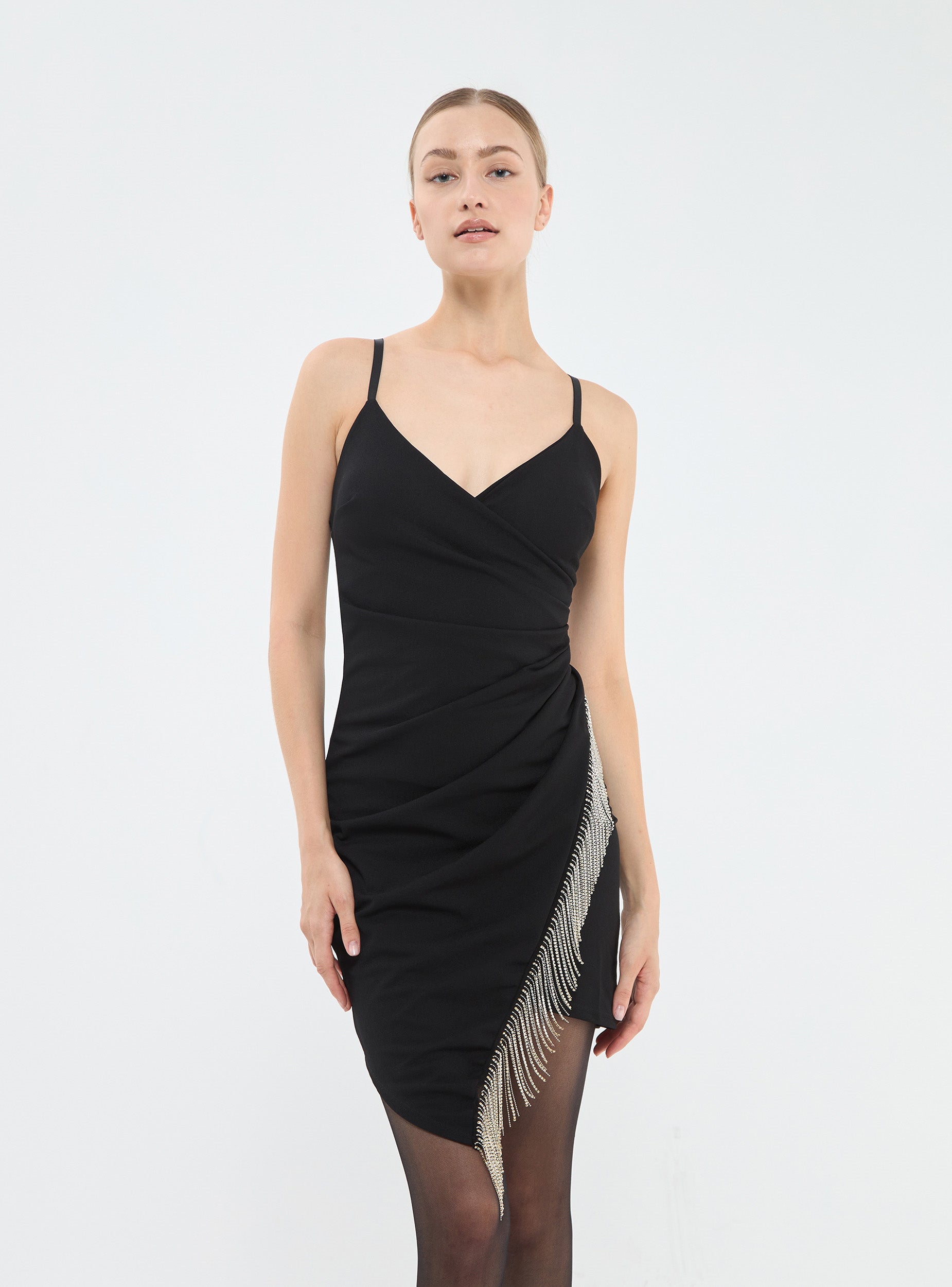 Vestito corto da donna , modello con spalline sottili , scollatura profonda e gonna con pannello sormontato arricchito preziose e scintillanti frange di strass