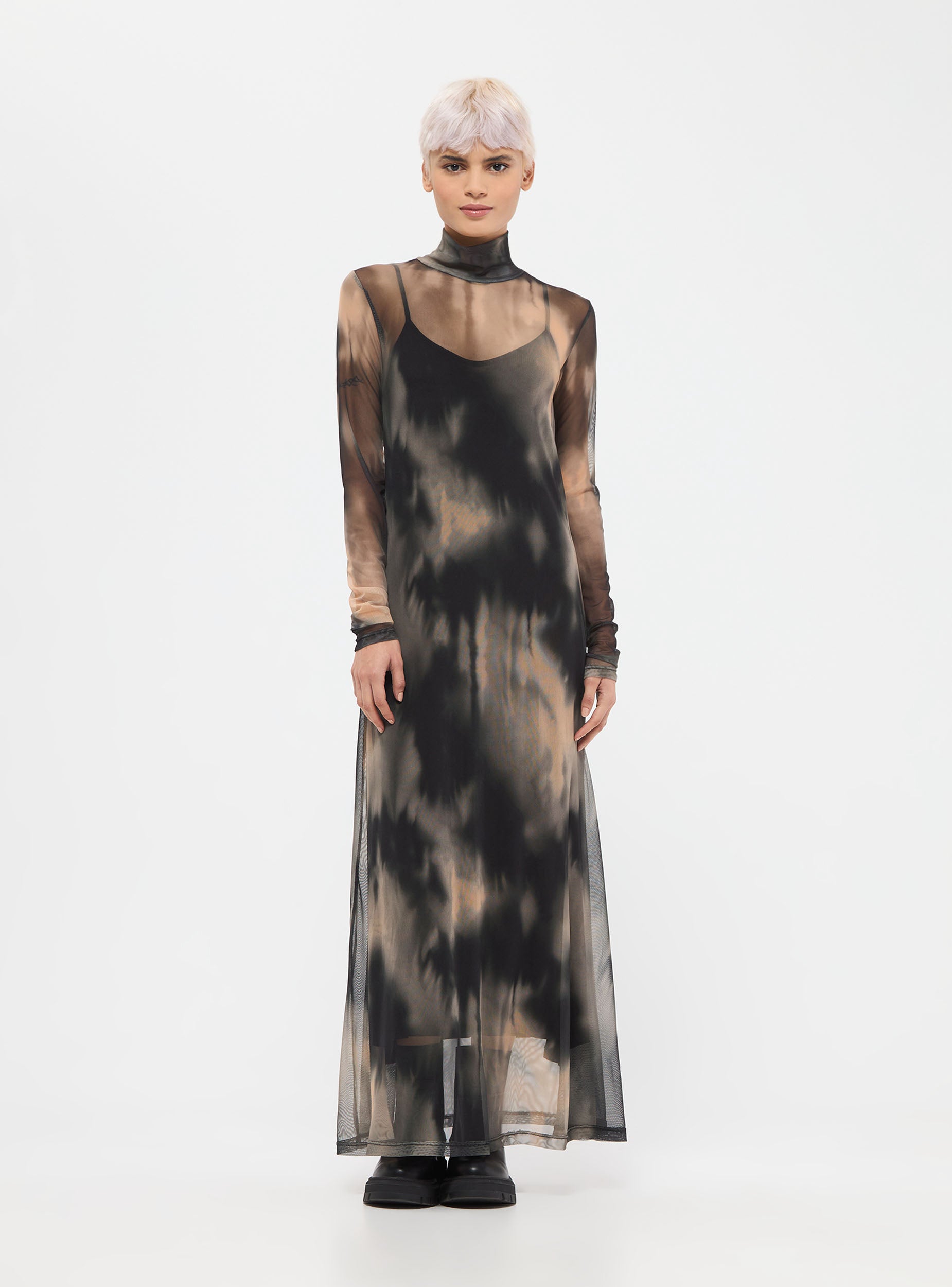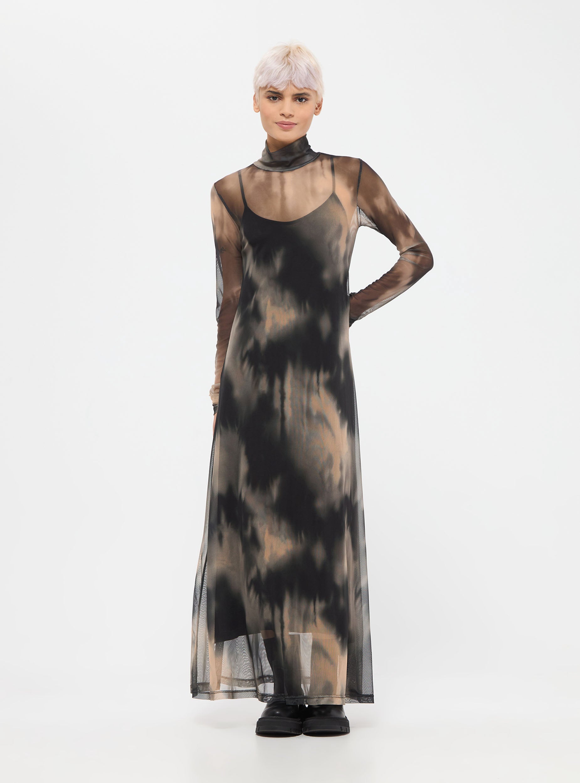 Vestito in tulle da donna con collo alto e maniche lunghe. Fantasia tie-dye. Fodera interna.